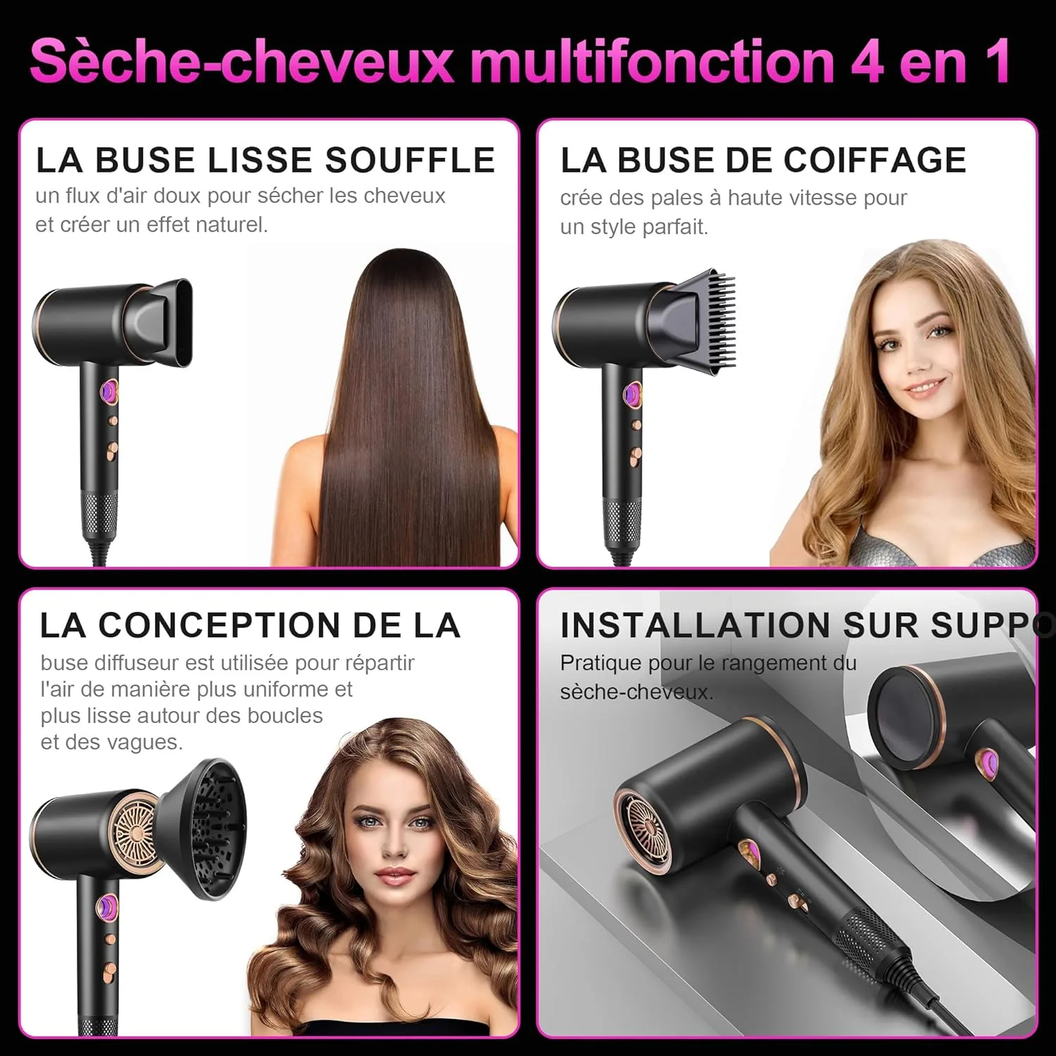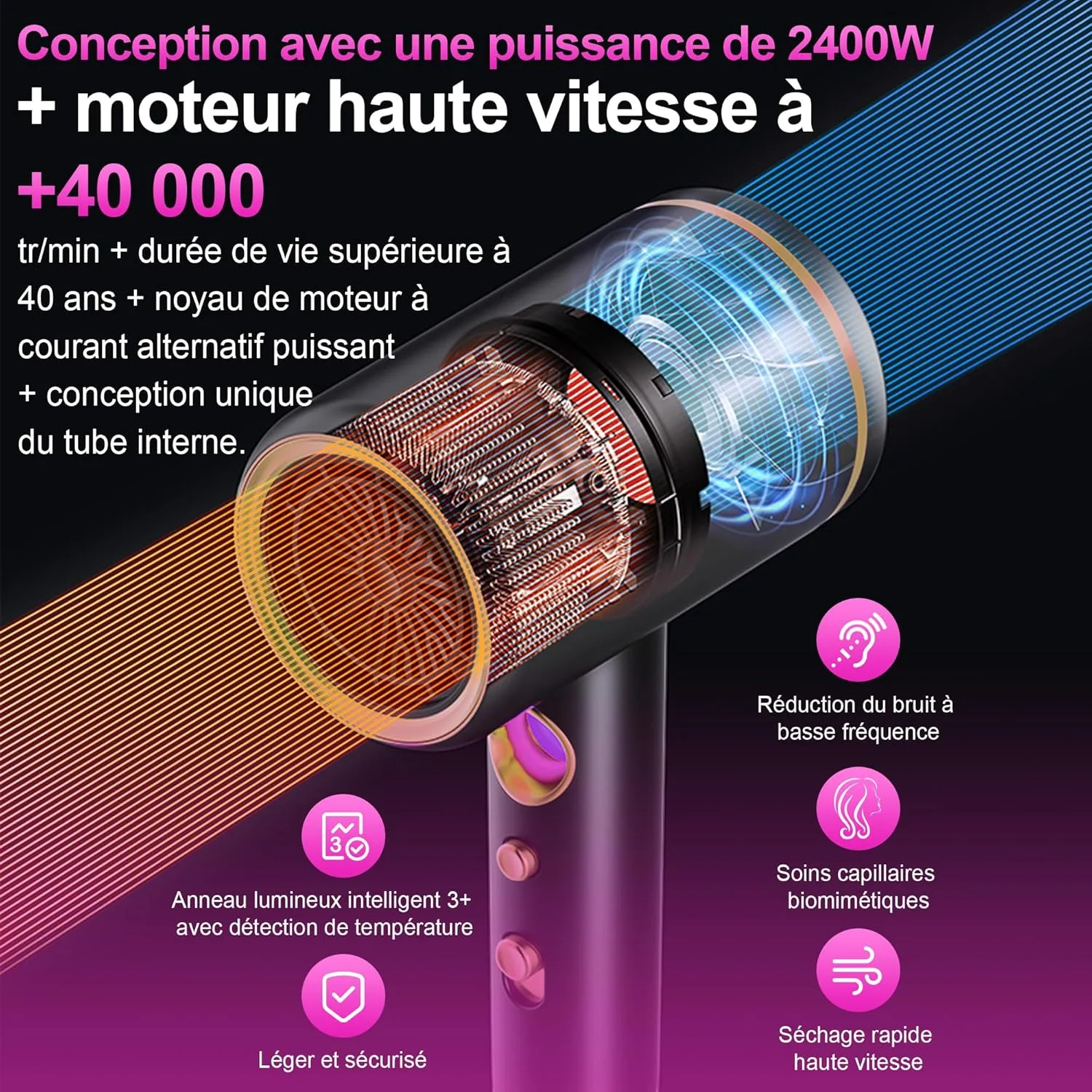 Este secador utiliza una potencia ultra fuerte de 2400 W para un secado rápido, alta concentración de iones negativos perfumados, temperatura constante inteligente que no daña el cabello. Cuenta con 3 ajustes de velocidad + modo de IA inteligente, cuidado del cabello con miles de millones de iones negativos, secado rápido y moldeador, efecto liso y sin encrespamiento, motor importado de alta velocidad con 40.000 rpm, reducción de ruido de baja frecuencia, cuidado biomimético del cabello y apertura inteligente para el sensor de temperatura 3+.