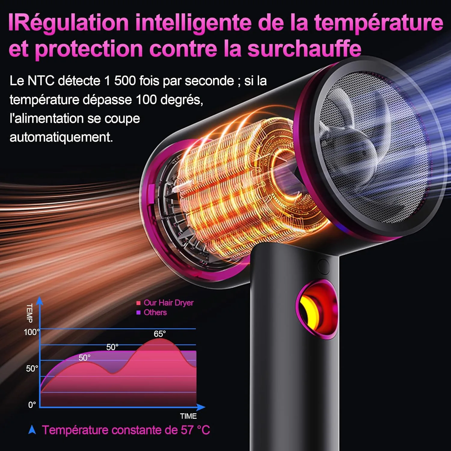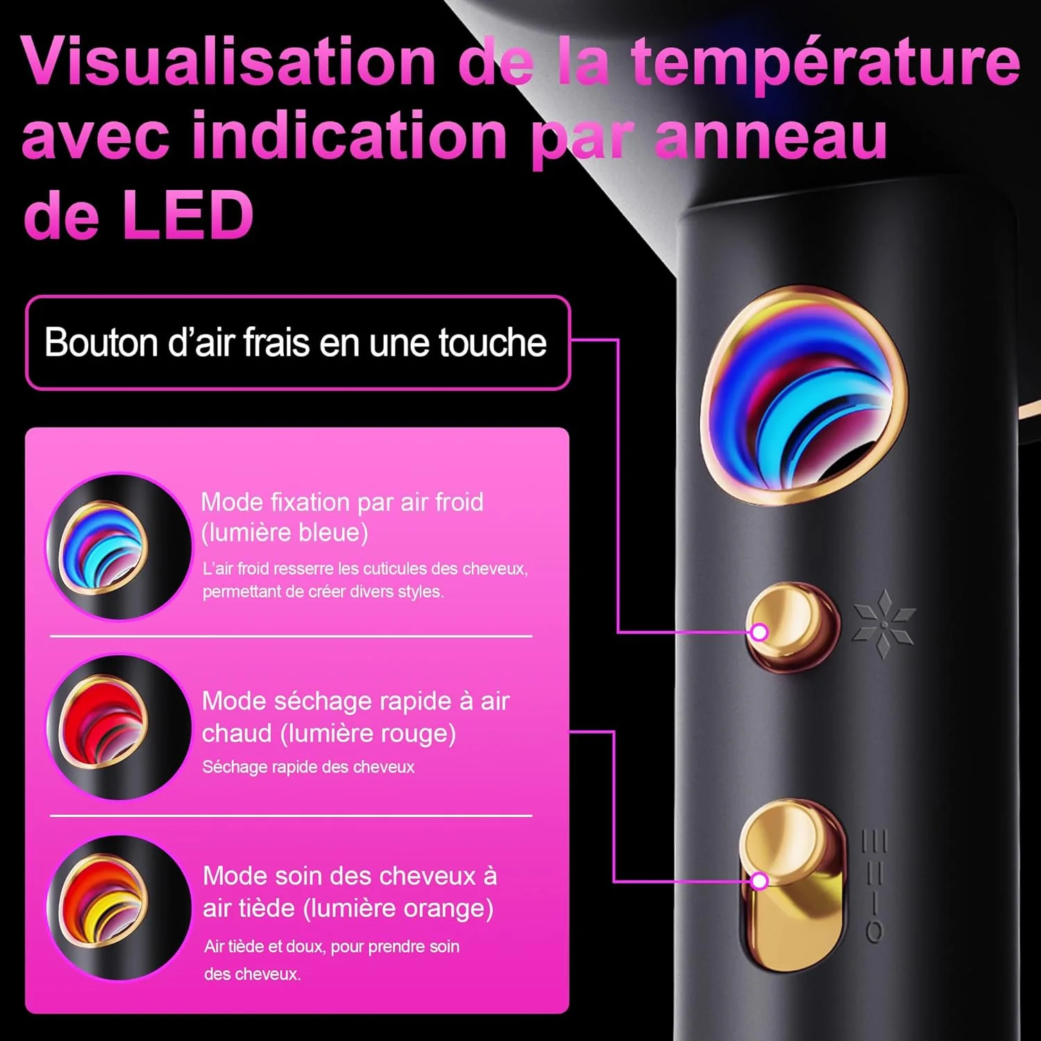 Este secador está constantemente en la parte superior de la lista de los más vendidos, gracias a la tecnología de doble flujo de aire, el motor con 40.000 revoluciones por minuto, fuertes vientos de huracán a 22 metros por segundo y una vida útil de más de 3000 horas. Cuenta con un anillo de luz LED para la indicación, diferentes temperaturas del aire para satisfacer las necesidades de todas las estaciones, un interruptor galvánico de alta calidad, y una vida útil más larga.