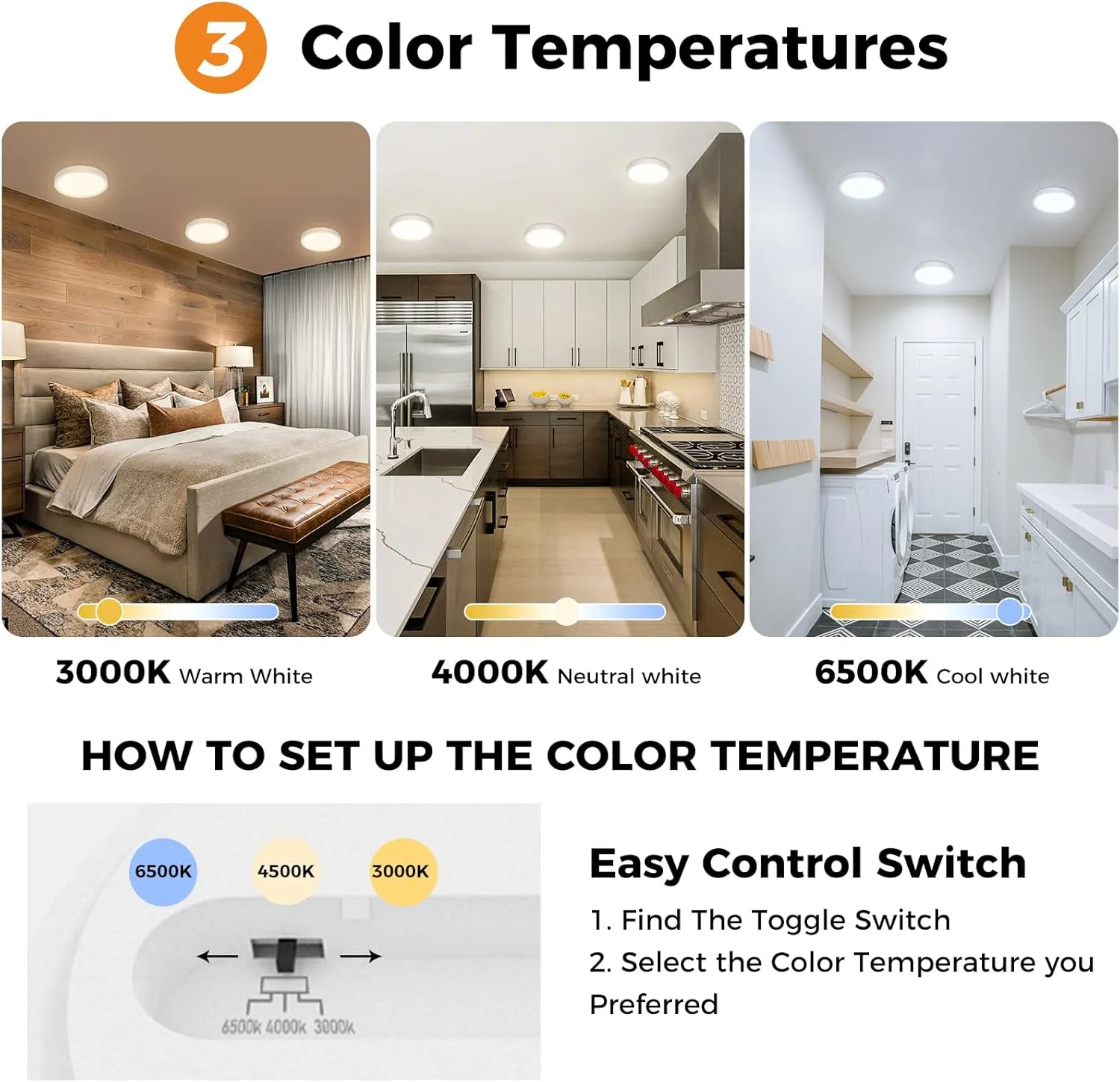 【3 colores para elegir】Plafón LED techo Slochi se ha actualizado a 3 colores en uno (blanco cálido 3000K,blanco natural 4000K,blanco luz día 6500K). Simplemente ajuste la temperatura del color usando el botón detrás de la luz. Elija la luz cálida como luz nocturna,que es conveniente para levantarse por la noche; luz fría para la habitación de los niños, la oficina en casa y el trabajo y el estudio.