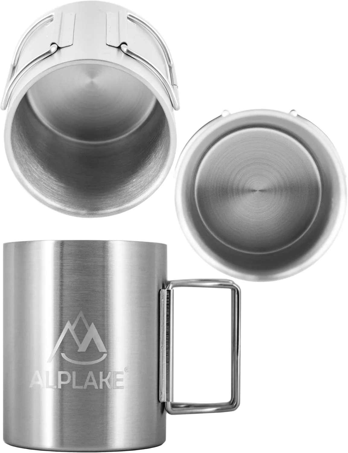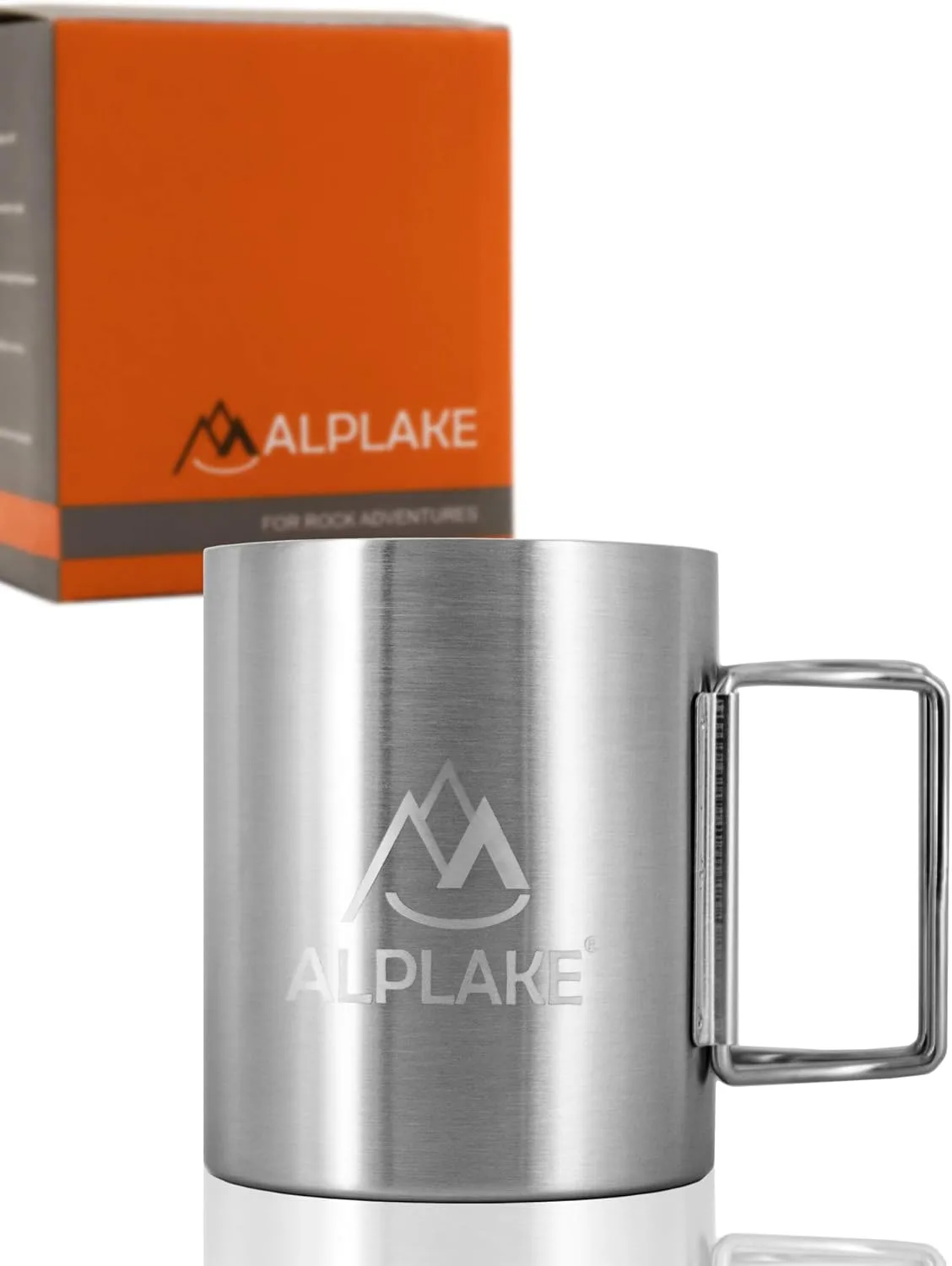 ALPLAKE – Taza de acero inoxidable con doble pared, 250 ml, con asa plegable – Taza térmica de doble pared, acero inoxidable, asa plegable de dos piezas – Asa plegable para ahorrar espacio en la mochila y el equipaje, para que la taza esté siempre contigo