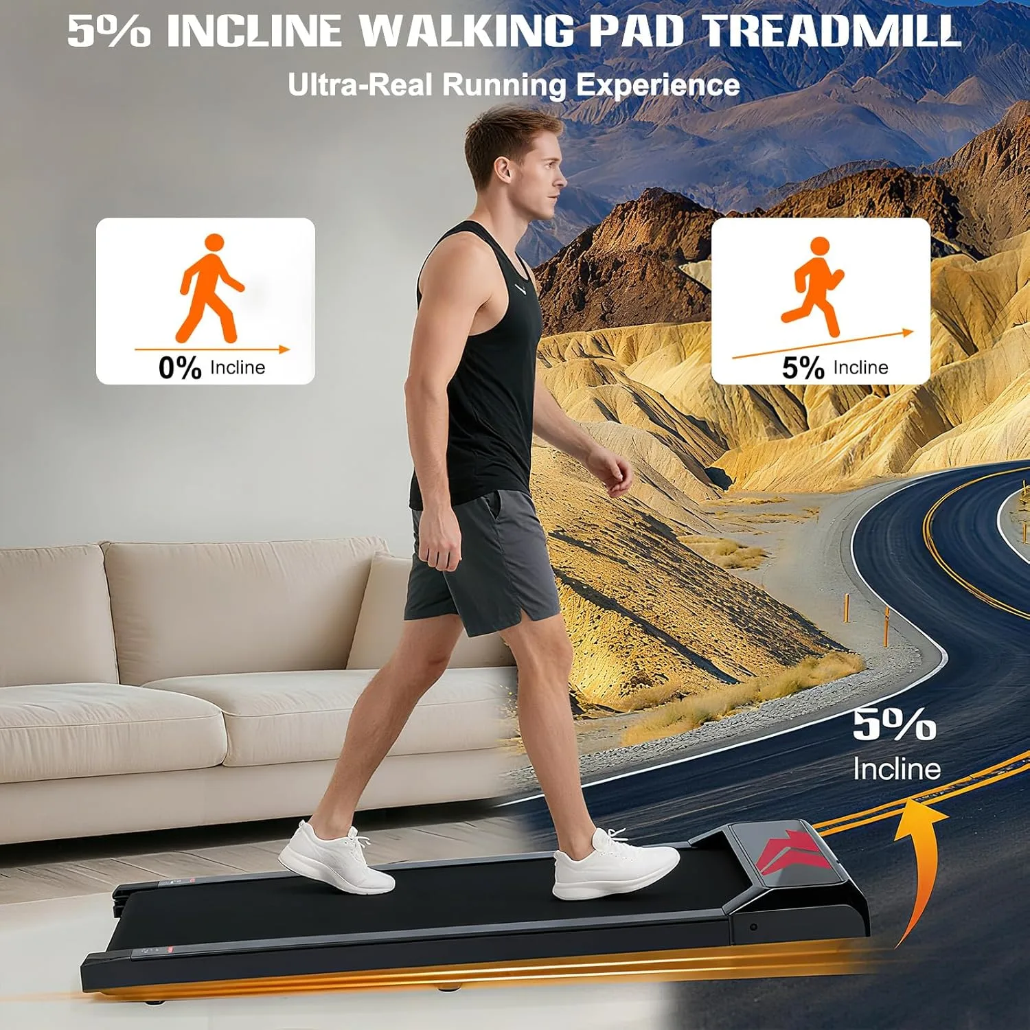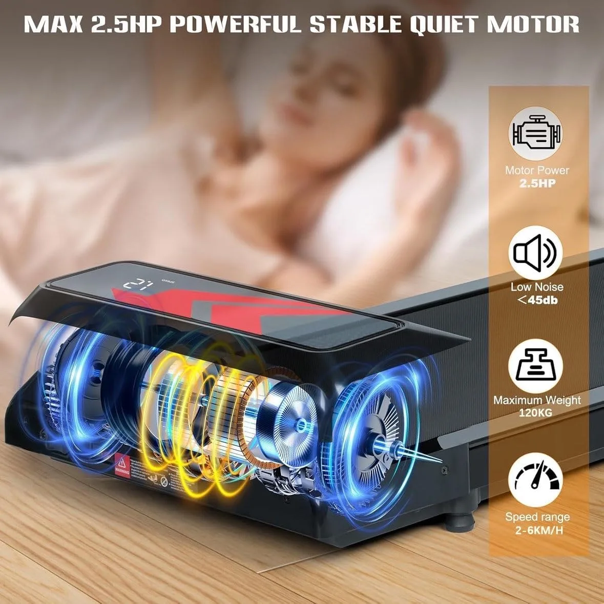 Motor Silencioso de 2.5 HP: Cinta de correr equipada con un motor silencioso de 2,5 CV (menos de 45 dB), esta cinta de andar para casa funciona sin molestar a la familia ni a los vecinos. Con una capacidad de peso de hasta 120 kg (265 lb), proporciona un apoyo seguro. Las velocidades ajustables de 2 a 6 km/h la hacen ideal para caminar, trotar o correr en casa, en la oficina o en el apartamento. Fácil Almacenamiento: Esta cinta de correr compacta es más pequeña y ligera que los modelos tradicionales, con unas dimensiones de 110 x 47 x 11 cm y un peso de solo 13 kg, sin necesidad de montaje. La caminadora electrica para casa cabe debajo de sofás, camas o escritorios, o se puede guardar en vertical para ahorrar espacio. Amortiguación y Antideslizante: Cuenta con una cinta de correr antideslizante y amortiguadora de 5 capas y 8 amortiguadores de silicona para absorber los impactos, proteger las rodillas, reducir el ruido y las vibraciones, lo que proporciona una experiencia de entrenamiento más silenciosa y una excelente protección de las articulaciones. Ideal para uso doméstico o en la oficina. 5% Inclinación Cinta De Correr: El ajuste manual de la inclinación (0-5 %) permite una adaptación precisa a diferentes intensidades de entrenamiento. Simula de forma realista diversos terrenos inclinados, lo que aumenta la quema de grasa en un 40 % y mejora la resistencia cardiovascular. Camine o trote durante las horas de trabajo, haciendo ejercicio directamente en su escritorio. Pantalla Led Y Mando A Distancia: La pantalla LED de la cinta de correr registra el tiempo, la velocidad, las calorías quemadas y la distancia para controlar el entrenamiento sin esfuerzo. El mando a distancia permite ajustar cómodamente la velocidad y detener el dispositivo. La cinta de andar para casa también se conecta por Bluetooth a otras aplicaciones de fitness.