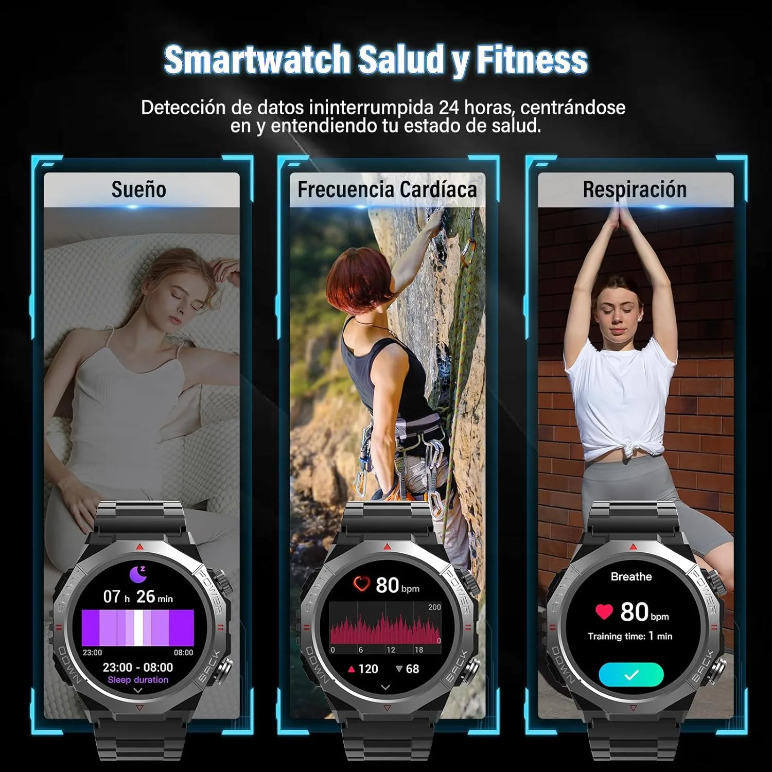 Monitoreo de salud: El reloj con llamada cuenta con funciones de monitoreo del sueño, monitoreo de la frecuencia cardíaca y podómetro, que registran tus datos corporales. Los datos de salud recopilados por el reloj deportivo hombre son solo para referencia diaria y no se pueden utilizar con fines médicos. El smart watch podómetro puede ayudarte a comprender mejor tu condición física y ajustar tus hábitos a tiempo según los datos de salud.