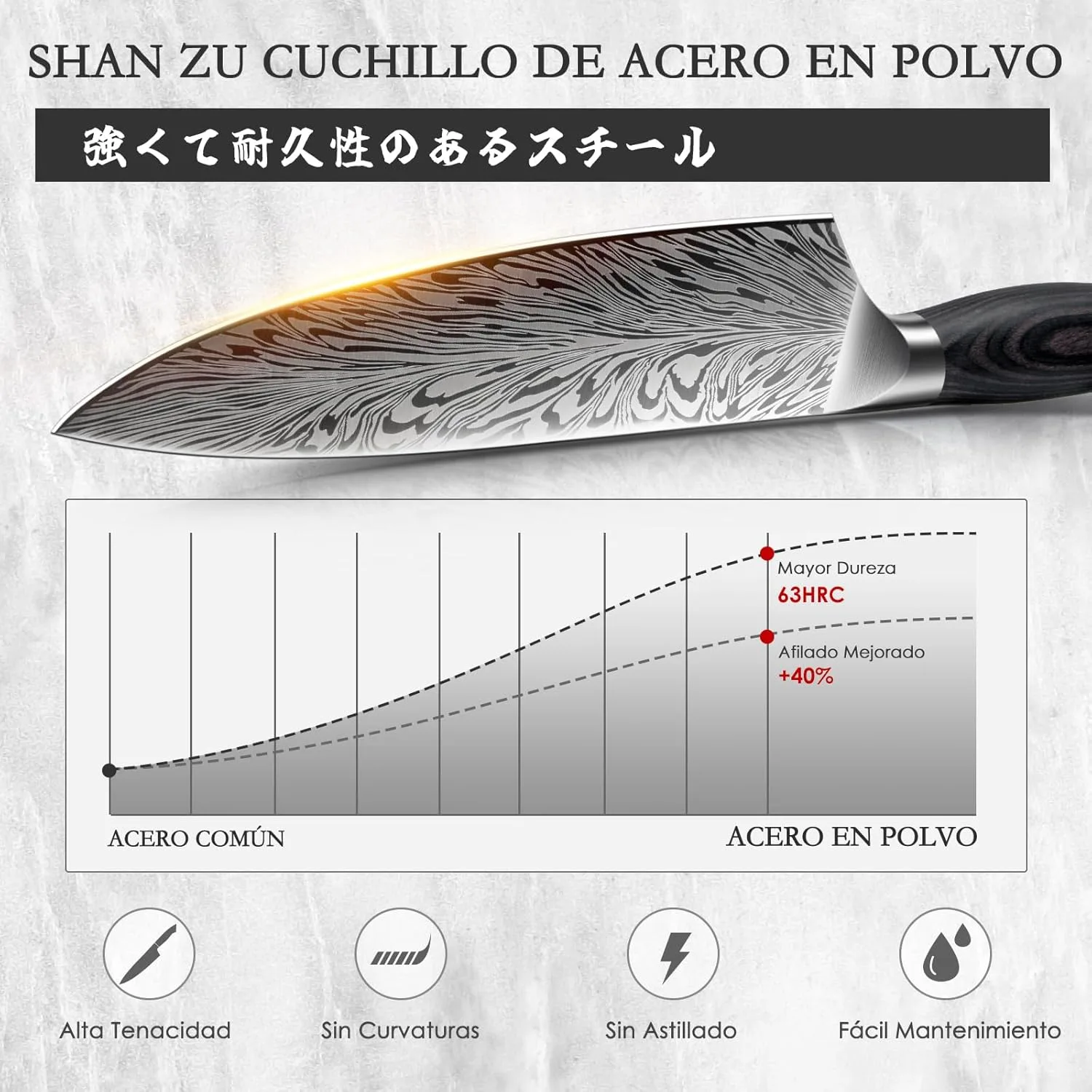 【Cuchillo de Cocina de Acero en Polvo】El set cuchillo de cocina SHAN ZU está hecho de acero en polvo japonés con alto contenido de carbono con una dureza de 63HRC, que es más duro que el 99% de los aceros ordinarios, y procesado con tecnología metalúrgica avanzada. Obtendrá un set de cuchillo de chef excepcional.