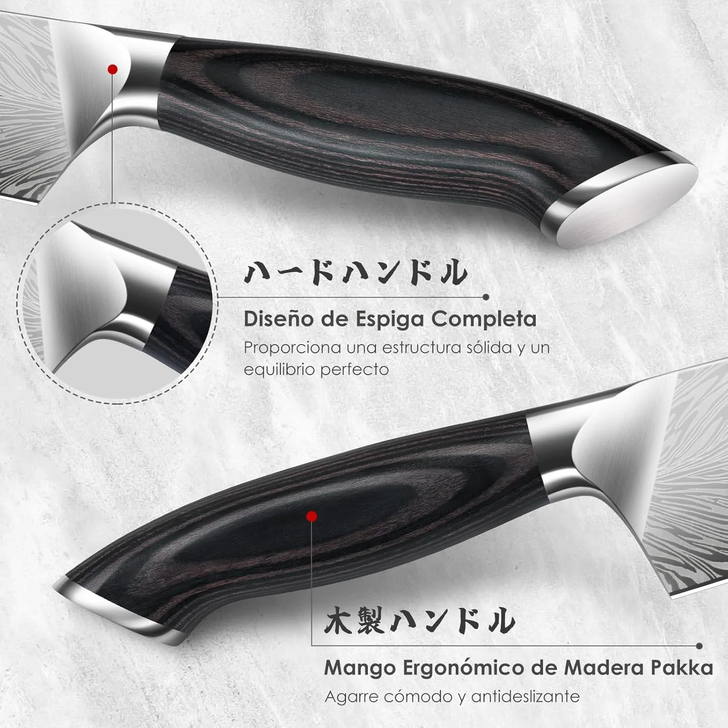 【Patrón Grabado con Láser de Moda】Este cuchillo de cocina profesional presenta un diseño que combina la estética tradicional con elementos modernos. El grabado de un patrón de textura elegante en la superficie de la hoja con láser hace que el cuchillo de chef luzca más avanzado y moderno. NOTA: ESTE NO ES UN CUCHILLO DE COCINA DE DAMASCO.
