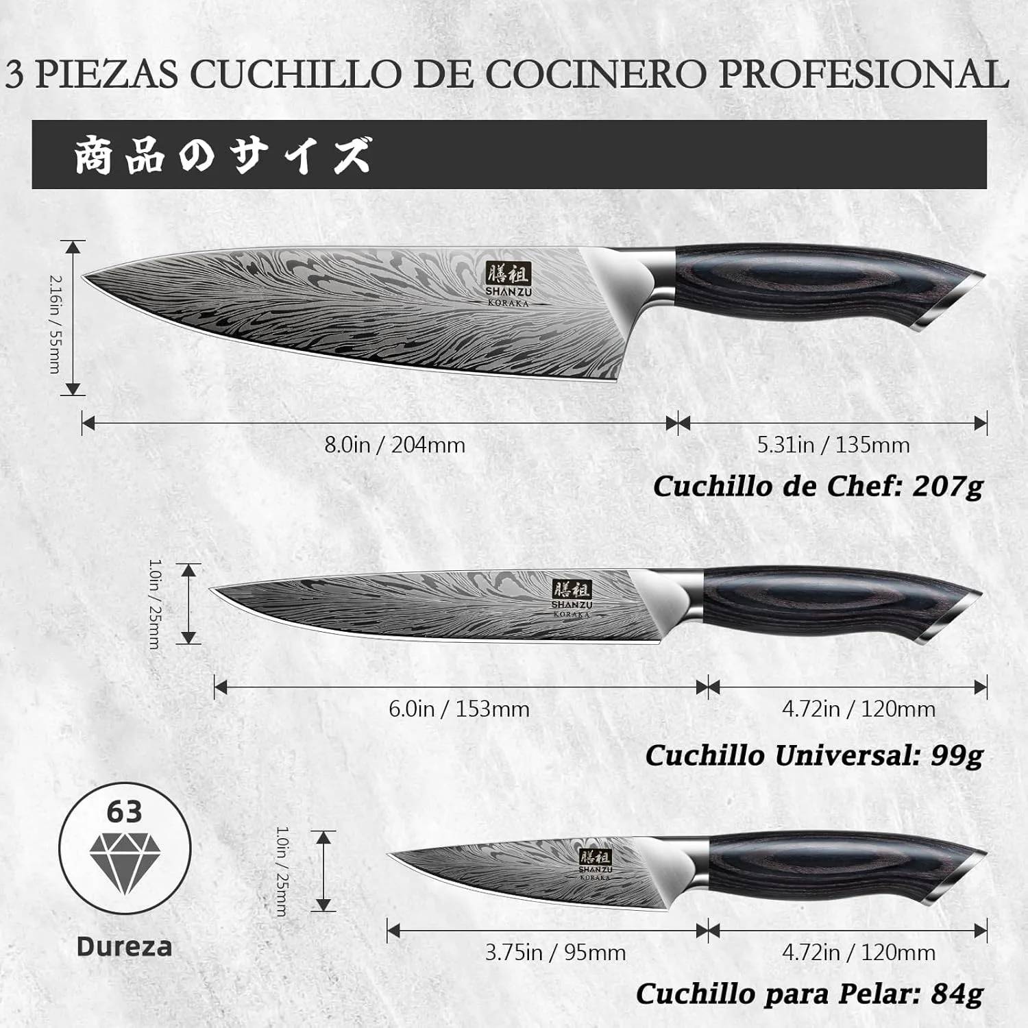 Resumen del producto: SHAN ZU Set de Cuchillos de Cocina de Acero en Polvo, 3 Piezas Juego de Cuchillos de Cocina Súper Afilado y Duro, Mango de Madera Ergonómico, Cuchillo de Chef, Cuchillo Universal y Cuchillo de Pelar