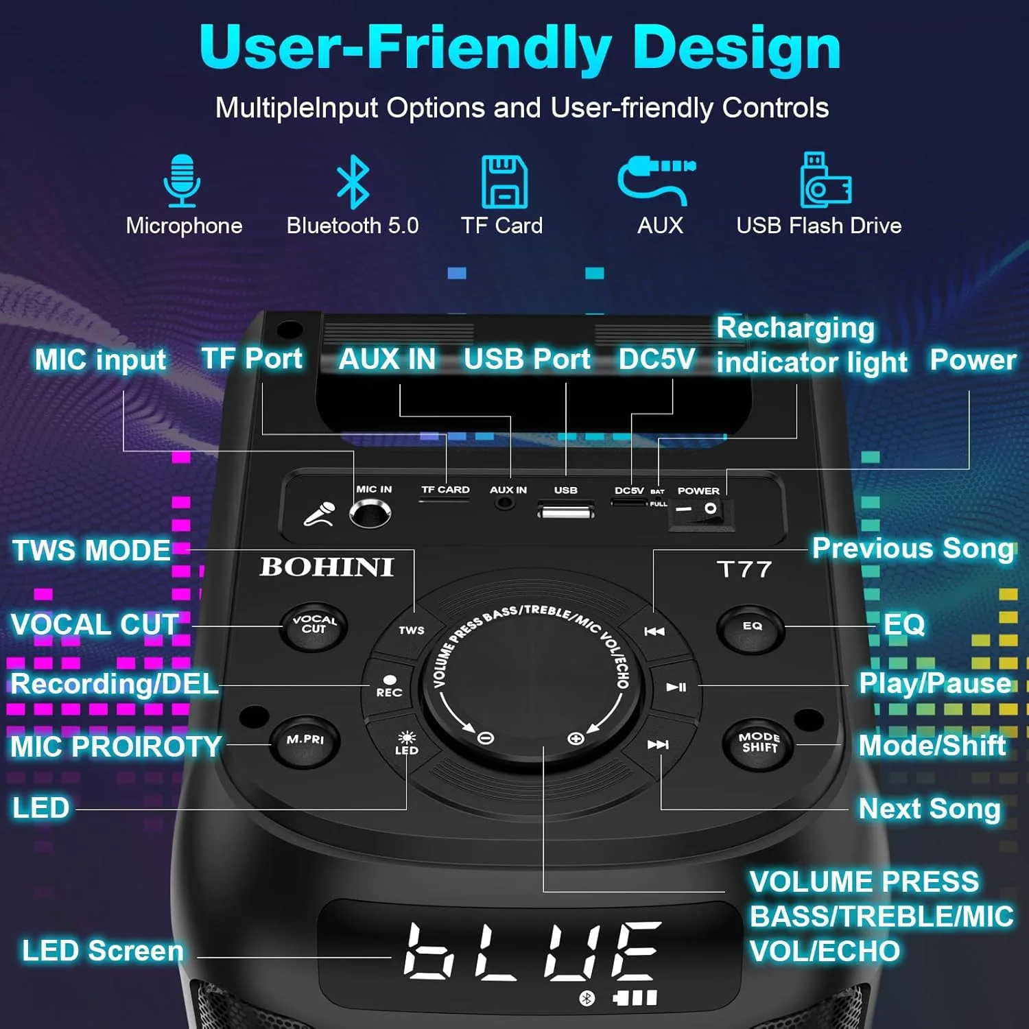 ♫ Altavoz para Fiestas con Luces Dinámicas: El diseño elegante del altavoz Bluetooth T77 no solo sorprende por su sonido, sino también por su espectáculo de luces innovador. Las luces dinámicas se sincronizan con el ritmo, creando un ambiente festivo vibrante. Combina iluminación impactante con sonido de alta calidad para una experiencia visual y auditiva única.