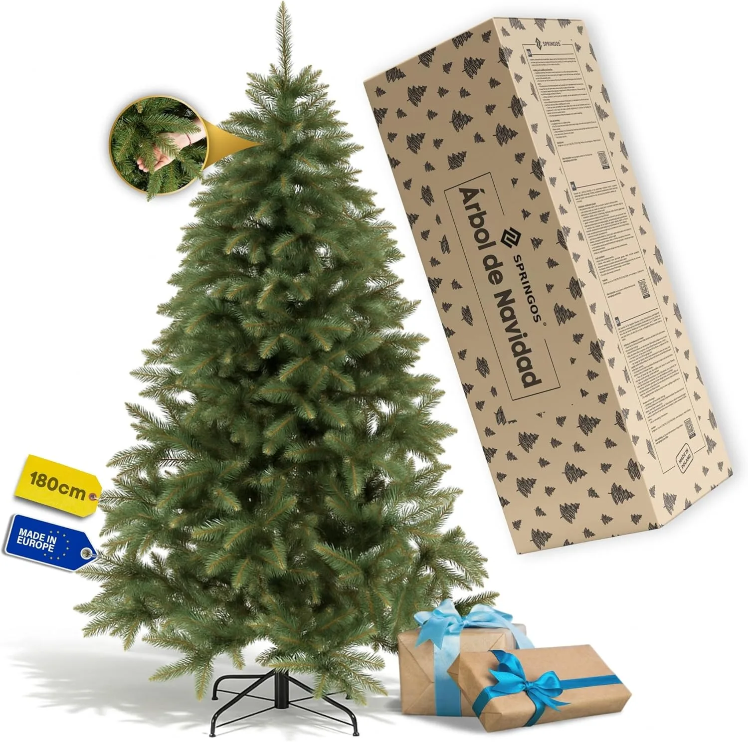 De SPRINGOS EL CORAZÓN DE LA NAVIDAD: El árbol de Navidad SPRINGOS reproduce a la perfección el abeto natural del Cáucaso y se convierte en el rey de la temporada navideña. Casi como si viniera del bosque. ÁRBOL DE NAVIDAD CON AGUJAS: el abeto del Cáucaso de 180 cm de altura impresiona por su aspecto realista y su hermoso vestido de agujas. Seductor árbol de Navidad con sus características ramas densas fabricadas con precisión. ALTA CALIDAD: La singularidad de nuestros árboles de Navidad se expresa en la más alta calidad de elaboración y en la fiel reproducción de coníferas reales. Un árbol de Navidad artificial con la típica forma de cono, que con sus densas y verdes ramas es una impresionante decoración navideña. MONTAJE: El árbol de Navidad se monta mediante un sencillo sistema de encaje, en el que basta con insertar una pieza en la otra. Así se crean las distintas «capas» del árbol de Navidad. Para que nuestro árbol de Navidad tenga un aspecto más bonito y elegante, se incluye un soporte con cada árbol. DETALLES: Árbol de Navidad artificial fabricado en la UE, representación artificial de un abeto del Cáucaso, altura 180 cm, apertura según la disposición de las ramas hasta 100 cm, color: verde, agujas de PVC, soporte incluido.
