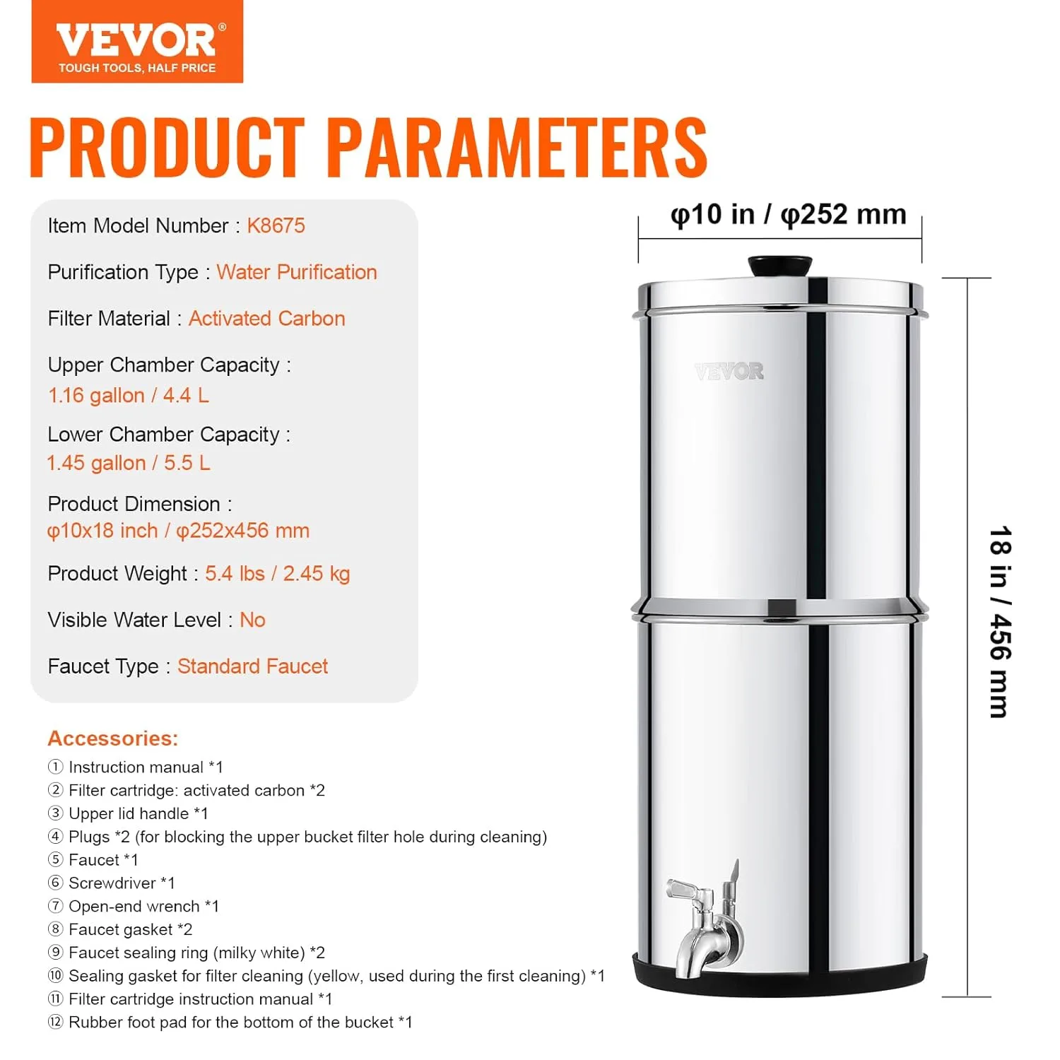 Resumen del producto: VEVOR Sistema de Filtración de Agua por Gravedad 5,5 L Filtro de Agua por Gravedad para Encimera Acero Inoxidable 304 Reduce Plomo y hasta 99% de Cloro con 2 Filtros de Carbón y Grifo para Hogar