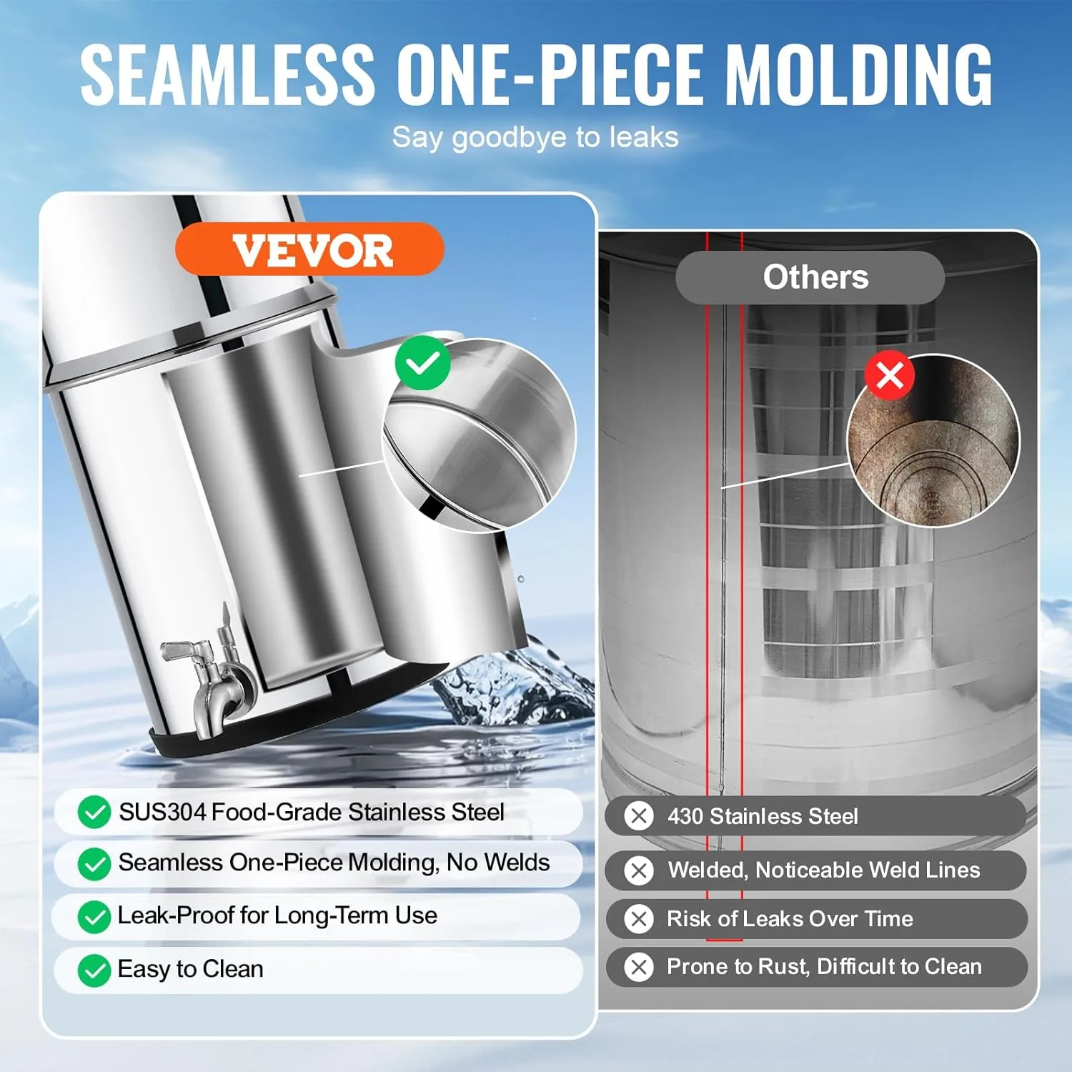 Durabilidad y resistencia: Hecho de acero inoxidable SUS304 de calidad alimentaria, el cilindro sin costuras es resistente y duradero. La ausencia de soldaduras o fugas en el sistema de filtración de agua reduce significativamente el riesgo de fugas de agua.