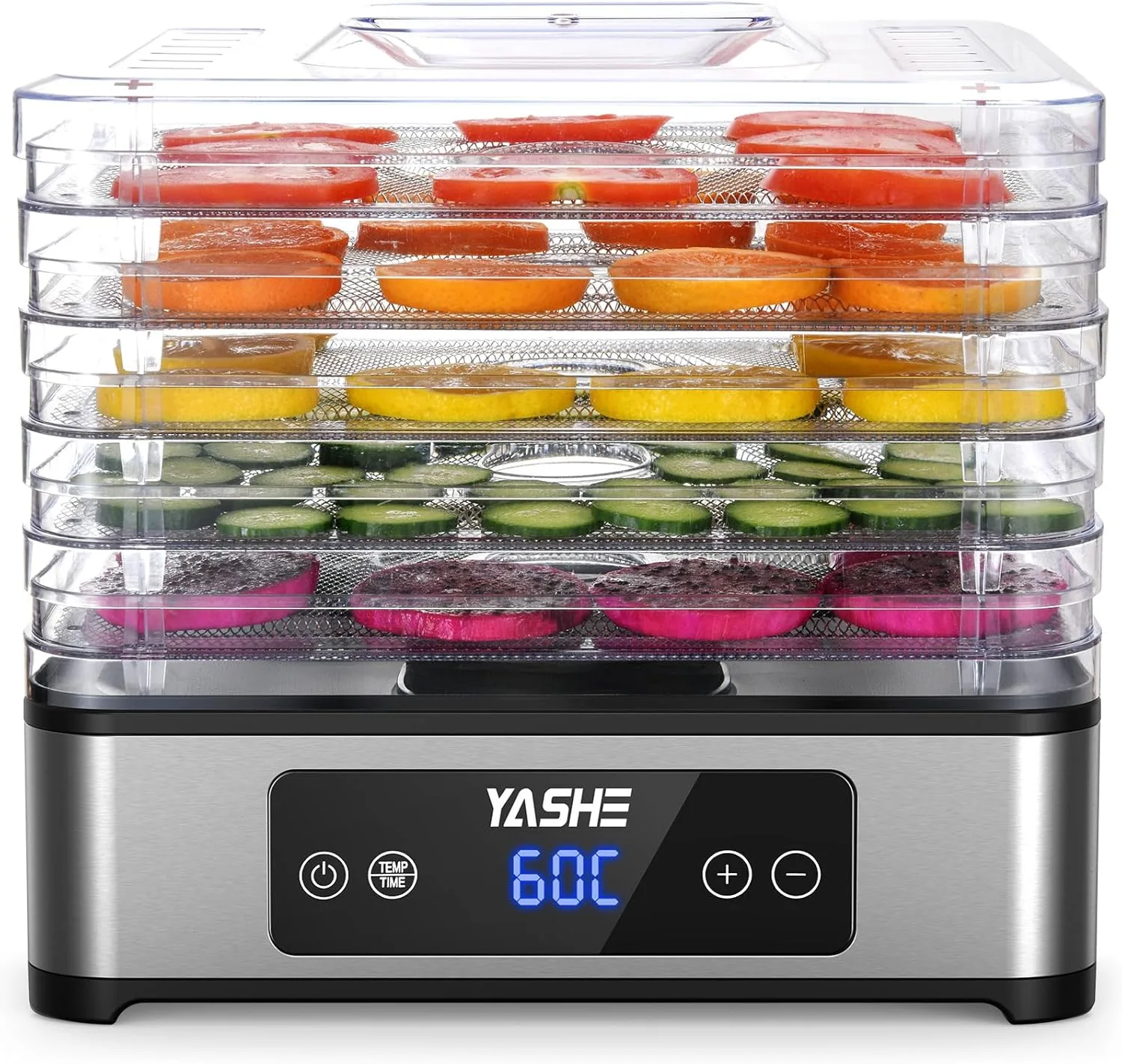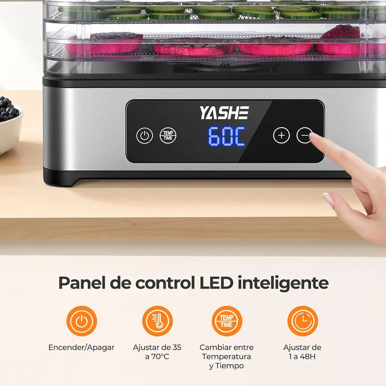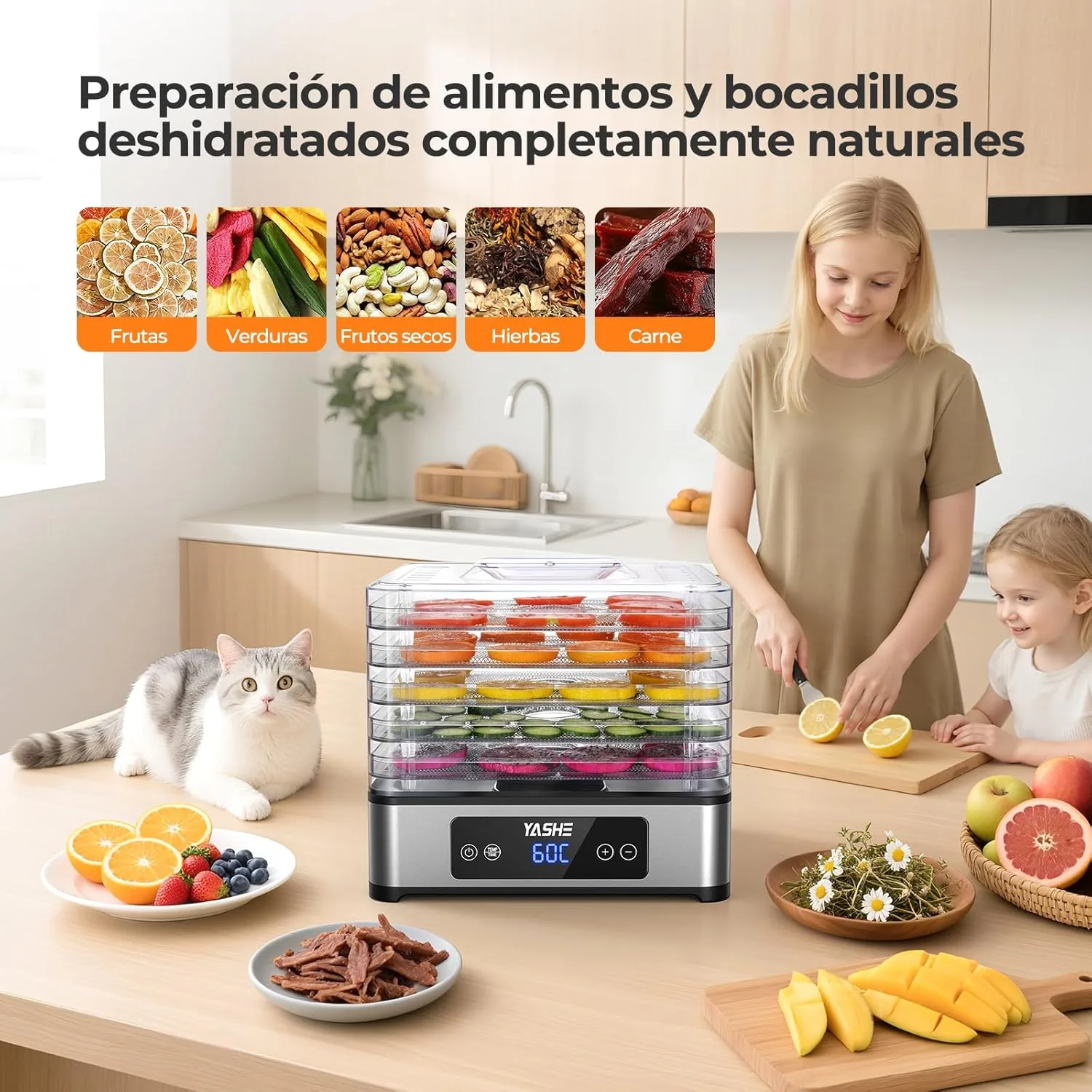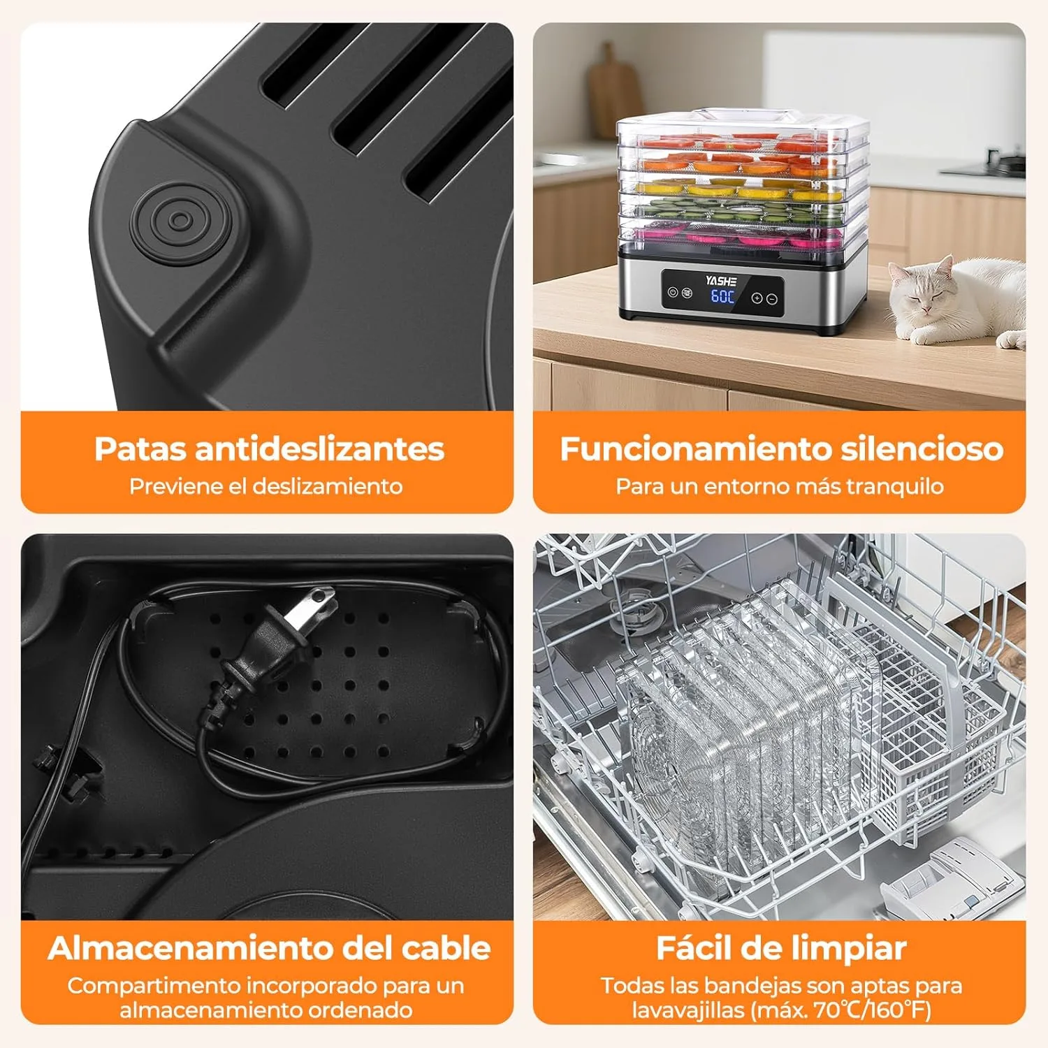 Desde que compré este deshidratador de alimentos, preparar snacks saludables en casa se ha vuelto facilísimo. Las 5 bandejas de acero inoxidable son resistentes, ligeras y muy fáciles de limpiar, incluso en el lavavajillas. Me encanta poder ajustar la temperatura y el temporizador según lo que esté secando, ya sean frutas, verduras, hierbas o incluso carne para cecina.