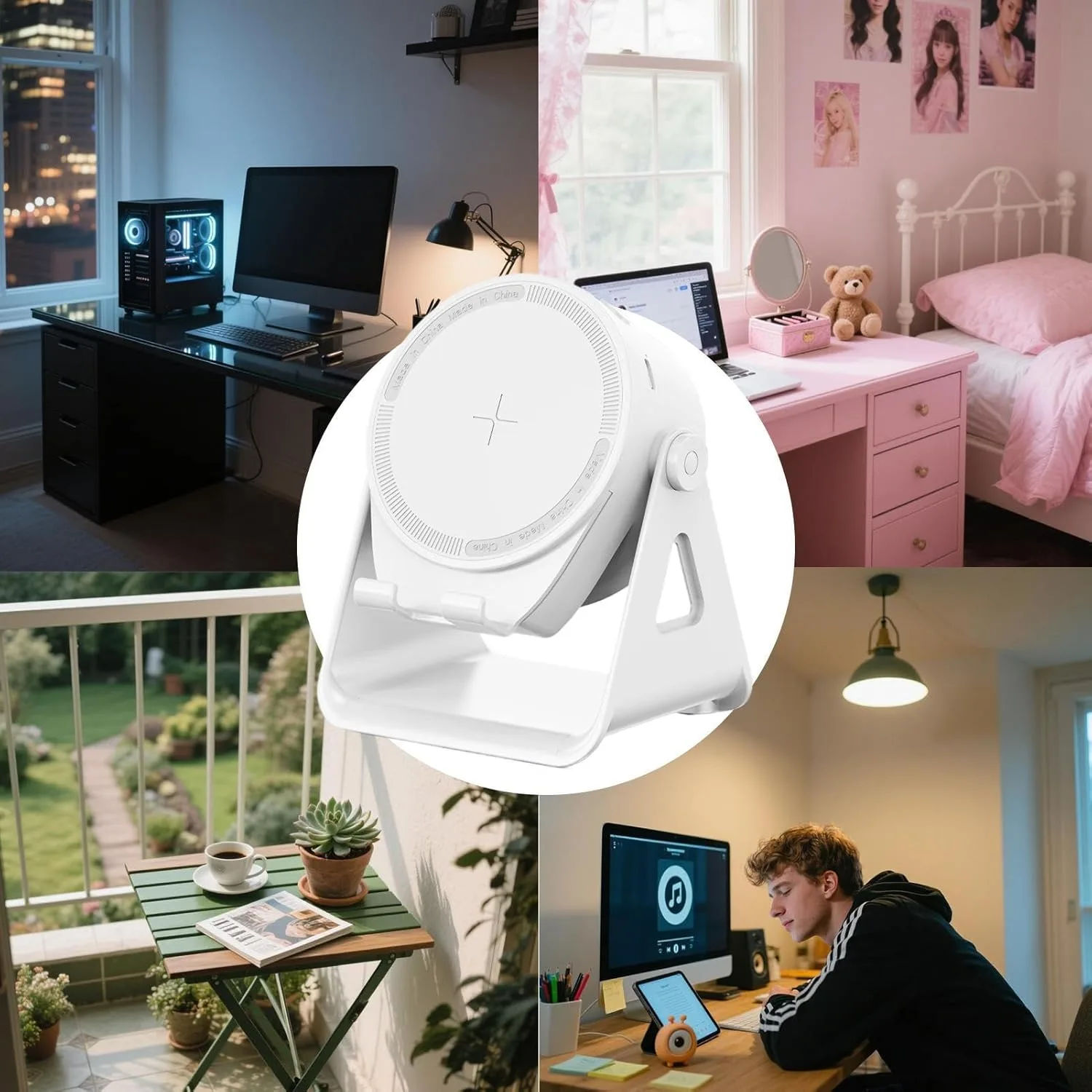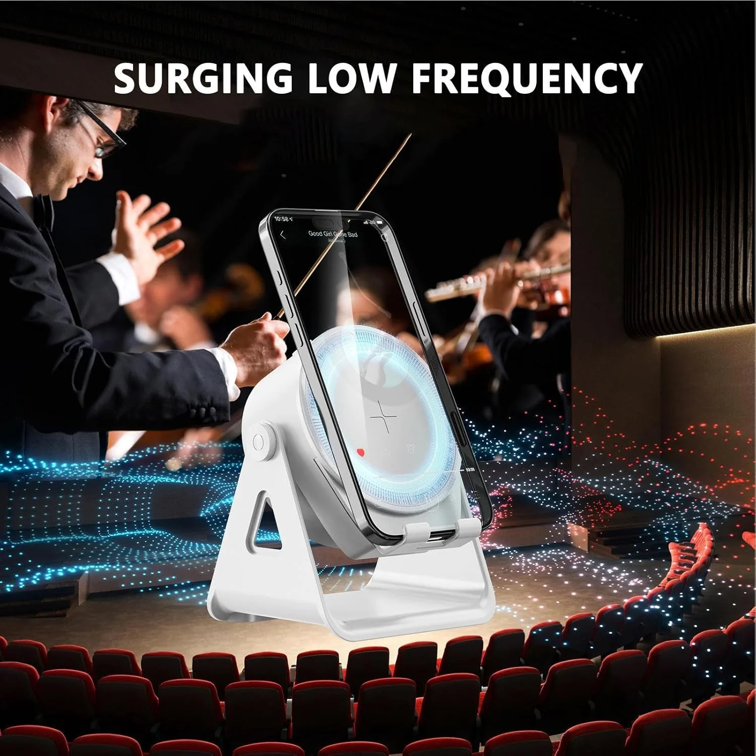 Funciones combinadas: este altavoz de inducción incorpora salida de audio inalámbrica, soporte giratorio e iluminación ambiental para un uso versátil sin desorden, optimizando el espacio de su oficina o salón.