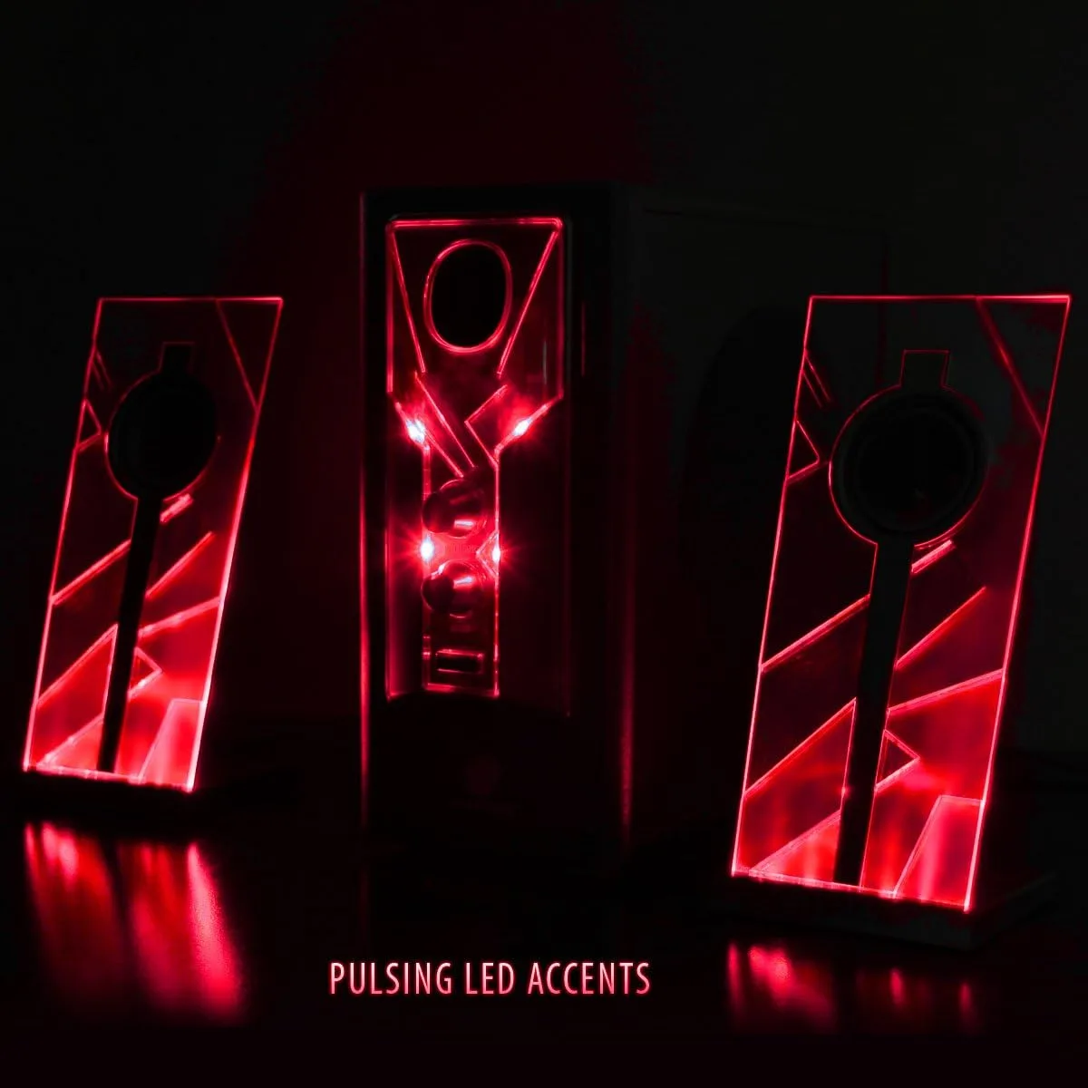 Para un movimiento de LED suave, presione el botón de pulso y los satélites y el subwoofer se iluminarán. ¡Gire el ecualizador de bajos más del 80% y las luces se moverán y vibrarán al ritmo del bajo!