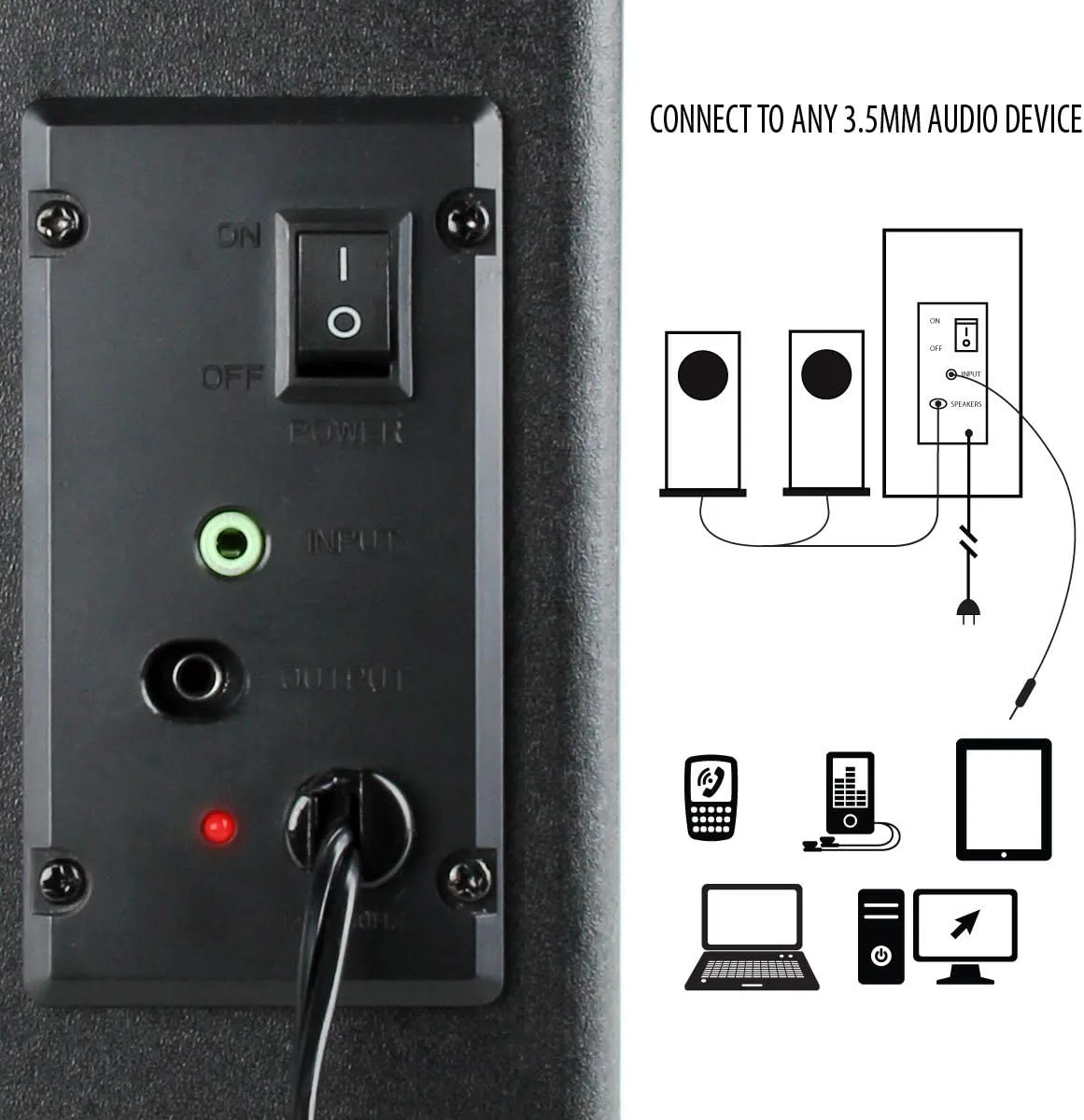 POTENTE CALIDAD DE SONIDO 2.1 CON SUBWOOFER BOOMING: Los altavoces de canal satelital y el subwoofer de graves pesados transmiten audio desde cualquier dispositivo usando un AUX estándar de 3.5 mm