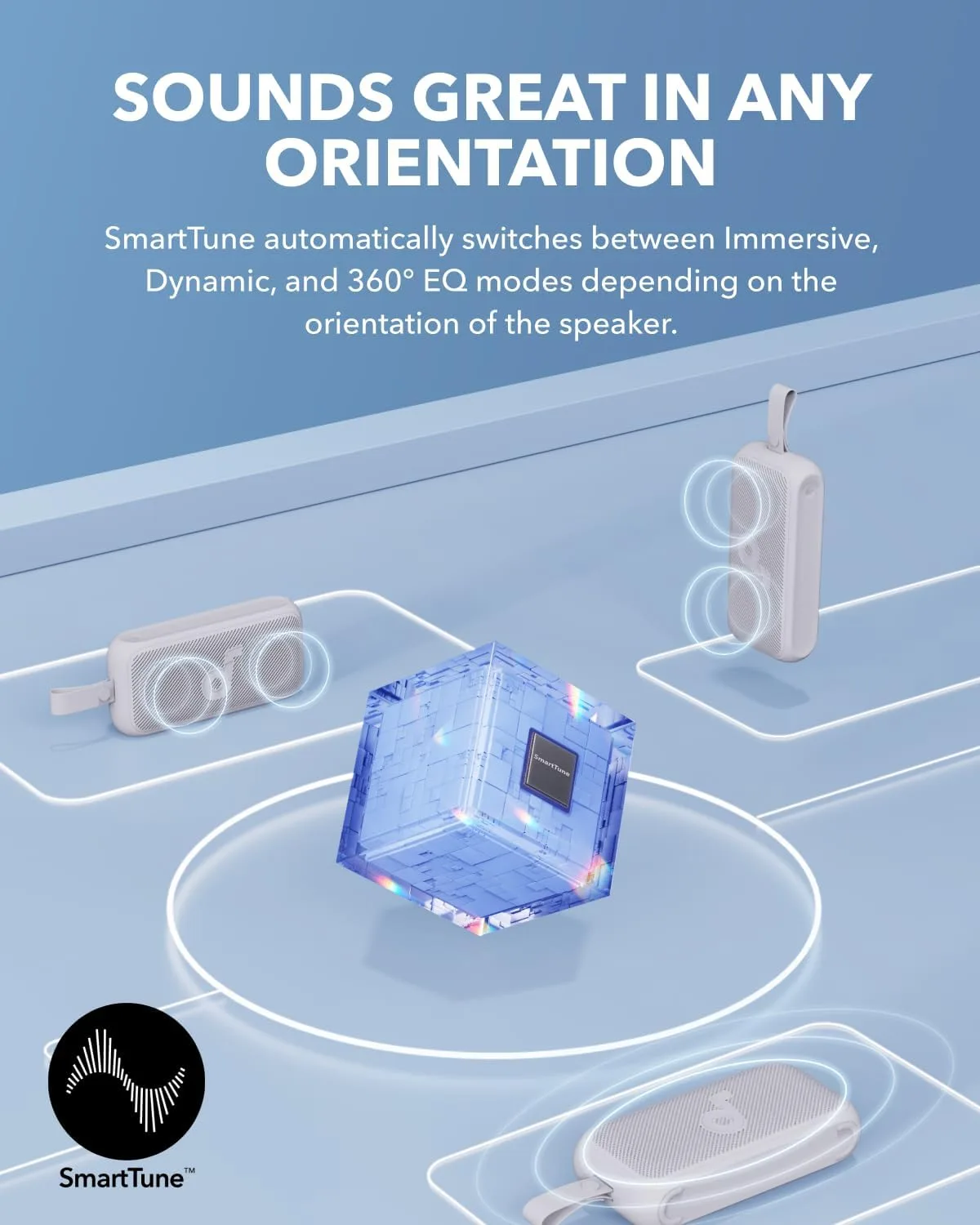 Tecnología SmartTune: La exclusiva tecnología adaptativa del altavoz portátil Motion 300 se ajusta automáticamente a la dirección y orientación del altavoz para transmitir un sonido envolvente en cualquier situación o lugar.