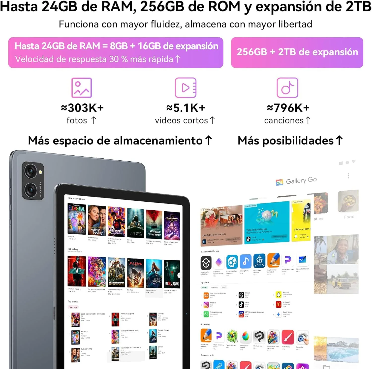 24GB RAM + 256GB ROM/2TB EXPANDIBLE : TABWEE T20 Tablet 10 pulgadas combina 8GB RAM integrada + 16GB expandible (total 24GB) y almacenamiento interno de 256GB ampliable, expandible hasta 2TB mediante tarjeta TF. Perfecta para guardar películas, fotos, proyectos y contenido creativo, esta tablet 256GB es ideal para creadores de contenido y usuarios avanzados. Su capacidad y velocidad hacen que cada tarea sea más eficiente y placentera.