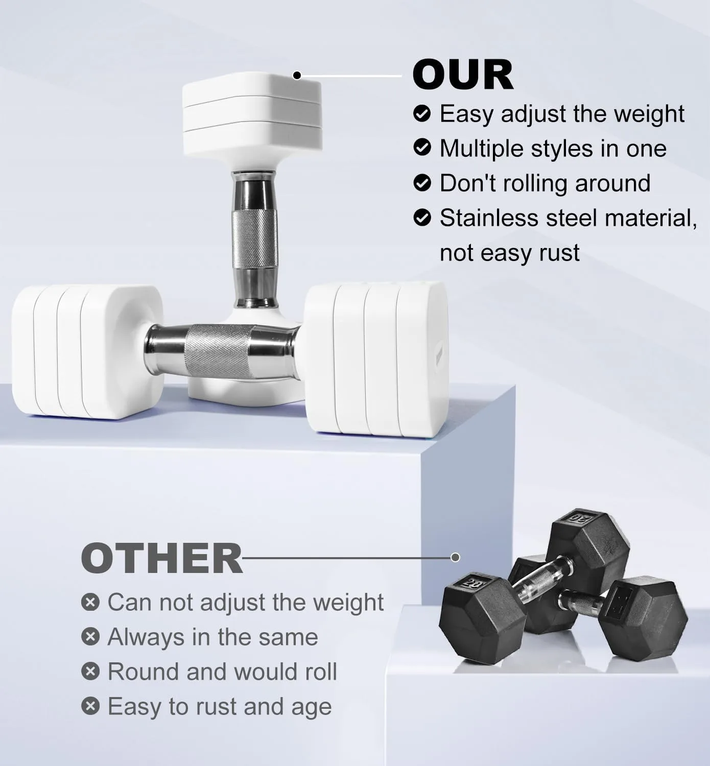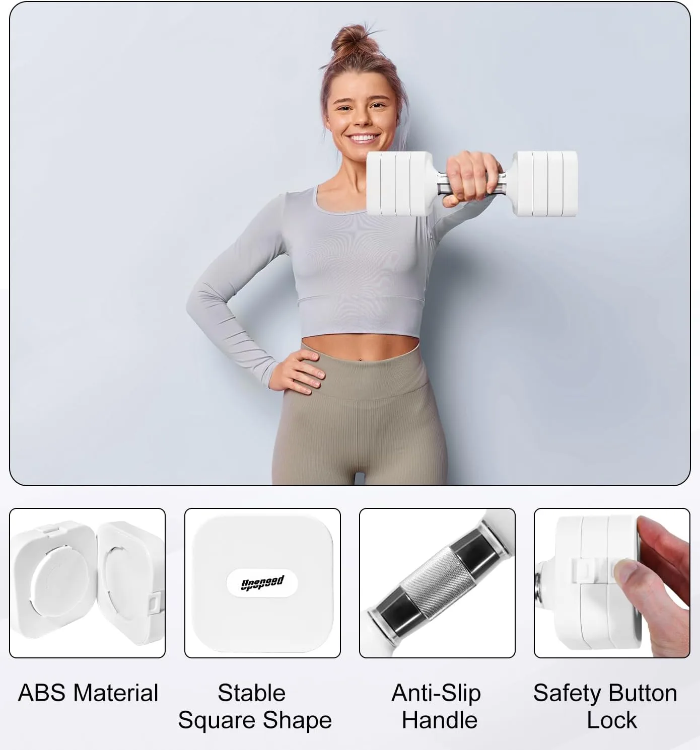 Bloque de pesas cuadrado: Nuestros pesas mujer de mano adoptan un diseño cuadrado, permitiéndole hacer más ejercicios como flexiones y aquellos que no puede hacer con las pesas circulares. Además, las pesas ajustables no rodarán por seguridad