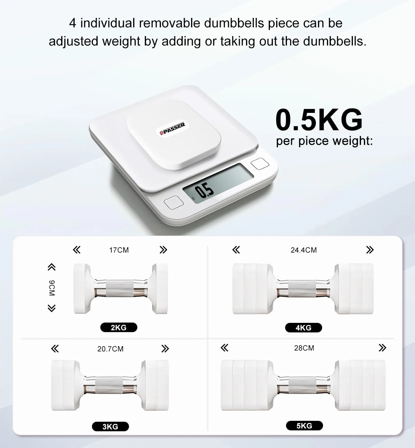 4 En 1 Pesas Ajustable: Pesas y mancuernas ajustables consta de 6 peso 0,5 kg placa mancuerna, rango ajustable es de 2 kg, 3 kg, 4 kg, 5 kg cada peso (Un par de 4 kg, 6 kg, 8 kg, 10 kg)