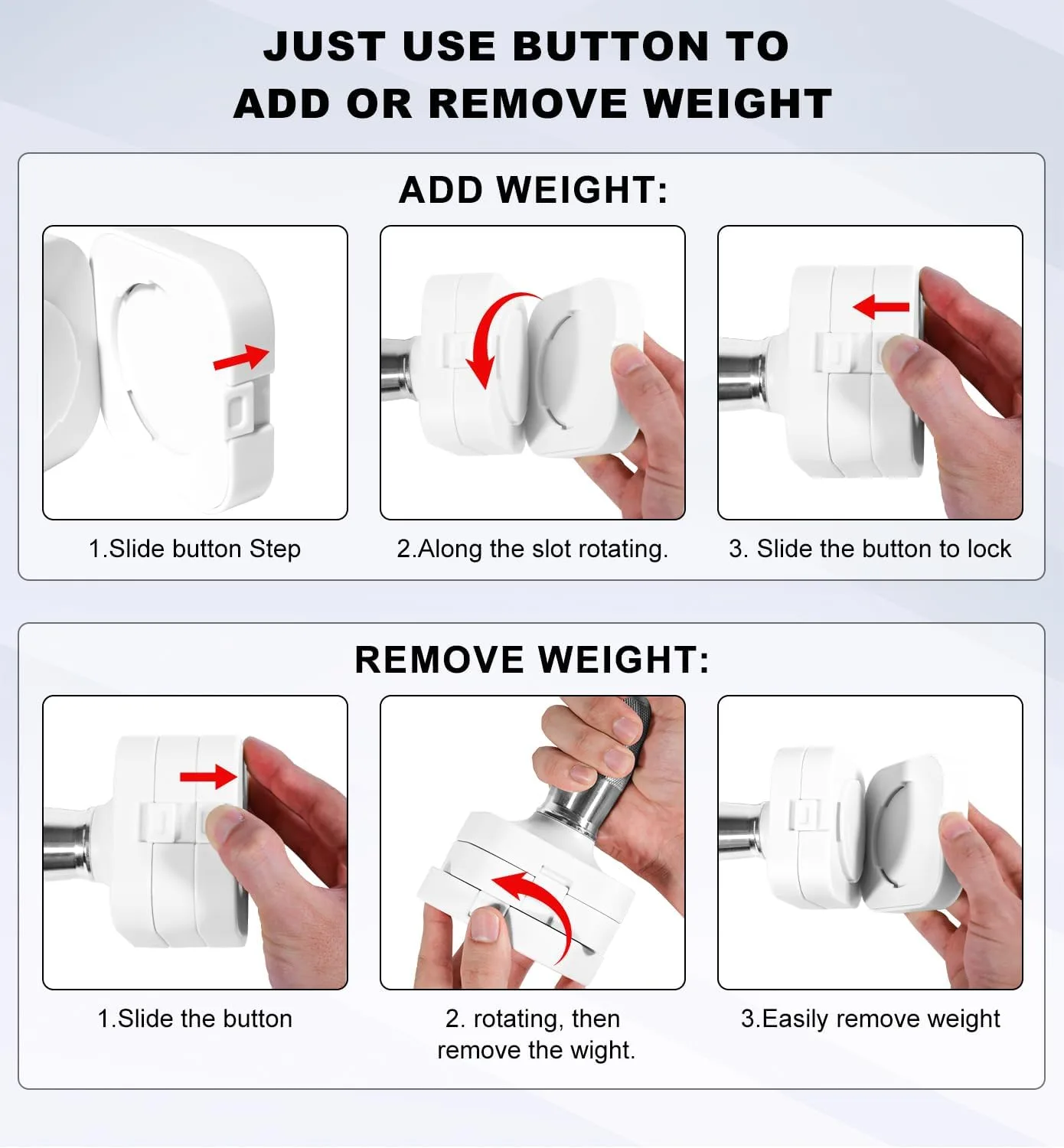 Ajuste en 1s y bloqueo de seguridad: El mecanismo para conectar y desconectar las piezas ponderadas adicionales son fáciles de usar y girar en su lugar, puede ser rápidamente para ajustar para más o menos peso. Y cada peso tiene un cierre de seguridad en la parte superior