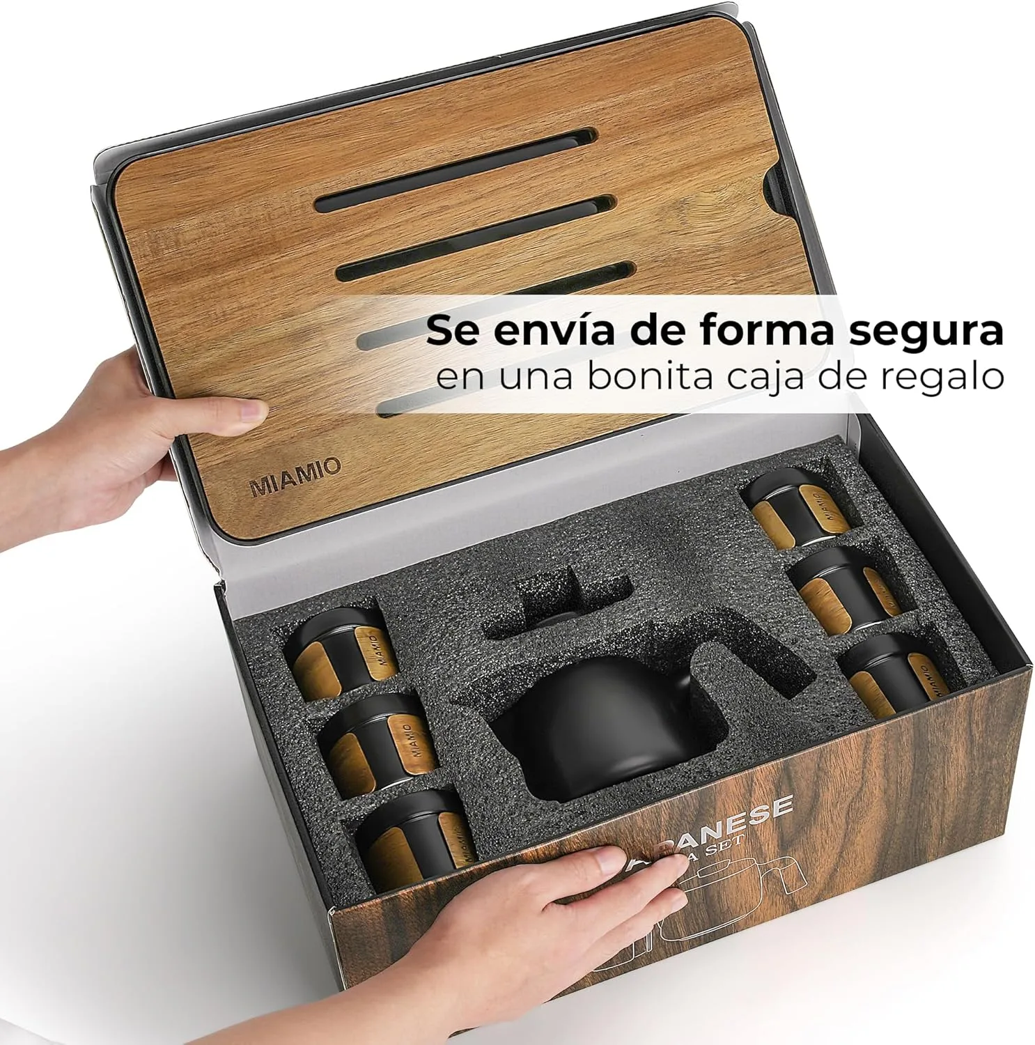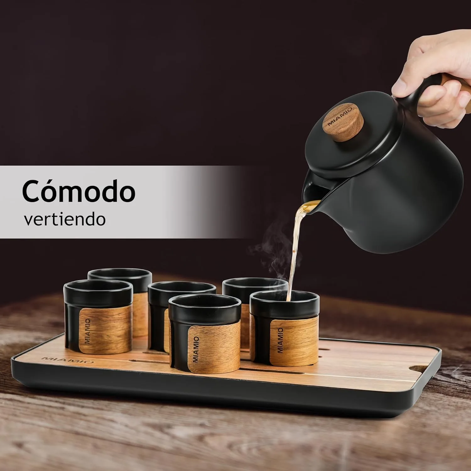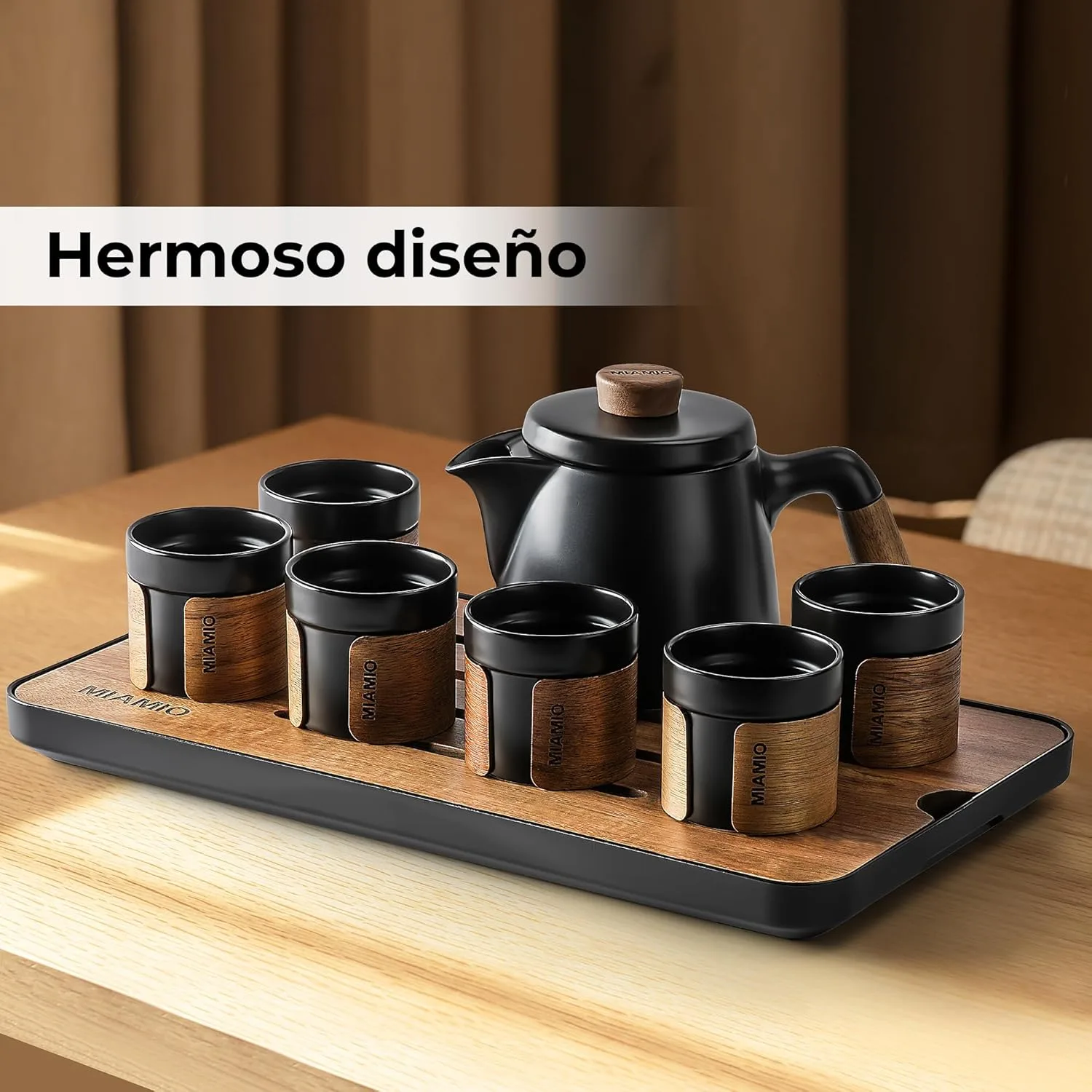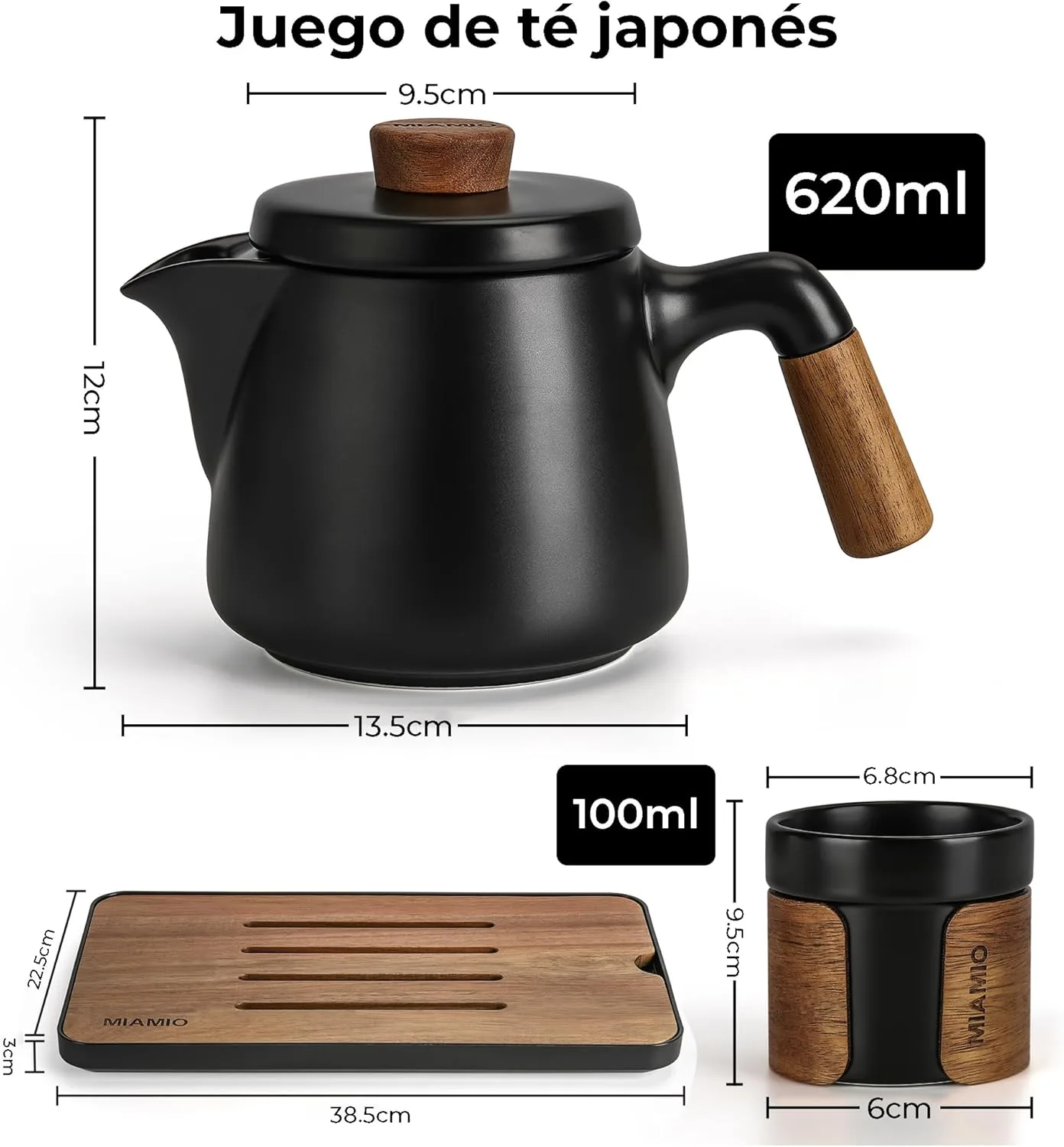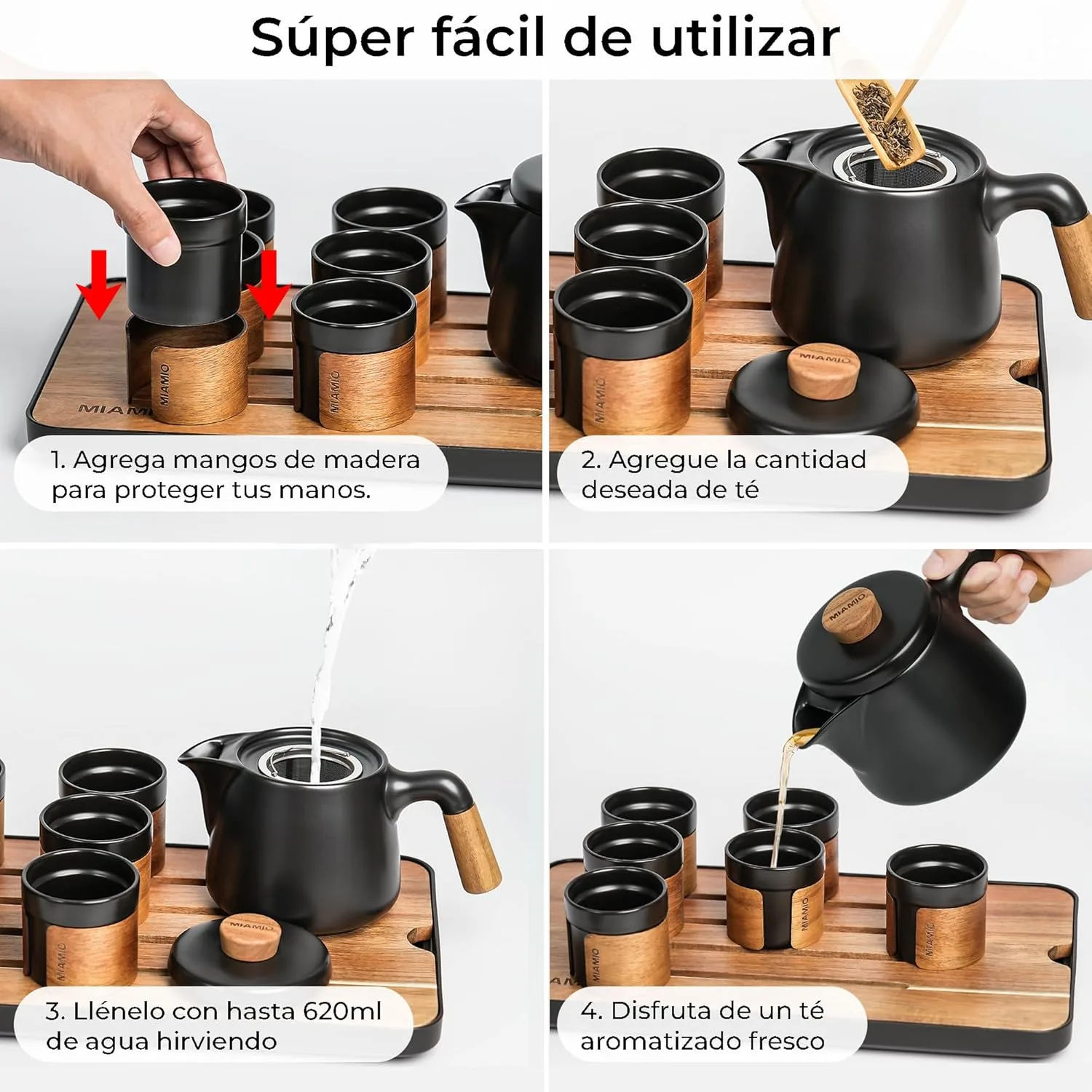 * Si te gusta servir el té muy caliente 🌡️, también viene con unos mangos de madera para aislar del calor al agarrar las tazas.