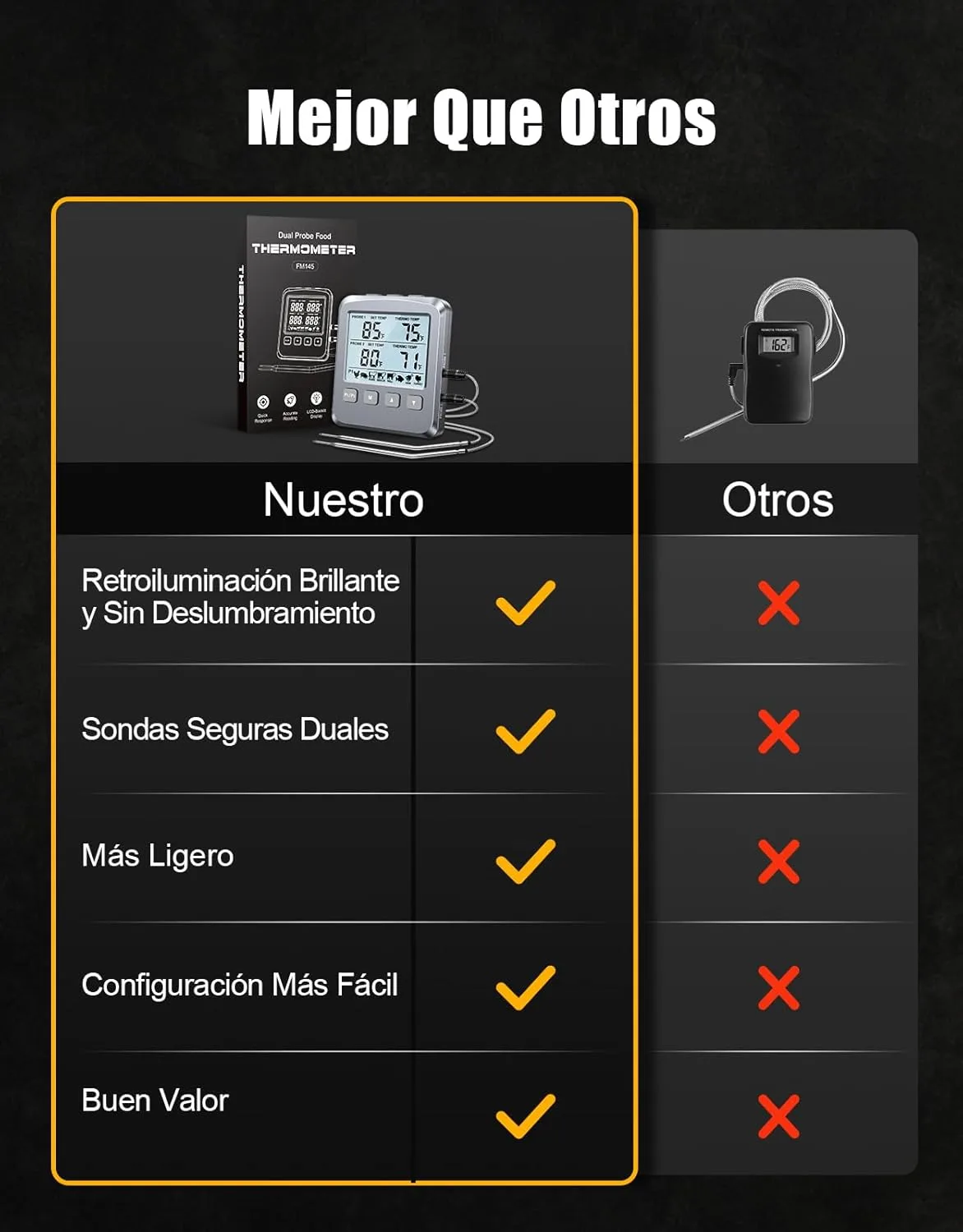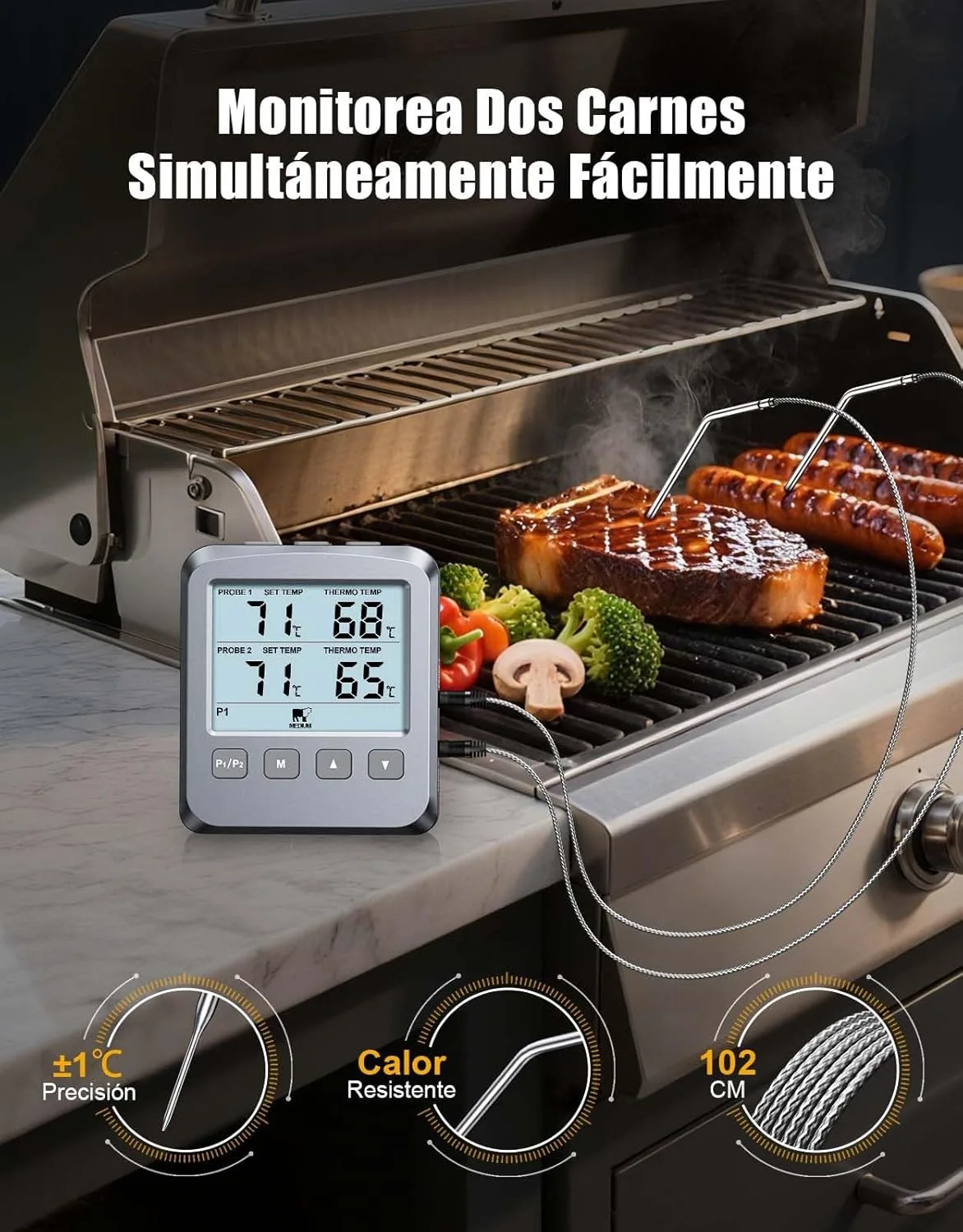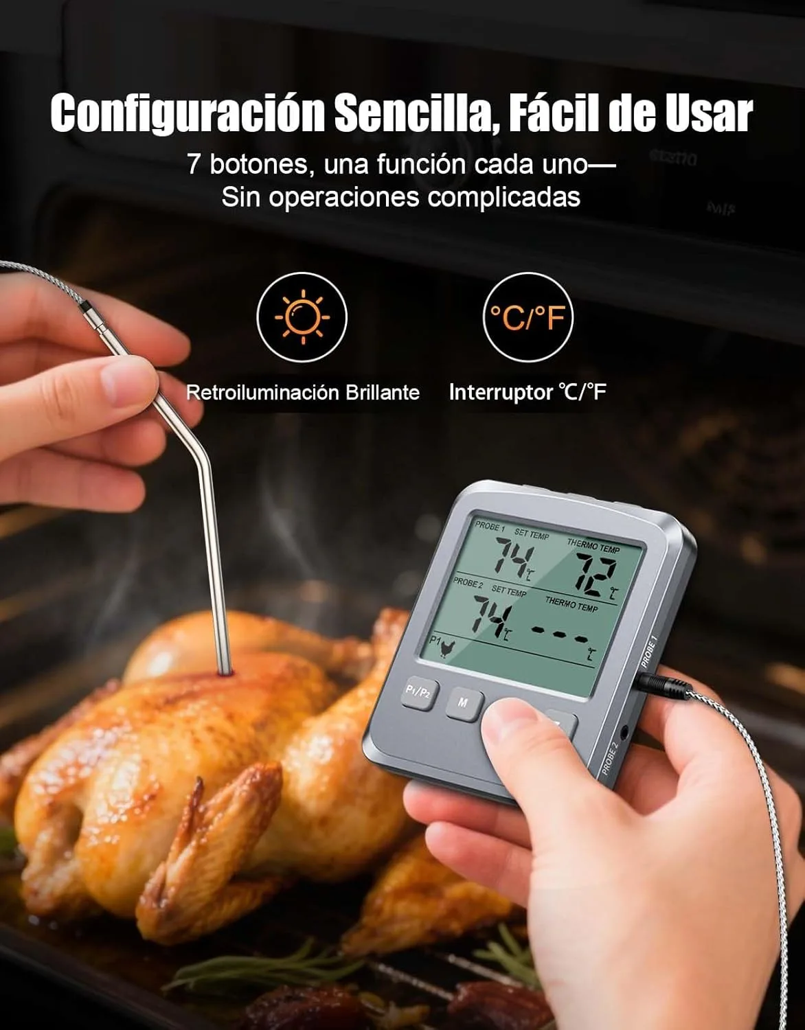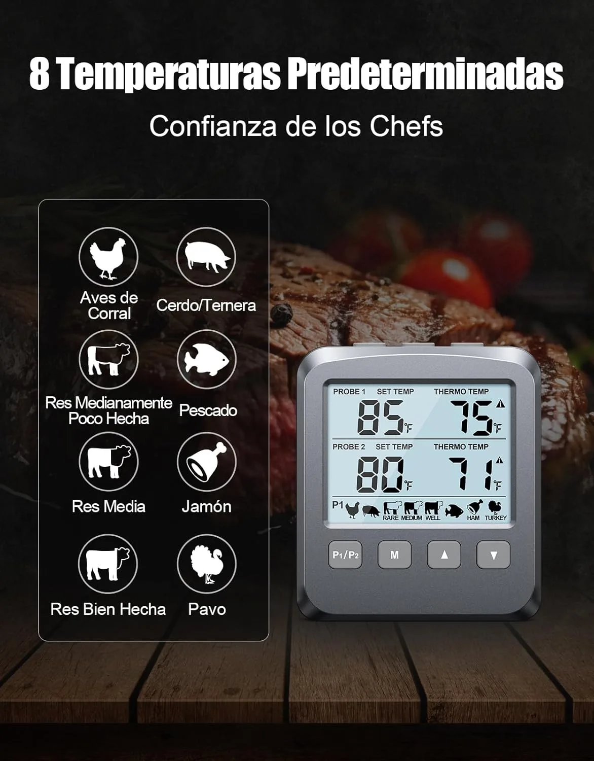 【Múltiples Funciones】Nuestro termómetro comida ofrece lecturas precisas para carnes, líquidos, freír y hornear; diseñado para hornos, parrillas, barbacoas, ahumadores, planchas, freidoras de aire y todas las cocinas interior/exterior, con temps predeterminadas que simplifican la preparación de pollo, ternera, cordero, cerdo, pavo y pescado.