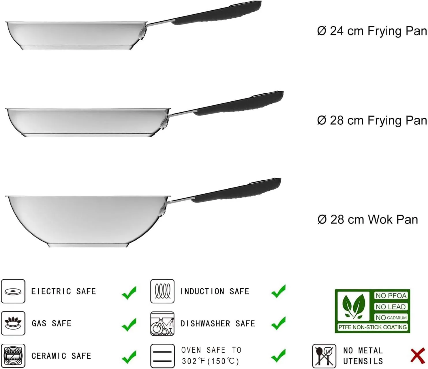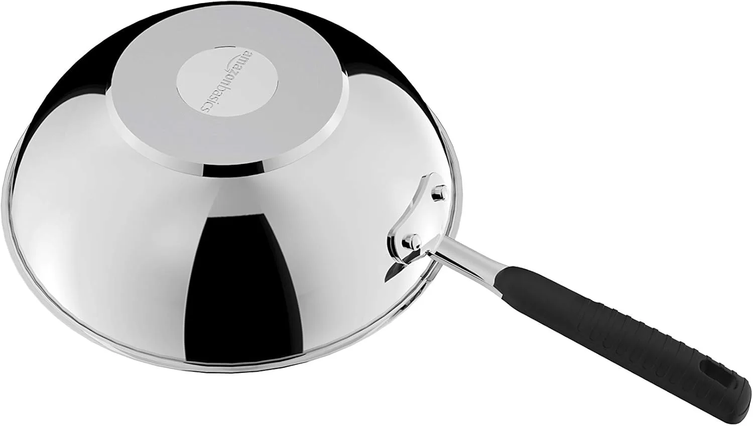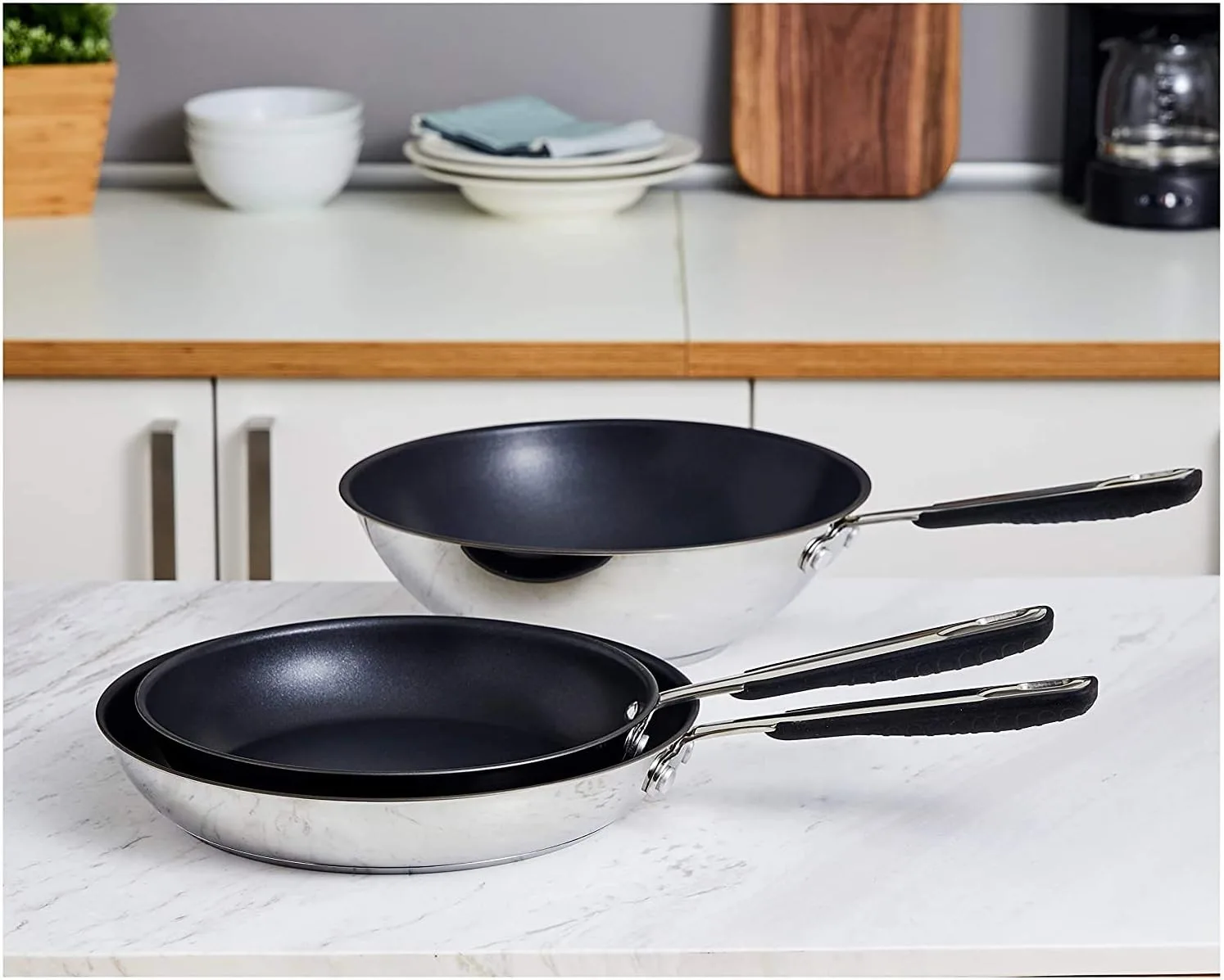 Amazon Basics Juego de Utensilios de Cocina de Inducción Sartenes y Wok, Antiadherentes, Acero Inoxidable, 24/28/28 cm, 3 Unidad, Plata
