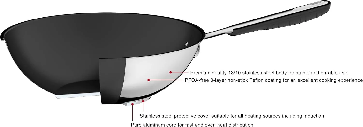 Hecho de acero inoxidable duradero con acabado exterior pulido de plata; recubrimiento interior antiadherente de PTFE para liberar alimentos sin esfuerzo