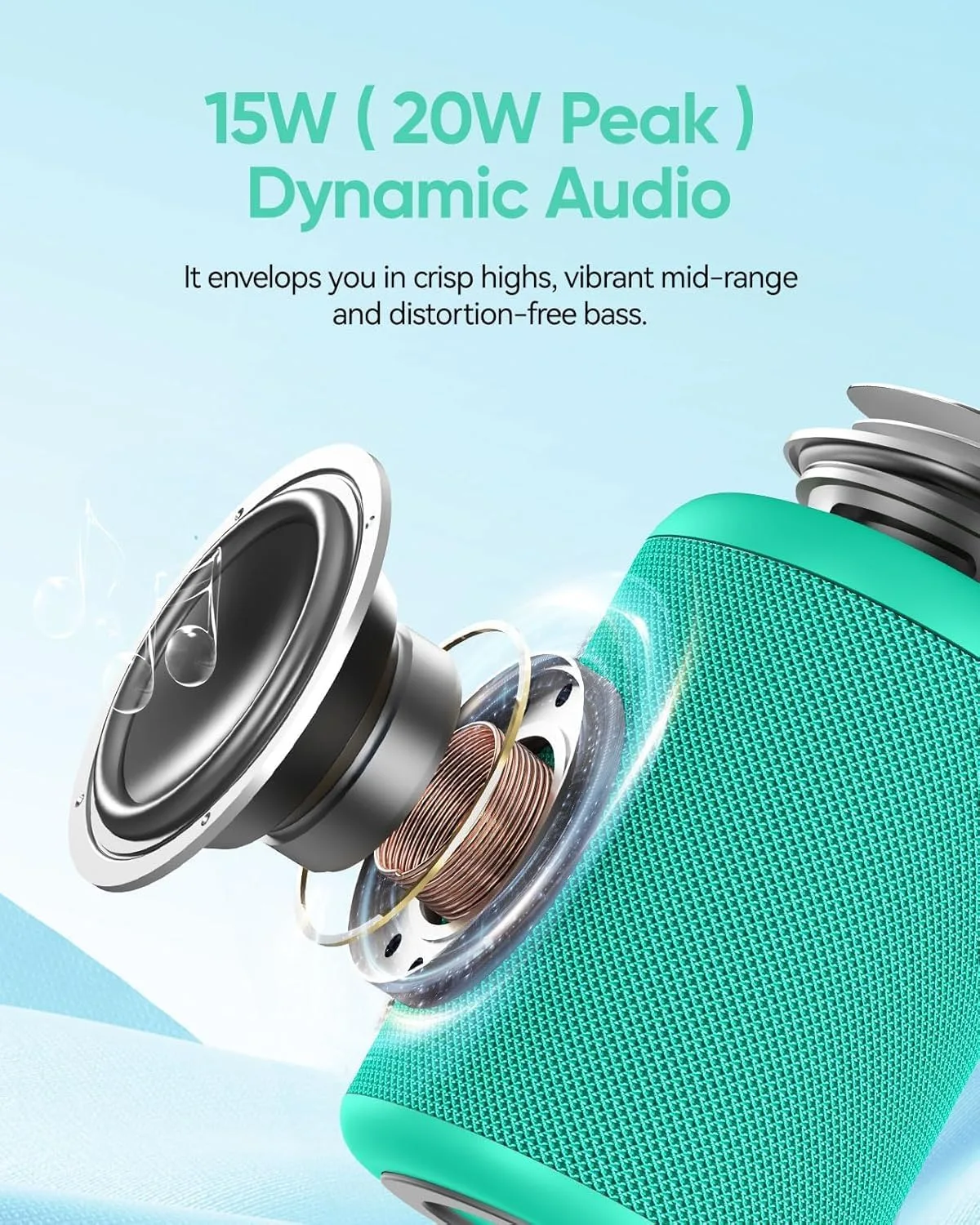 【 Sonido envolvente】: Experimenta un impresionante sonido de 15W(20W pico) en un diseño compacto. Con cero distorsión de audio, este altavoz Bluetooth ofrece agudos altos, medios nítidos y graves completos para una experiencia de sonido envolvente. Con hasta 15 horas de reproducción con una sola carga, disfruta de tus canciones favoritas durante todo el día y la noche sin interrupciones