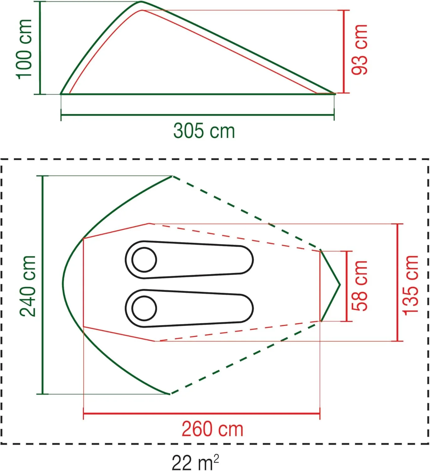 Superficie para dormir de 2.7 m²; toldo de 1.4 m²; construcción: tienda interior primero; tamaño del paquete: 55 x 15 x 15 cm; peso 2.8 kg; columna de agua de 3000 mm; incluye bolsa de transporte con cremallera, cuerdas tensoras y piquetas para tienda de campaña