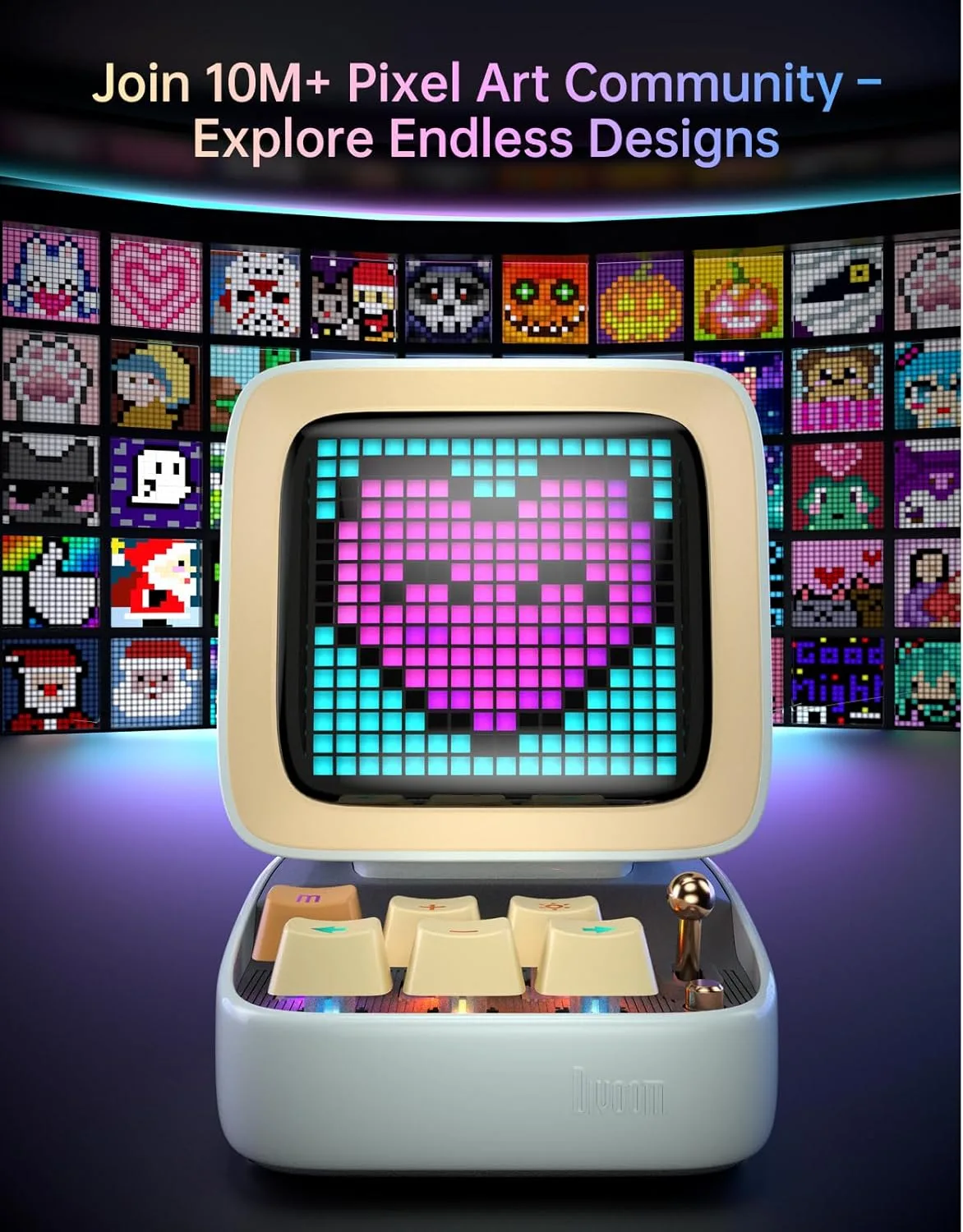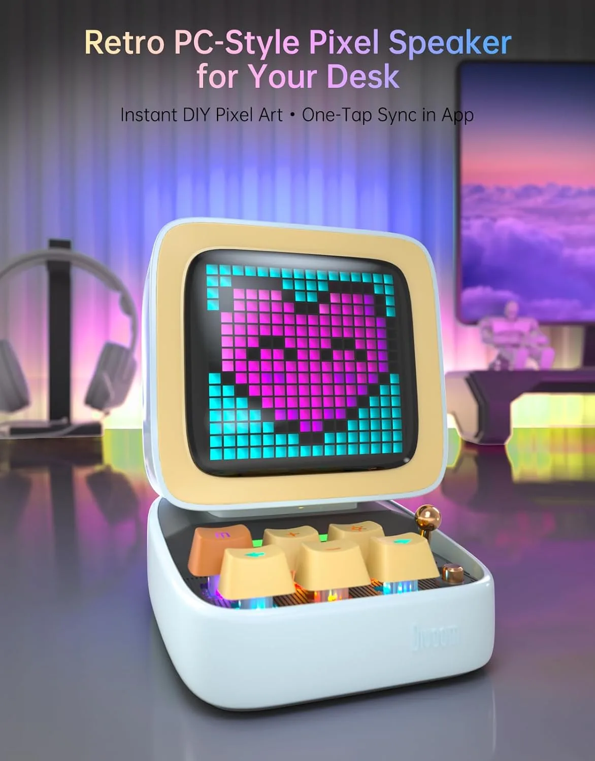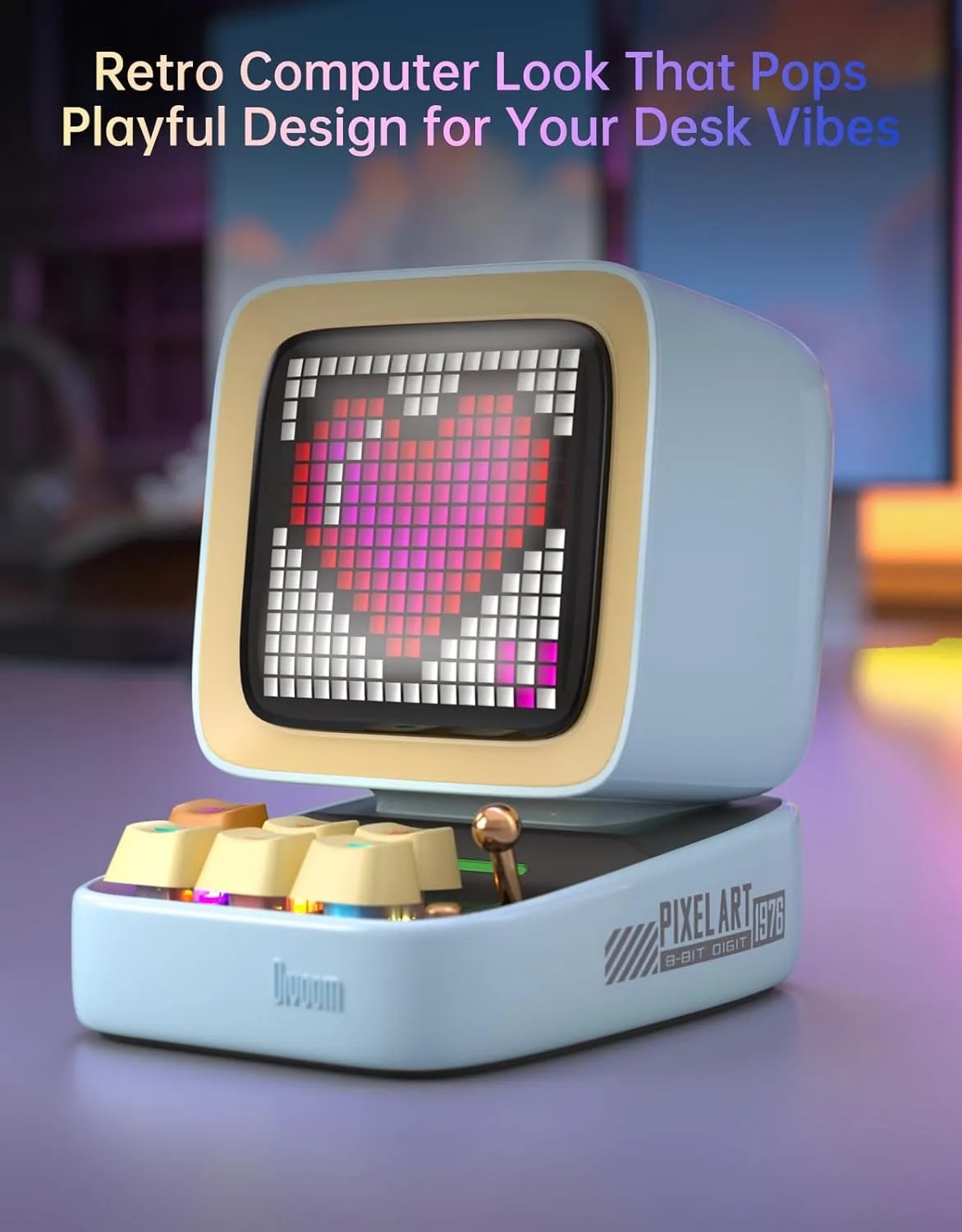 Conoce a Divoom Ditoo – Este es el altavoz más agradable y divertido para el usuario, con las características más abundantes. Las teclas de este modelo son únicas debido al uso de interruptores mecánicos retroiluminados en el mini teclado y los colores brillantes en la «pantalla» de 16 x 16 píxeles, que se suma al tema de una pequeña computadora retro.