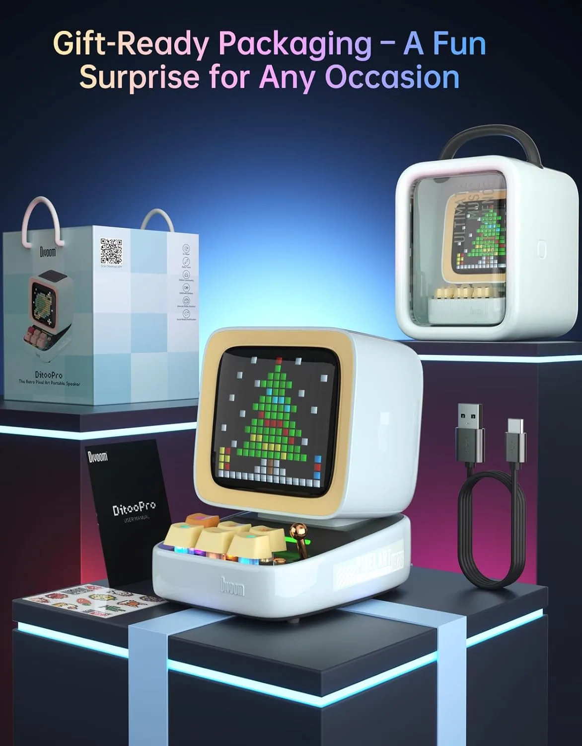 El mejor regalo – Este es un dispositivo en el escritorio, y hay muchas animaciones y otras obras de arte disponibles para uso ilimitado. La calidad de sonido de este producto es excelente y la duración de la batería también es muy larga. El producto incluso se puede empaquetar en una pequeña bolsa de regalo, y traerá grandes sorpresas como regalo en Navidad / cumpleaños para las personas a las que les gustan las computadoras viejas o los juegos retro.