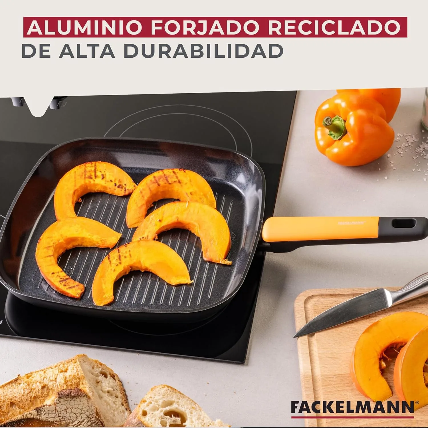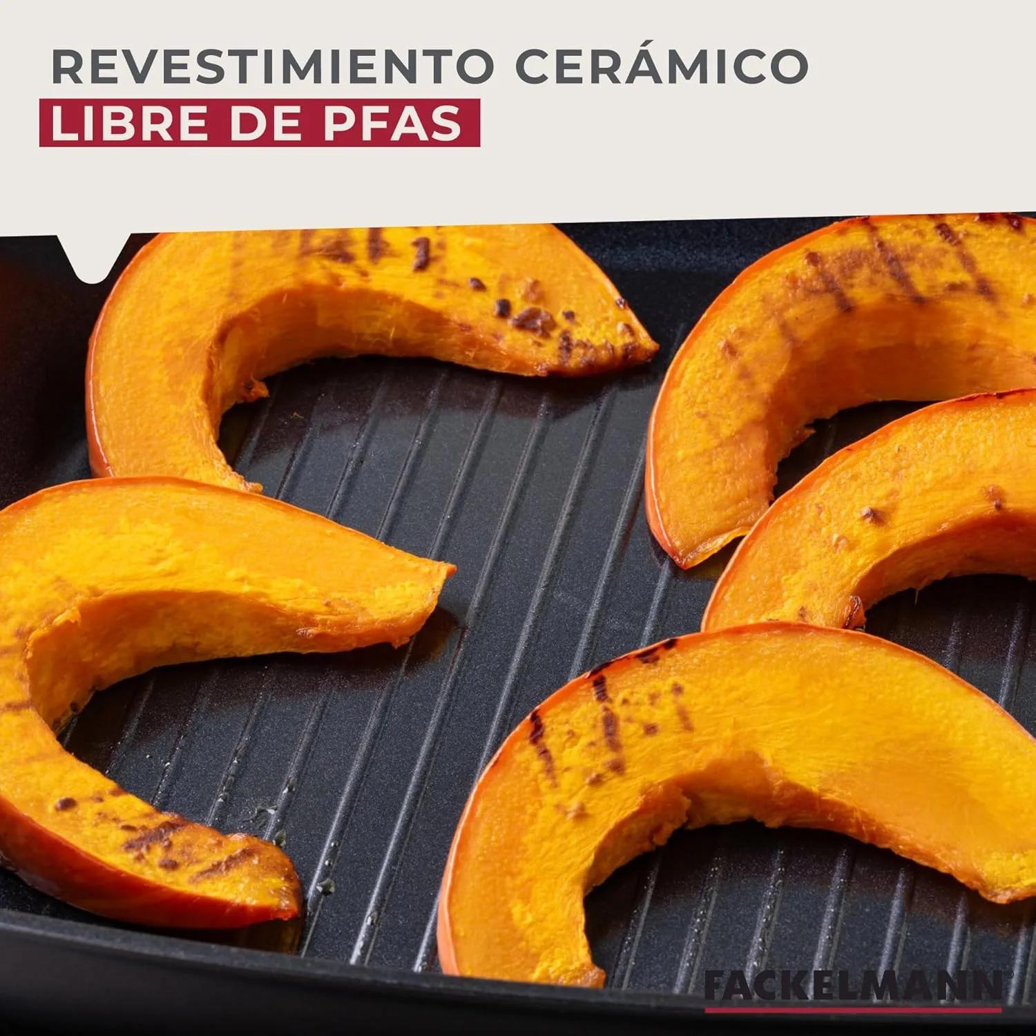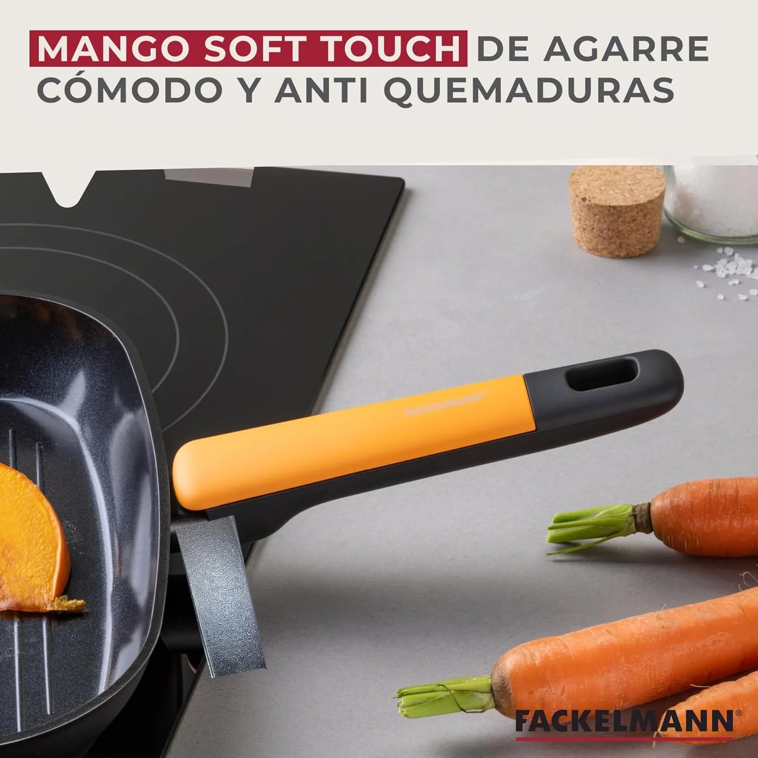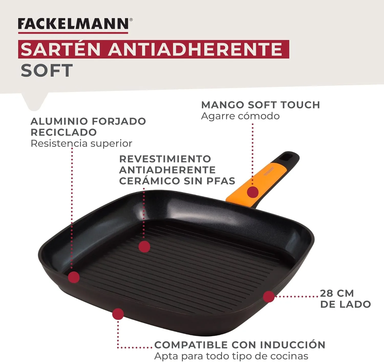 Resumen del producto: Fackelmann Soft Grill Antiadherente 28 cm, Aluminio Forjado, Revestimiento Cerámico Greblon Libre de PFA, Apta para Inducción, Vitro, Gas y Horno, Mango Soft Touch Resistente al Calor, 1 ud.