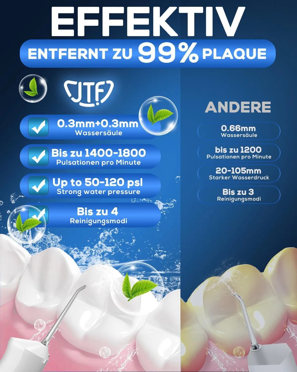 🗸 Limpieza Profunda & Protección de Encías: Tecnología de pulso de agua dual de 0.6mm. Elimina el 99.99% de la placa y restos de comida ocultos entre dientes y bajo la línea de las encías con 1400-1800 pulsos/min (50-120 PSI). Combate el mal aliento y es ideal para brackets, puentes y encías sensibles.
