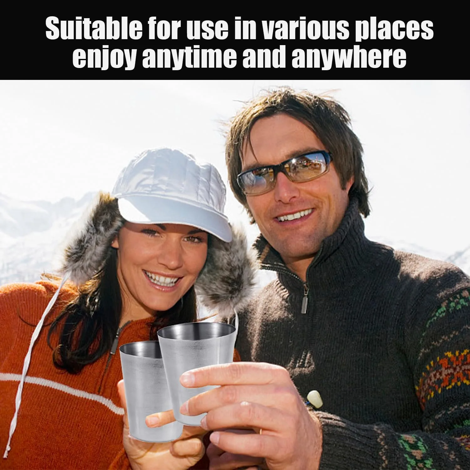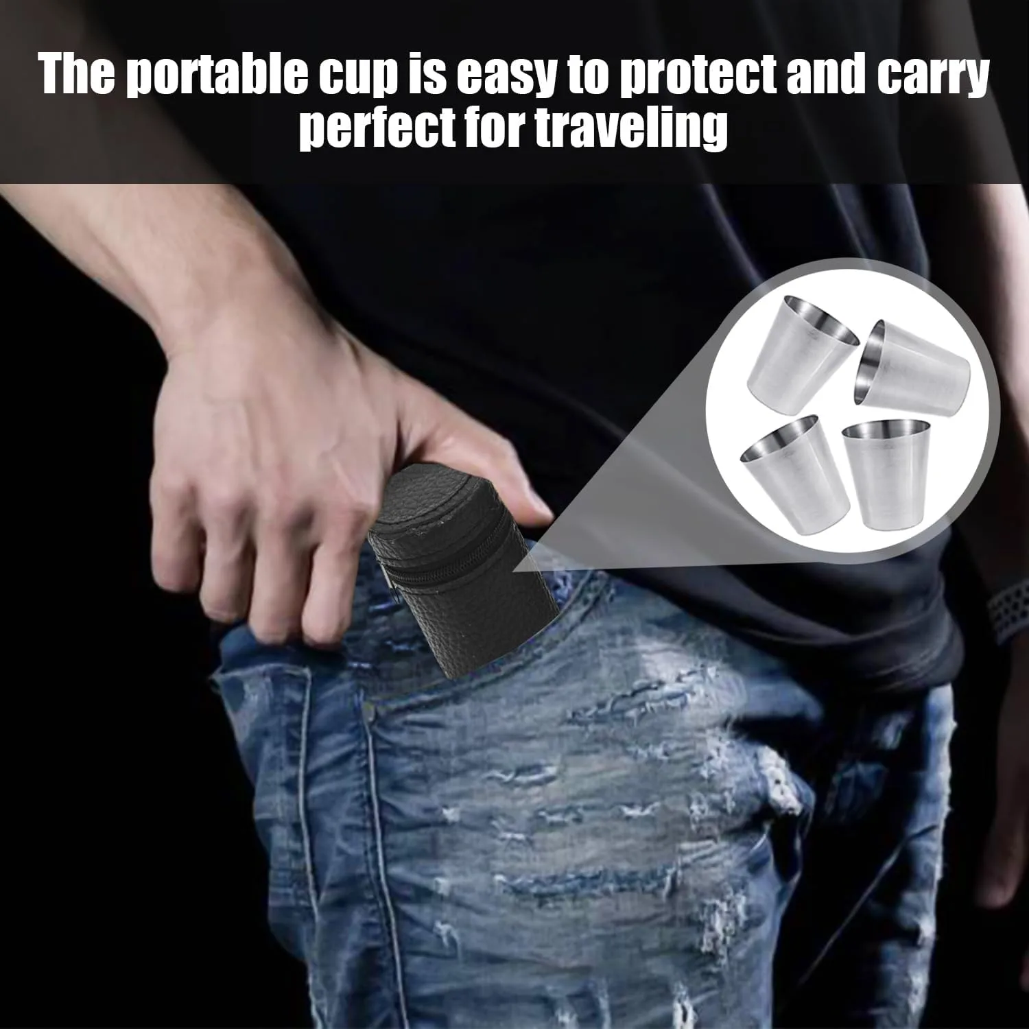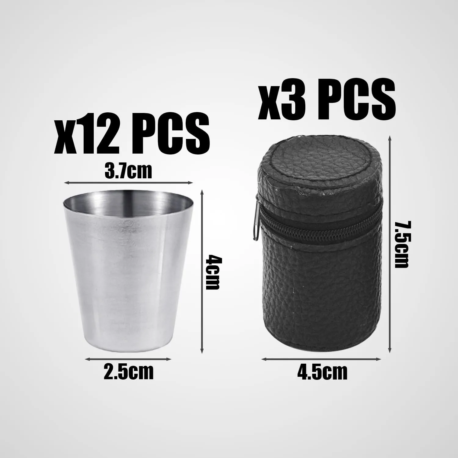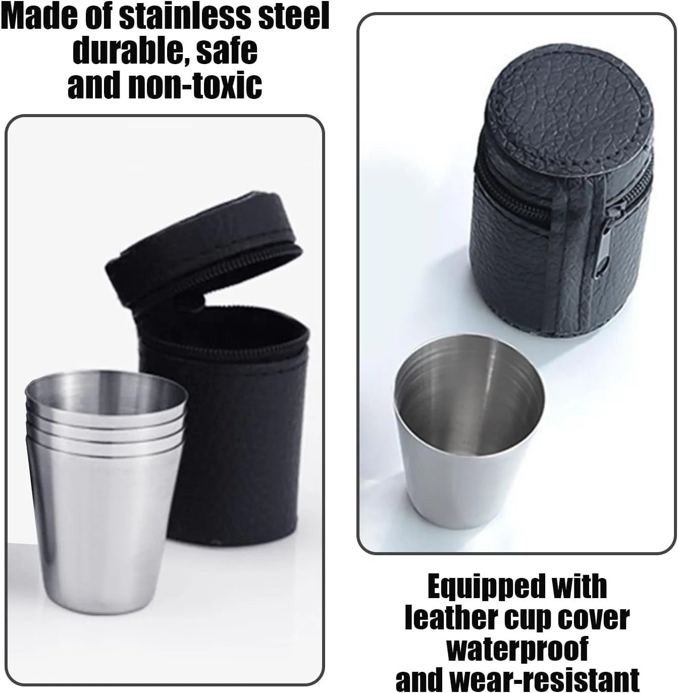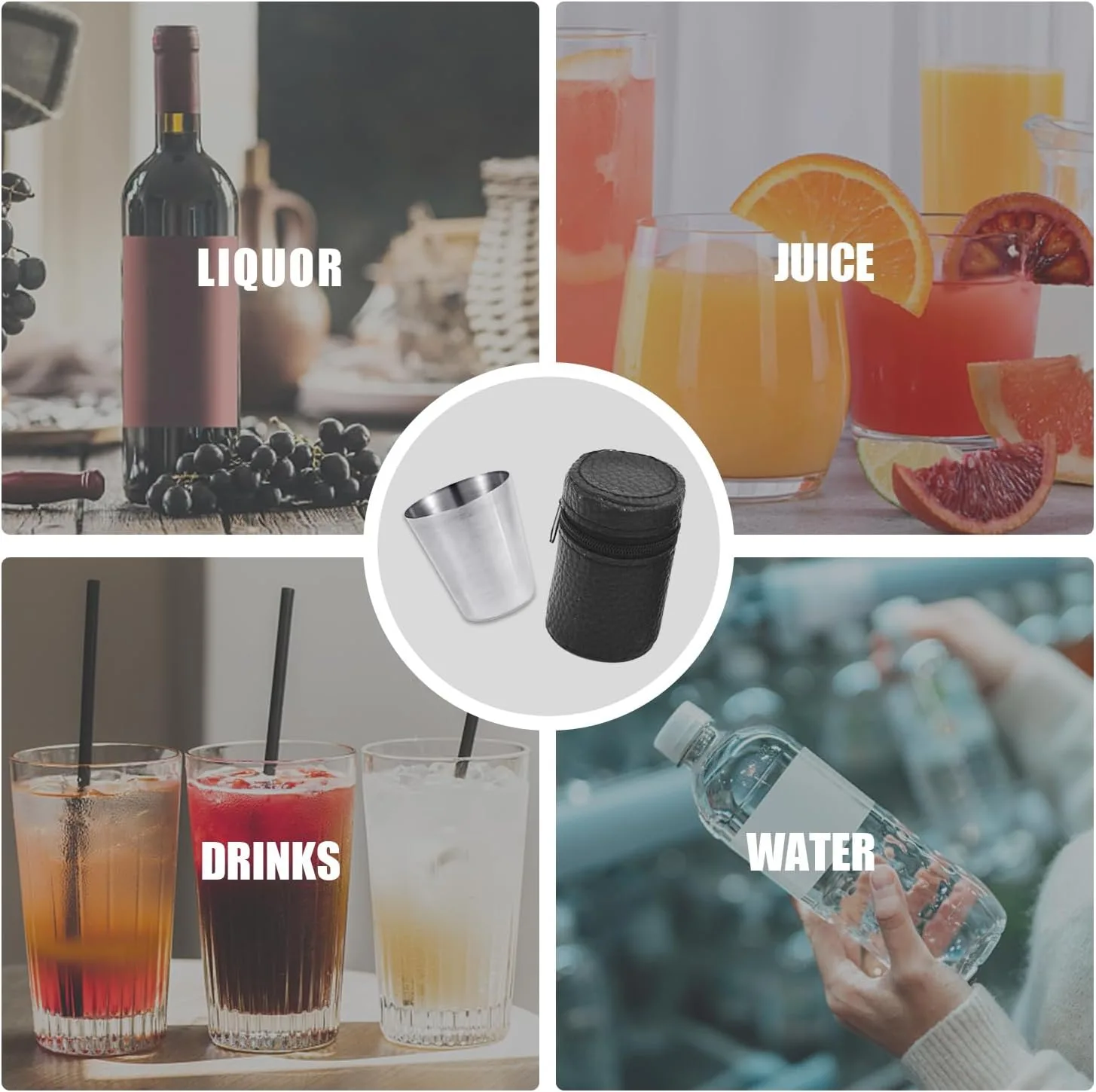 Detalles del producto: Taza portátil Material: acero inoxidable. Color: plateado. Cantidad: 12 unidades. Tamaño: diámetro de apertura de vaso 3,7 x altura 4 x diámetro de la base 2,5 cm. Funda de almacenamiento. Material: piel. Color: negro. Cantidad: 3 unidades. Tamaño: 7,5 x 4,5 cm. Características: 1. Incoloro, inodoro, sin BPA, duradero, seguro y protegido. 2. Fácil de limpiar para garantizar que se mantenga limpio e higiénico cuando se reutiliza.