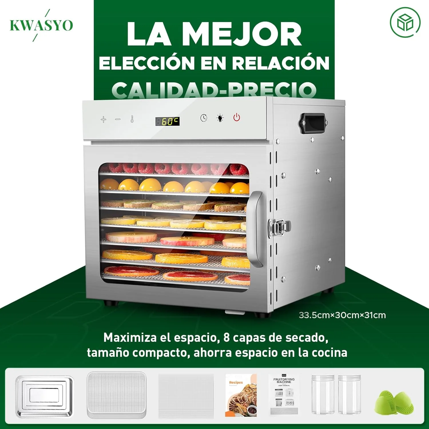 The Kwasyo Stainless Steel Dehydrator is an excellent kitchen appliance for anyone who enjoys making dried fruits, vegetables, or jerky at home. The stainless steel design is not only sleek and durable but also easy to clean, giving it a professional, high-quality feel. The 8 adjustable temperature levels allow for precise control, so I can dehydrate different foods perfectly without over-drying or under-drying.