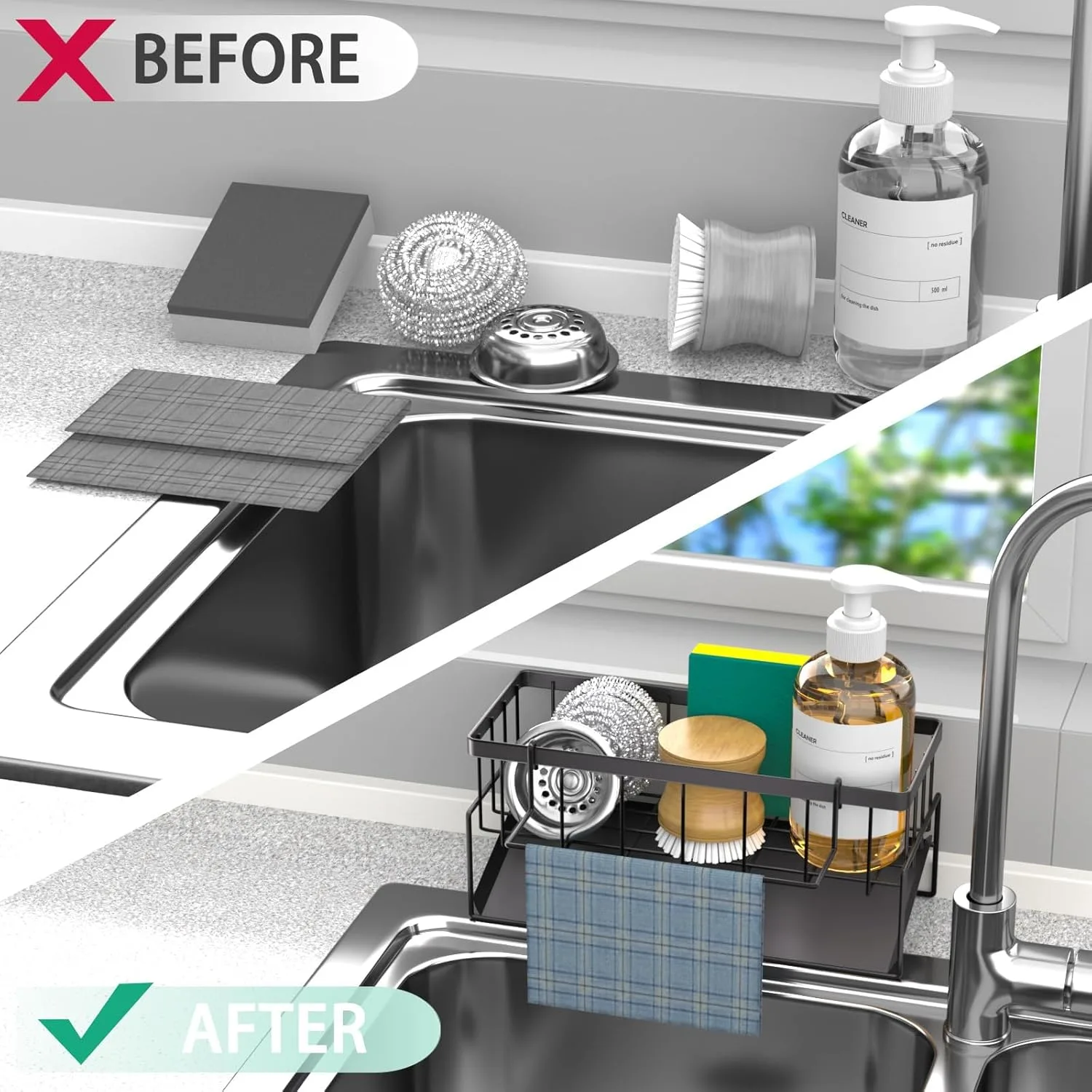 Almacenamiento que ahorra espacio: este organizador de cocina es compacto (23 x 9 x 10,5 cm) y hace un uso óptimo del espacio limitado de su cocina. Ofrece suficiente espacio para esponjas, productos de limpieza y cepillos para mantener tu cocina ordenada y evitar el consumo innecesario de espacio.