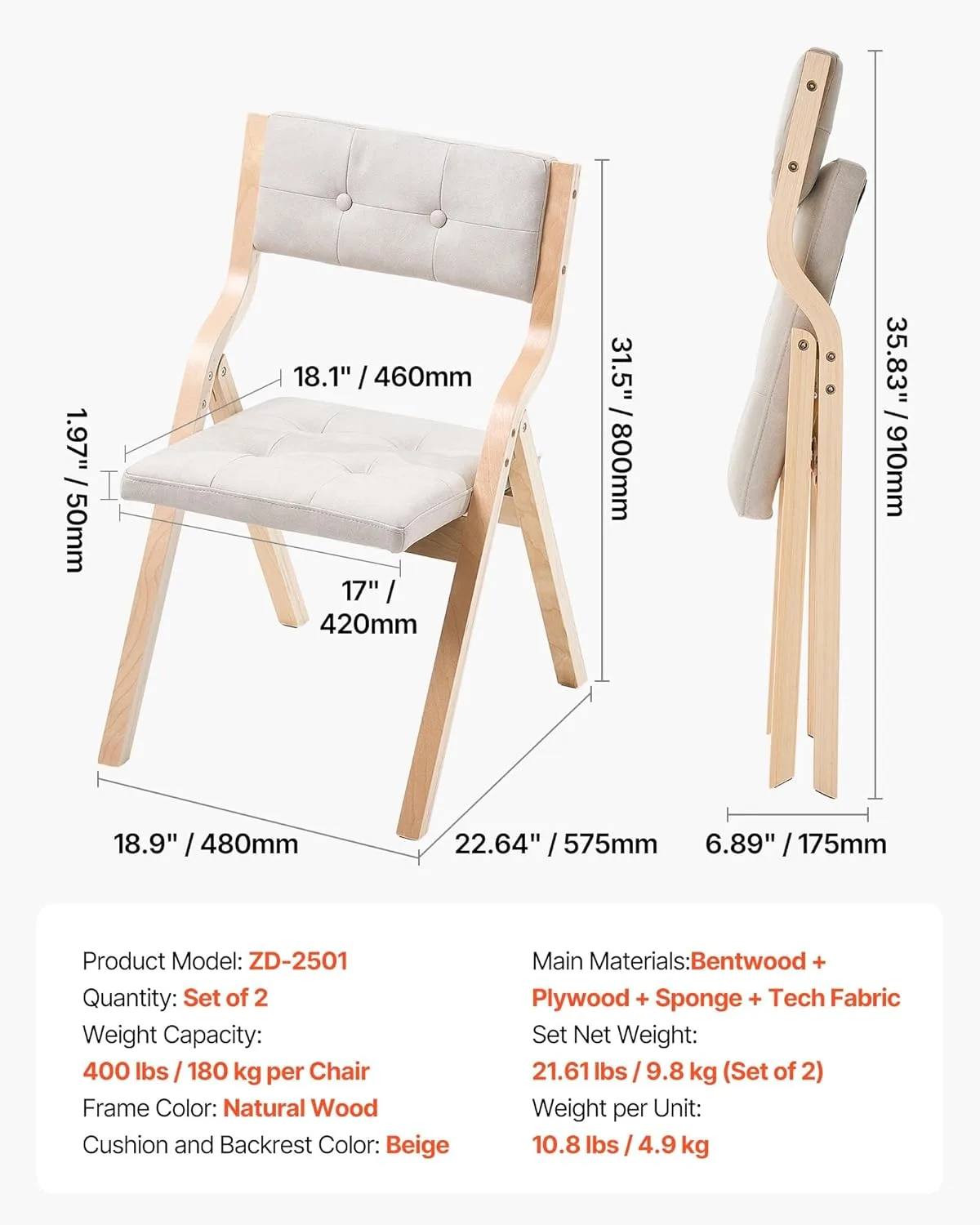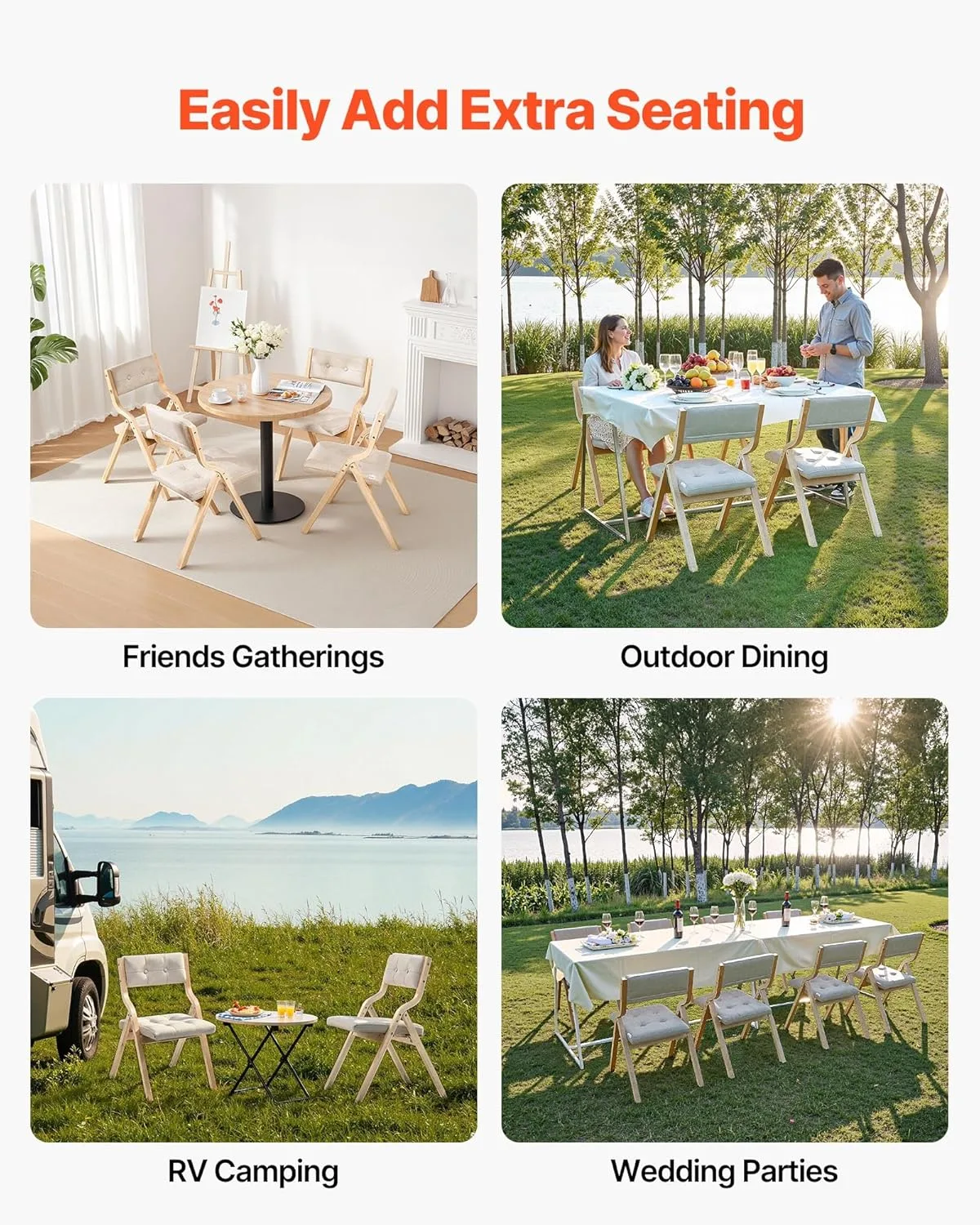 Resumen del producto: VEVOR Sillas Plegables de Madera con Cojín Acolchado 575 x 480 x 800 mm Marco de Madera Resistente Sillas Acolchadas Portátiles para Cocina, Oficina, Boda, Fiesta, Comedor, Cojín Blanco, 2 Piezas