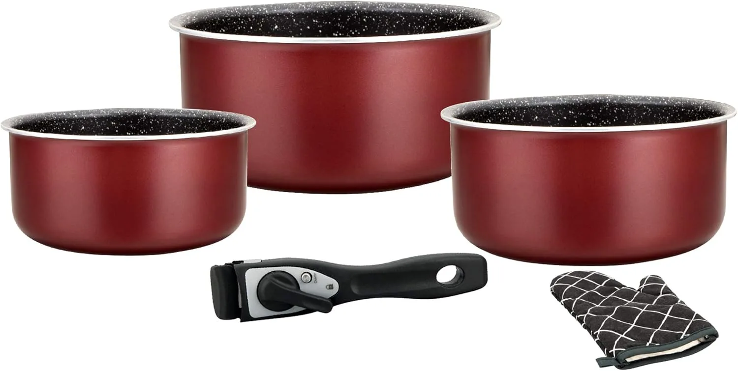 Cocine platos perfectamente hervidos a fuego lento, un delicioso guiso, un postre gourmet y mucho más con este hermoso set. Descubra una extraordinaria batería de cocina combinada con un diseño innovador sólo en las colecciones Herzberg Healthy Cooking. Características: Diseño elegante Ollas y sartenes antiadherentes de aluminio forjado grueso Recubrimiento resistente al calor y sin PFOA Calienta rápida y uniformemente Tratamiento antioxidante y anticorrosión Utensilios de cocina saludables Mangos extraíbles y ergonómicos Mango con cierre rápido y botón de liberación rápida Elementos apilables para un fácil almacenamiento Apto para horno y lavavajillas. Cocina sana y no tóxica Fácil de limpiar Tapas de cristal templado para controlar la cocción de los alimentos y borde de silicona para un cierre hermético Diseñado para todo tipo de cocinas Incluye una manopla de horno de regalo Especificaciones: Marca: Herzberg Colores: negro, cobre, burdeos Material de la sartén: aluminio forjado Material del revestimiento exterior: pintura esmaltada mate Material del revestimiento interior: mármol Material del mango: baquelita 1 x sartén (16x8cm) 1 x sartén (18x9cm) 1 x sartén (20x10cm) 1 x mango extraíble 1 x guante de horno. Advertencia: No sobrecargar el límite de rodamiento del mango (peso máximo 3kg).
