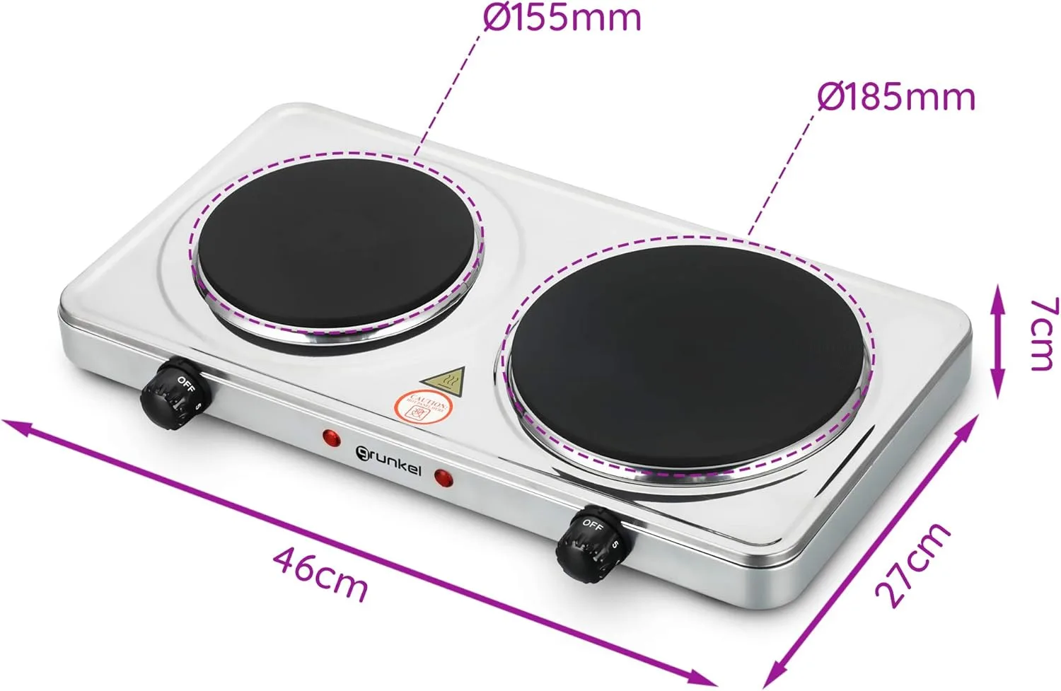 Grunkel – EHP-118 – Hornillo Eléctrico de 18,5cm de Placa. Cocina Eléctrica portátil ideal para Caravanas, Camping o Cocinas Pequeñas – 1500W – Metal forjado – Blanco (2 Inox 2500W)