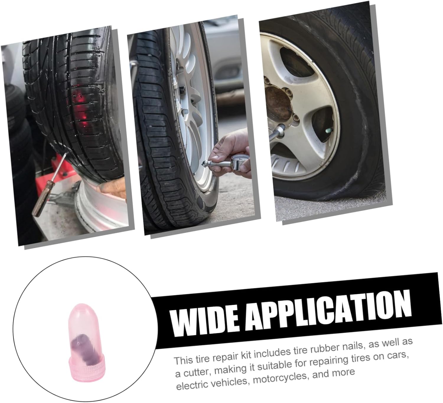 – This tire repair kit includes rubber tire nails as well as a cutter, which makes it suitable for repairing car tires, electric vehicles, motorcycles and more rubber tire nails.