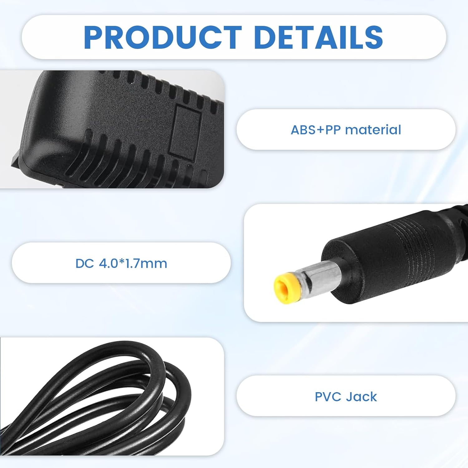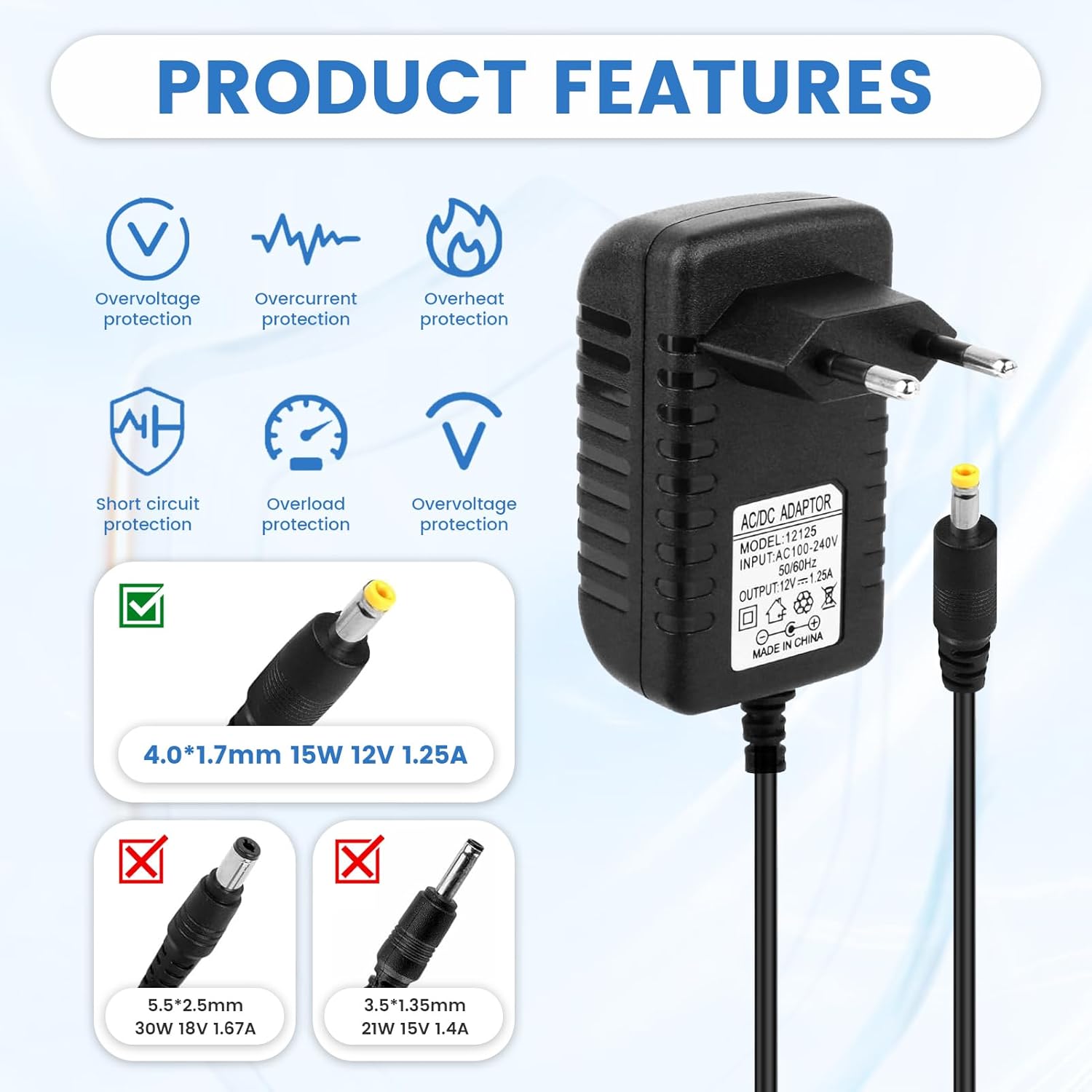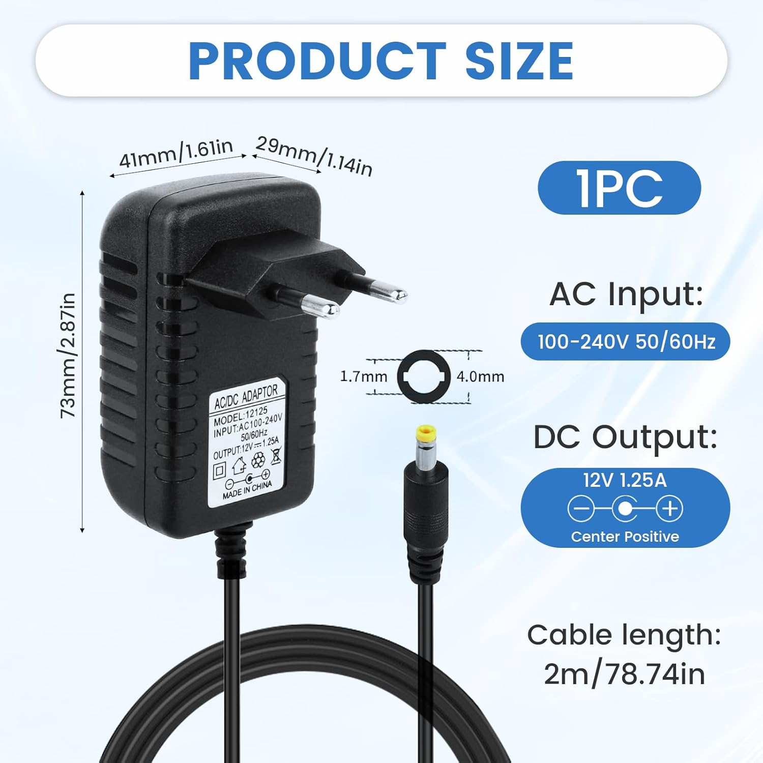 Specifications: Input: 100-240V, 50/60Hz; Output: 12V, 1.25A (15W Max. ); Connector Size: 4 x 1.7mm; Cable length: 2 m. This charger/power adapter ensures stable power and safe charging, reliable for daily use and with optimal power for your devices