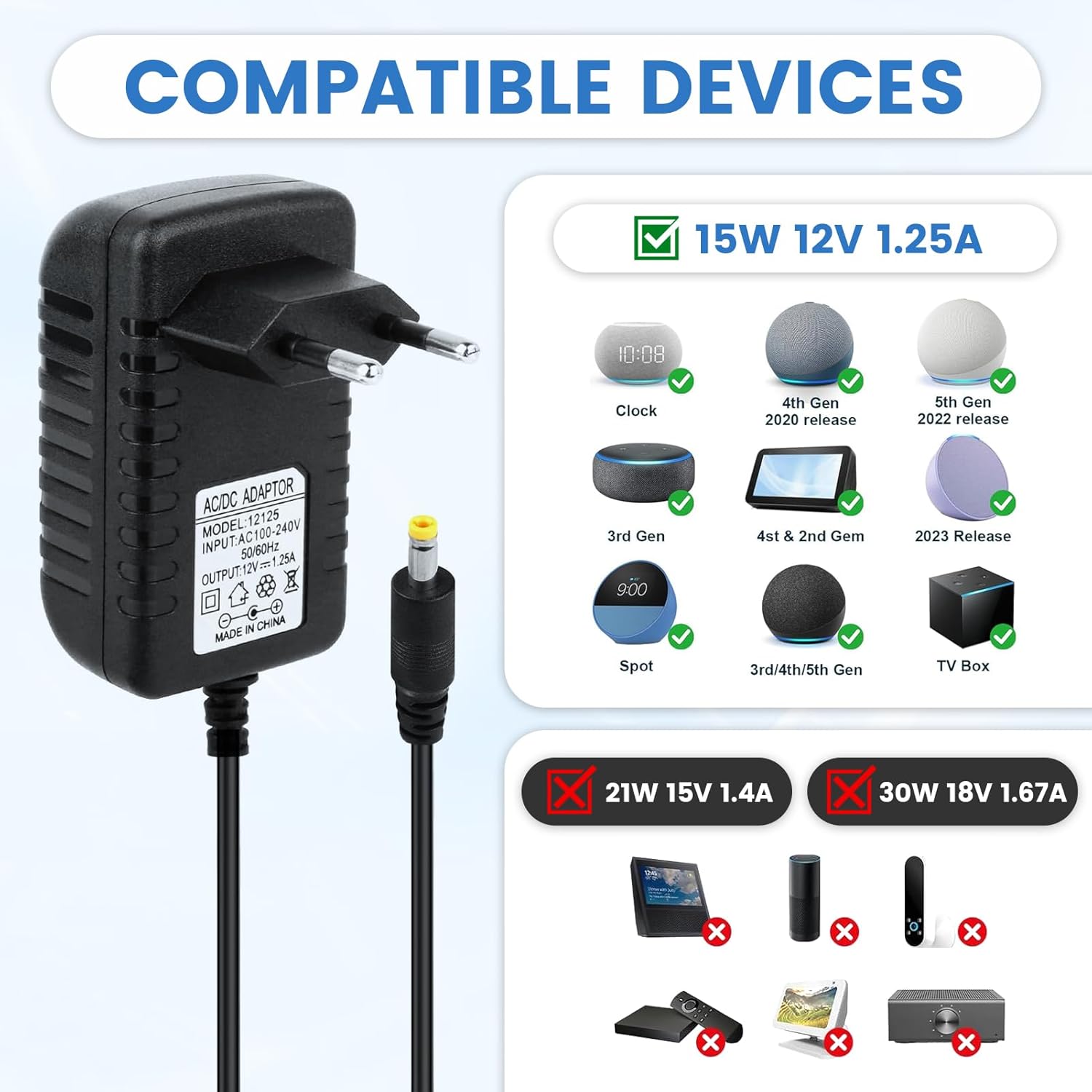 INCOMPATIBLE MODELS – This 15W Alexa charger is NOT compatible with Echo (1st to 4th Gen), Plus, Show 8/10/15, Look, Link, Tap, Fire TV Stick and Fire TV 2nd Generation. Please check the model and voltage (12V) of your device before purchasing to ensure compatibility