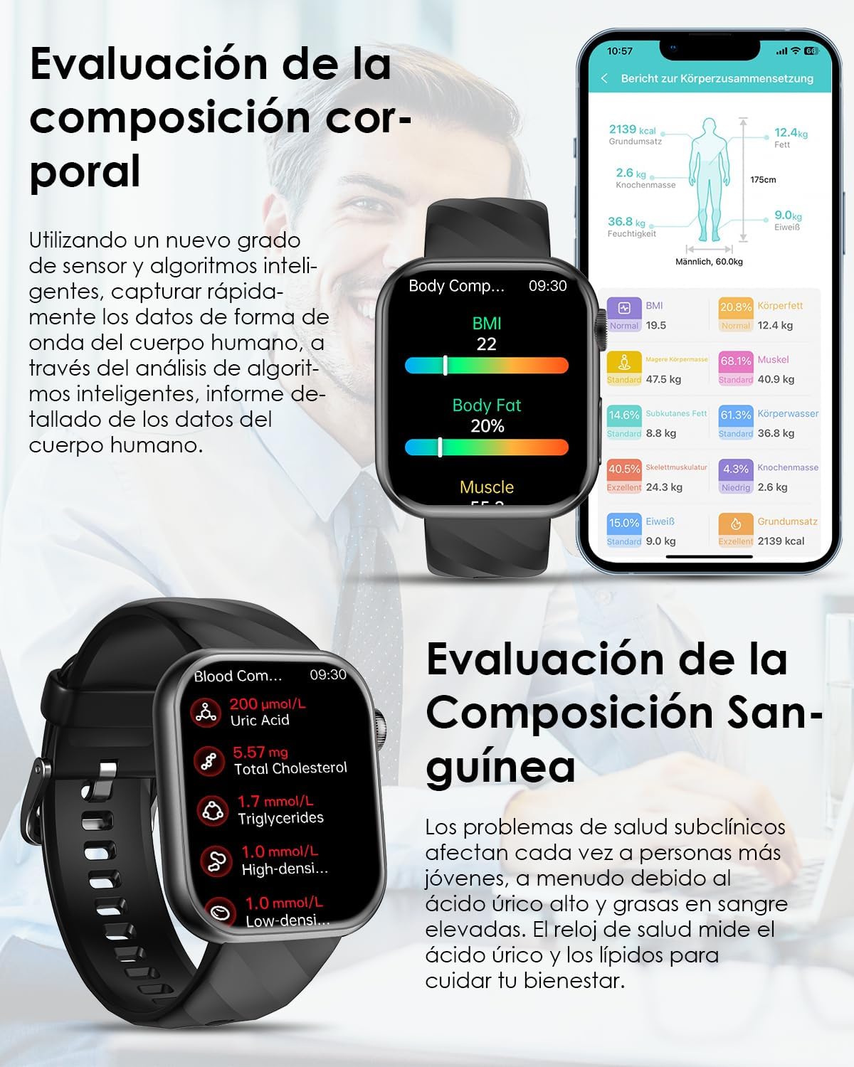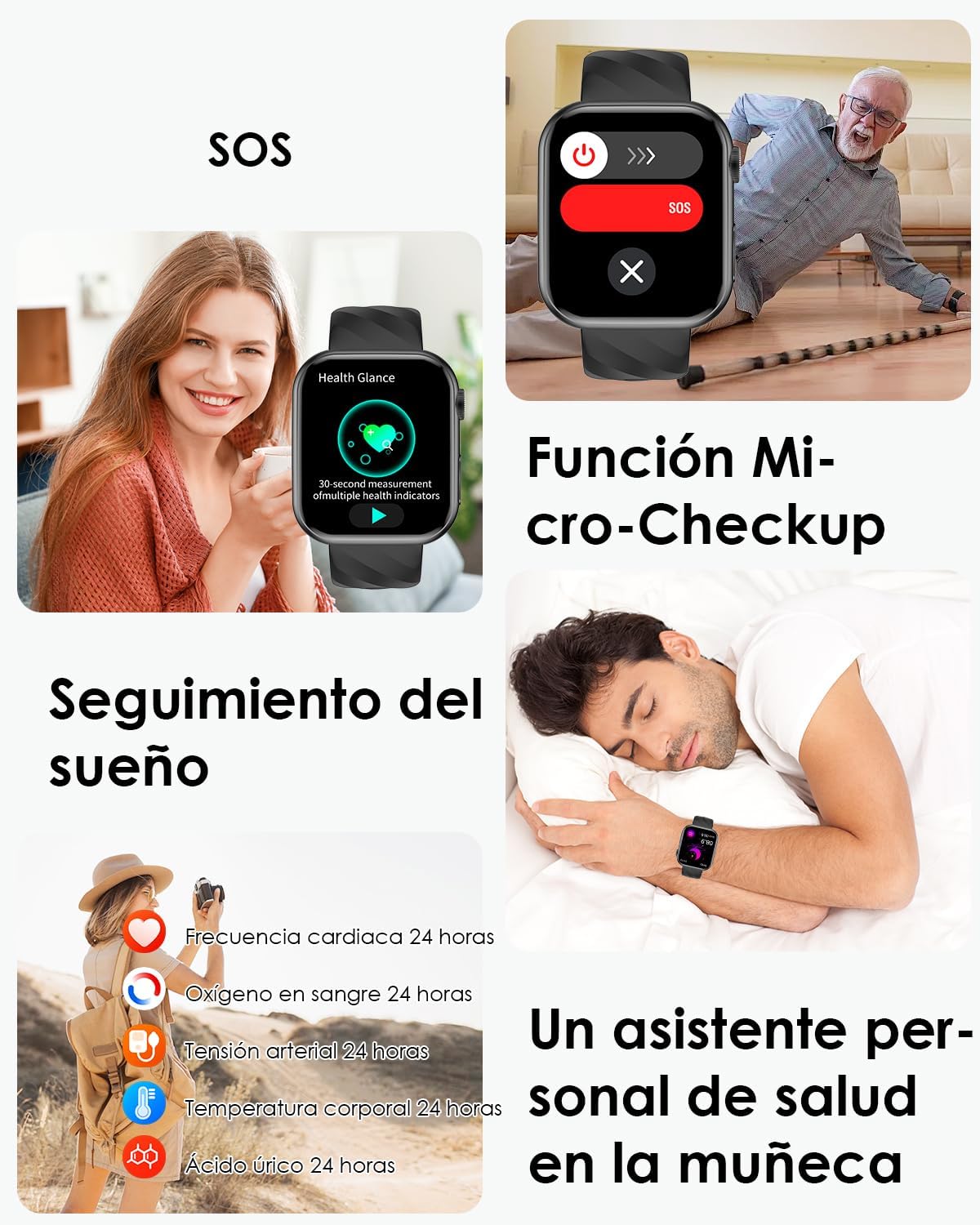 Reloj estupendo, te avisa que bebas agua , las horas de sueño, te toma la tensión ,la glucosa, LPM, puede avisar te si tienes riesgo de miocarditis, arritmias, etc….muy recomendable