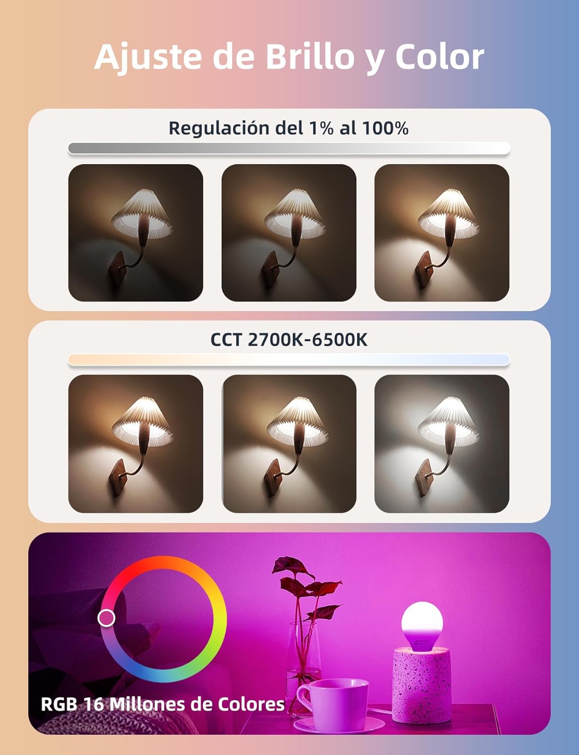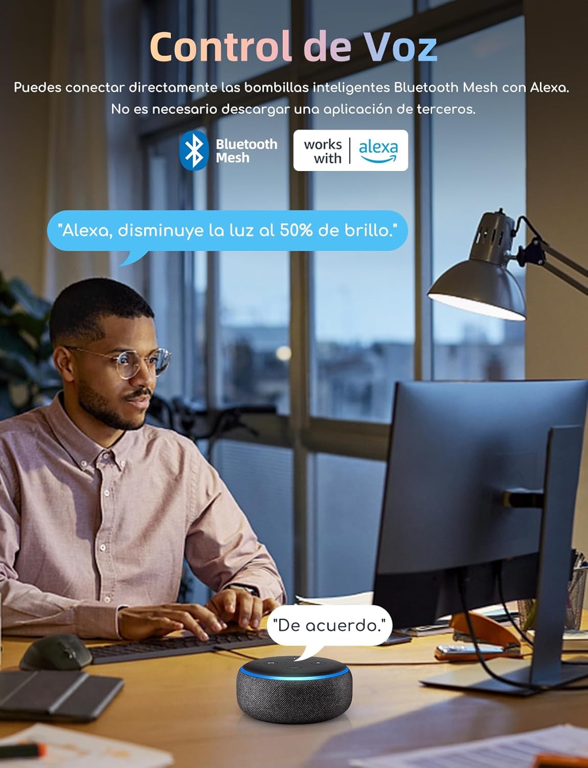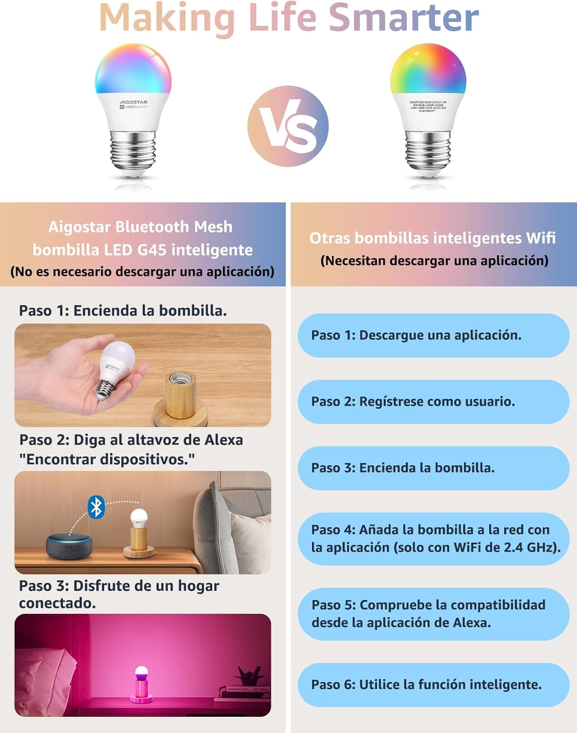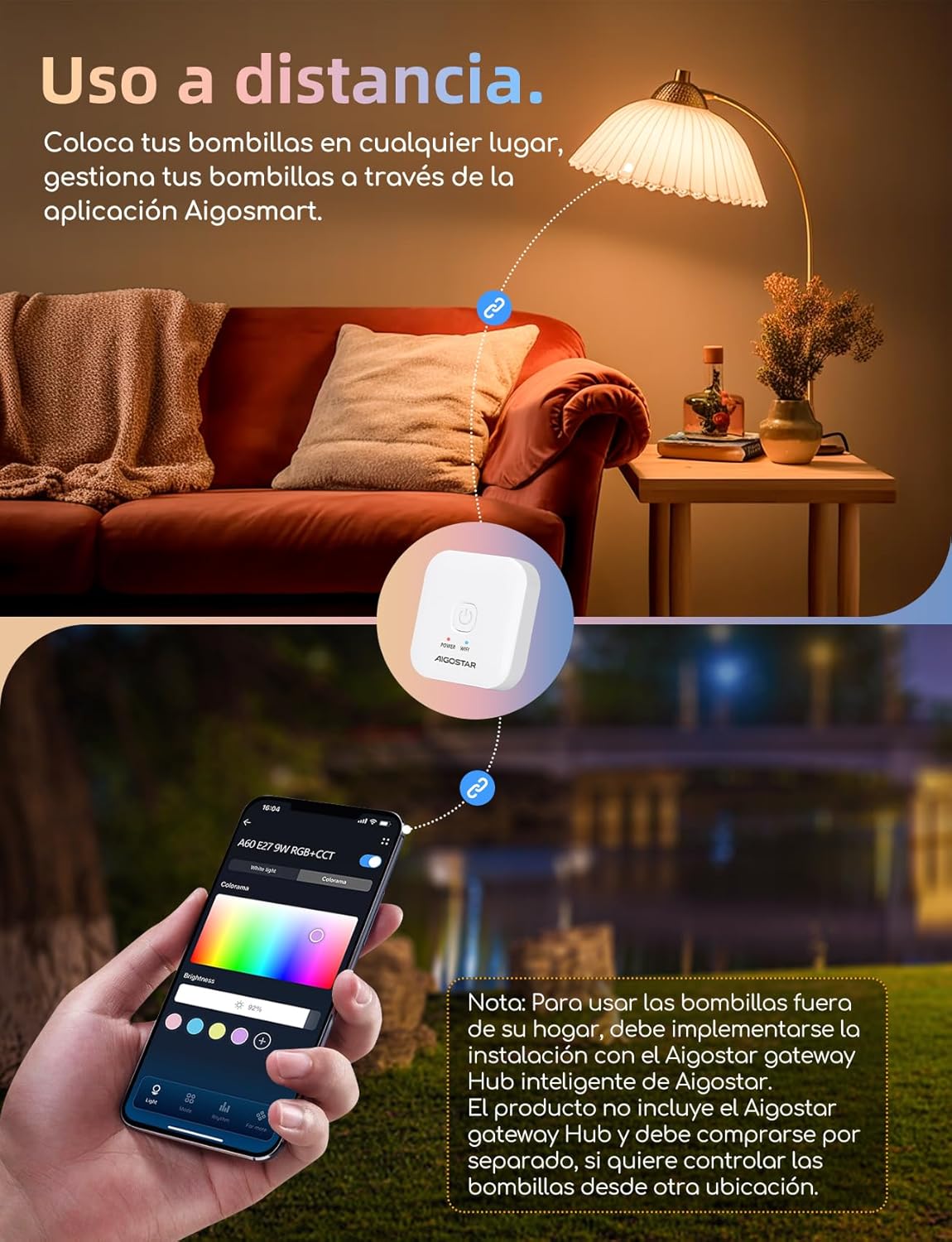 Esta sà que me ha gustado. Creo que ha sido un aciertazo después de tanto investigar bombillas.Yo estaba buscando una con mando a distancia, con RGB, y que tuviera blanco frÃo. Esta tiene todo eso y más.Por 2 € más que otra de marca ILC que probé antes de esta (y que solo tenÃa blanco amarillento de 2700k), tengo 2 bombillas en lugar de una, además tienen no solo un montón de tonos RGB dentro de una paleta* (*en la app / en el mando a distancia solo 6 tonos RGB + 4 programas donde los colores van rotando), sino un montón de tonos también para regular entre blanco cálido y blanco frÃo* (*en la app / en el mando a distancia 4 tonos: 2700K/3200K/4000K/6500K); También por medio de la app tienes 100 niveles para regular la intensidad desde un 1% a un 100% (en el mando a distancia solo 4 niveles). Tiene Bluetooth, puedes controlarlo con la app AigoSmart en tu smartphone, puedes conectarlo a Alexa para encenderlas con órdenes de voz, (que yo la tengo, pero no la uso), o con Google Assistant, además eso de MESH por lo visto quiere decir que se comunican entre ellas, es decir que supongo que pones una de las 2 bombillas más lejos y la que tienes más cerca le manda la señal para que se configure exactamente igual que la que tengas más cerca, como si ella misma fuera también un mando a distancia para con la otra bombilla. Por si quieres usar las 2 en un mismo espacio (Yo la verdad que no lo he probado porque voy a guardar una como repuesto por si algún dÃa esta se me funde, aunque espero que dure mucho). Bueno 2, o 40, o 900 en cadena cada unas más lejos que la anterior, y en cadena con eso del MESH se comunicarÃan entre ellas.Otra función que trae el mando a distancia es la función de encender y apagar por grupos (4 grupos), por si por ejemplo imagÃnate te compras 40 bombillas y quieres encender solo 10 de 1 grupo, o 20 de 2 grupos…En resumen, creo que he comprado la mejor que podrÃa haber comprado de todas, ahora solo espero que me dure mucho.