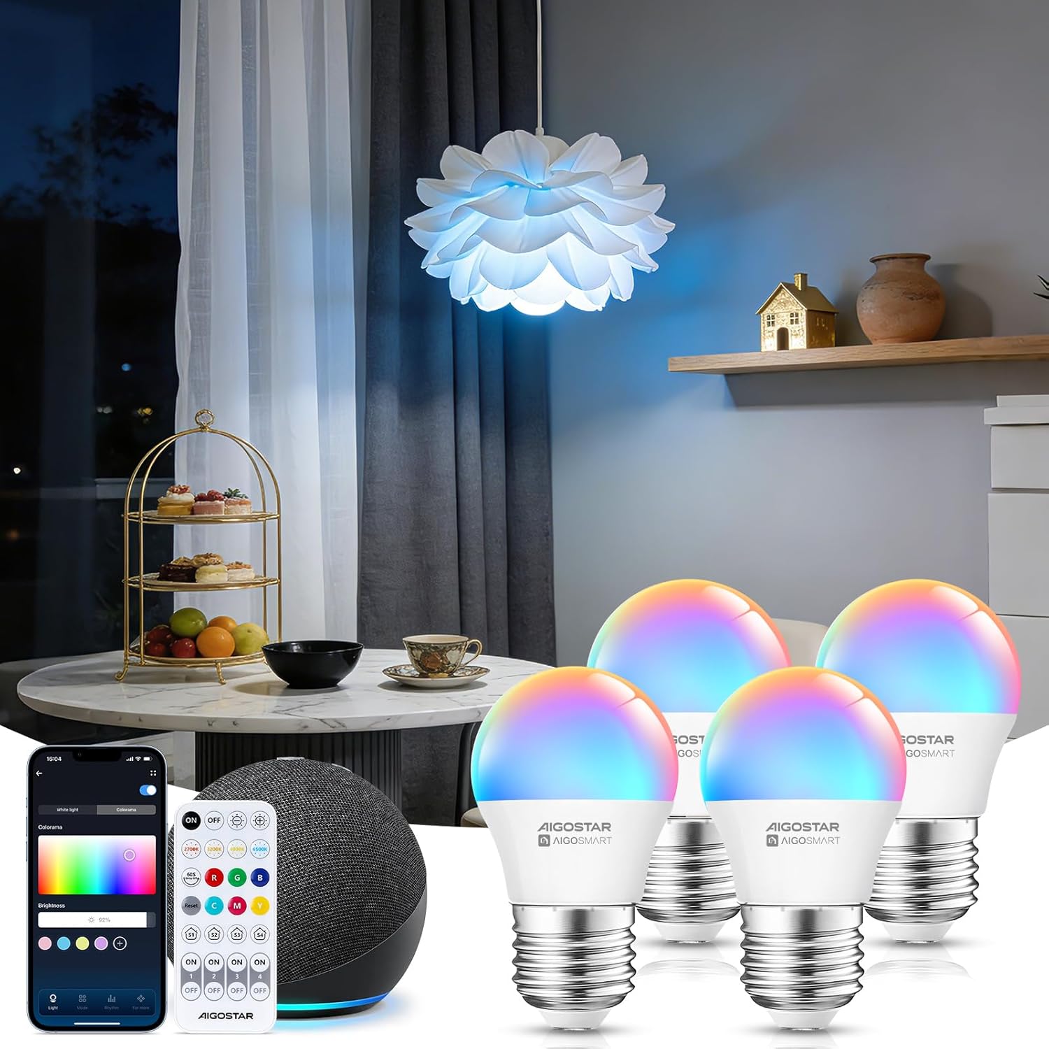 4 Glühbirnen 2700k-5000k E14 RGB, Die Glühbirnen sind Alexa kompatibel. Habe 3 Glühbirnen in einer Gruppe Deckenlicht zugeordnet. Die Glühbirnen lassen sich einzeln und als Gruppe schalten. Verschiedene Farben sind auch einzeln schaltbar und dimmbar.