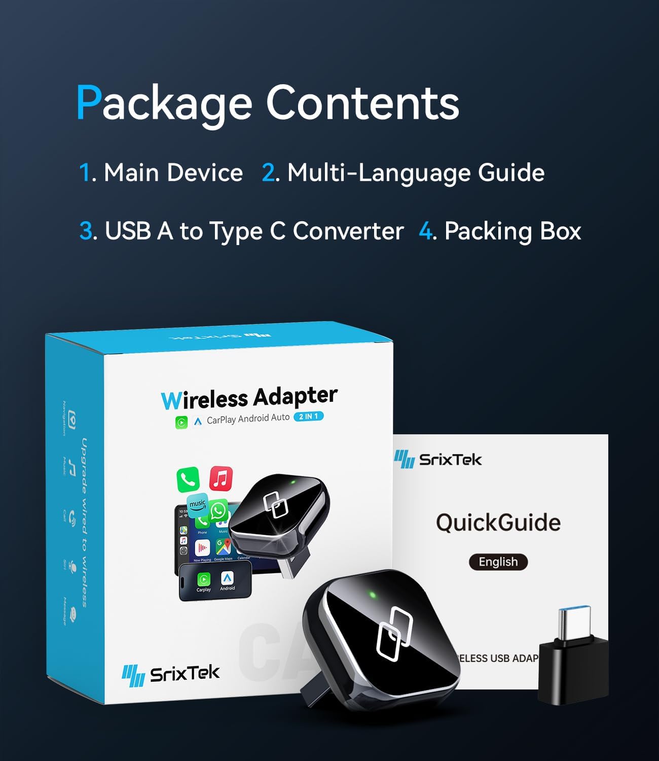 What You Will Get 1 x CarPlay Wireless Adapter, 1 x USB-A Cable, 1 x USB-C Cable, 1 x User Manual. If the wireless CarPlay adapter is damaged when you receive the package, please feel free to contact us by message, we must reply you within 24 hours. If you have any other problem with the item, you can also email us, we are willing to serve you.