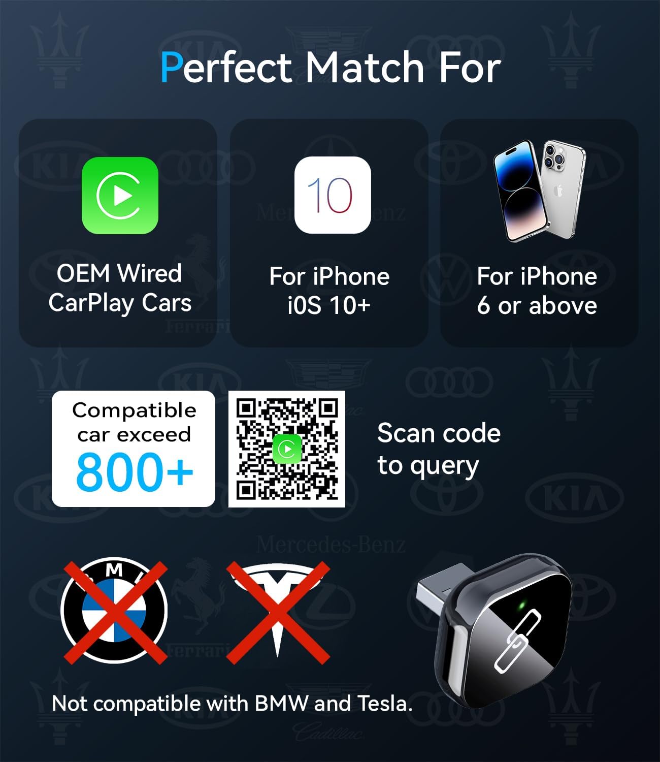 CAR MUST HAVE – Factory Wired USB Wireless CarPlay Adapter – This Bluetooth CarPlay Adapter is a must have for CarPlay equipped vehicles with factory installed cable. Not compatible with cars that lack wired CarPlay support, but works perfectly with 98% of factory systems. Compatible with iPhone running iOS 10 and above, and includes USB-A and USB-C adapters to fit most car USB ports.