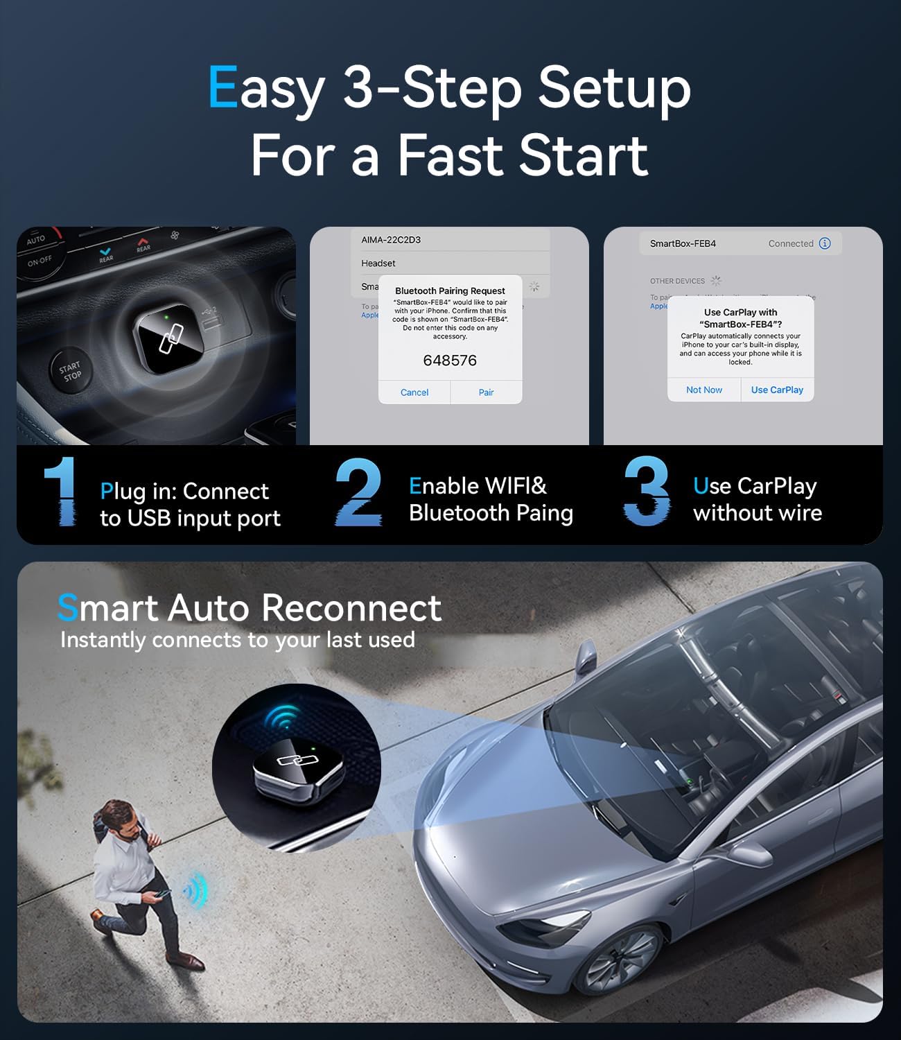 EFFORTLESS SETUP WITH AUTOMATIC RECONNECT – Just plug, pair and play: no apps, no wires, no lags. This wireless CarPlay adapter for iPhone pairs instantly via Bluetooth and connects you in seconds. Once paired, it automatically reconnects every time you start your engine, no need to repeat settings. As a high-speed Bluetooth CarPlay car adapter, it delivers smooth and fast CarPlay performance, ready before your seat belt buckles.