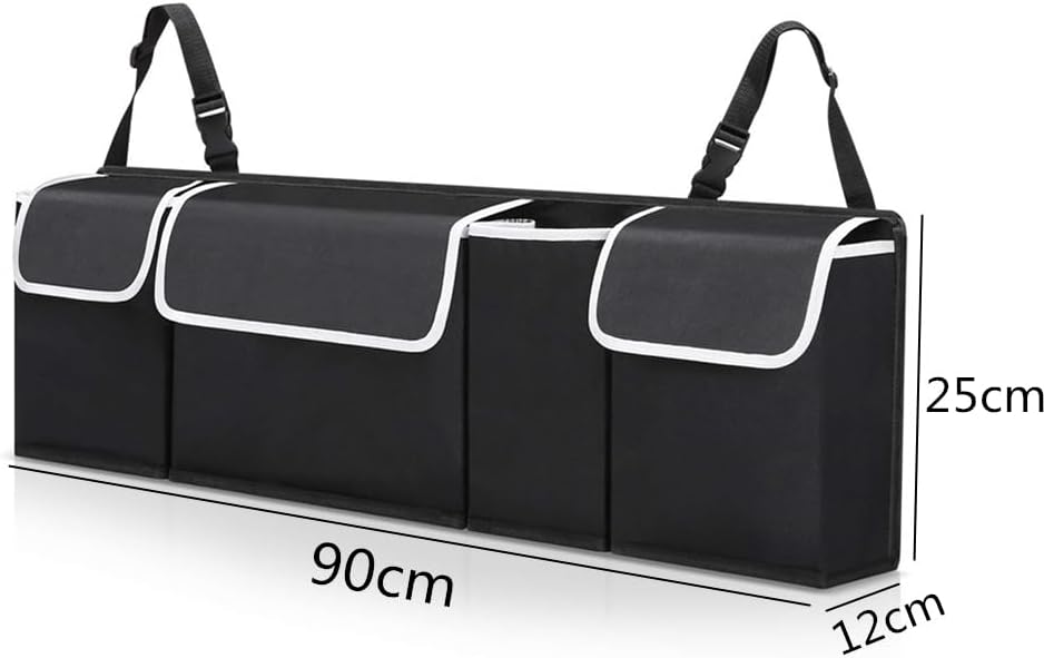 Suitable for most cars: interior car accessories organizer, for most tailgates, dimensions 90cm x 25cm x 12cm, it is large enough, make sure the car seat organizer can be attached to the seat and can cover the backs of the front seats very well, to store your items safe.
