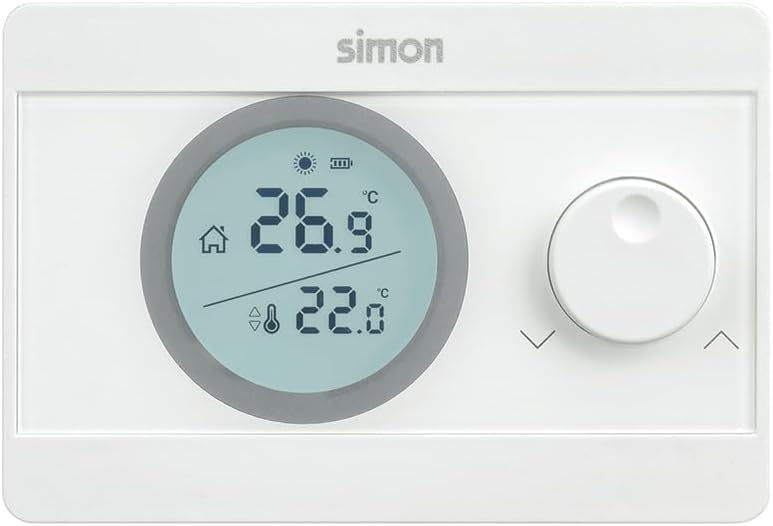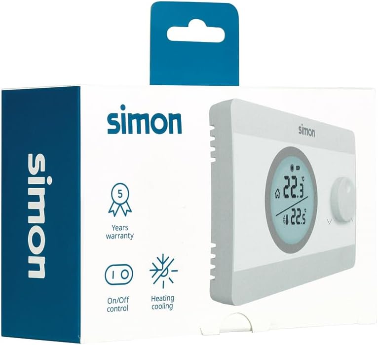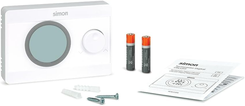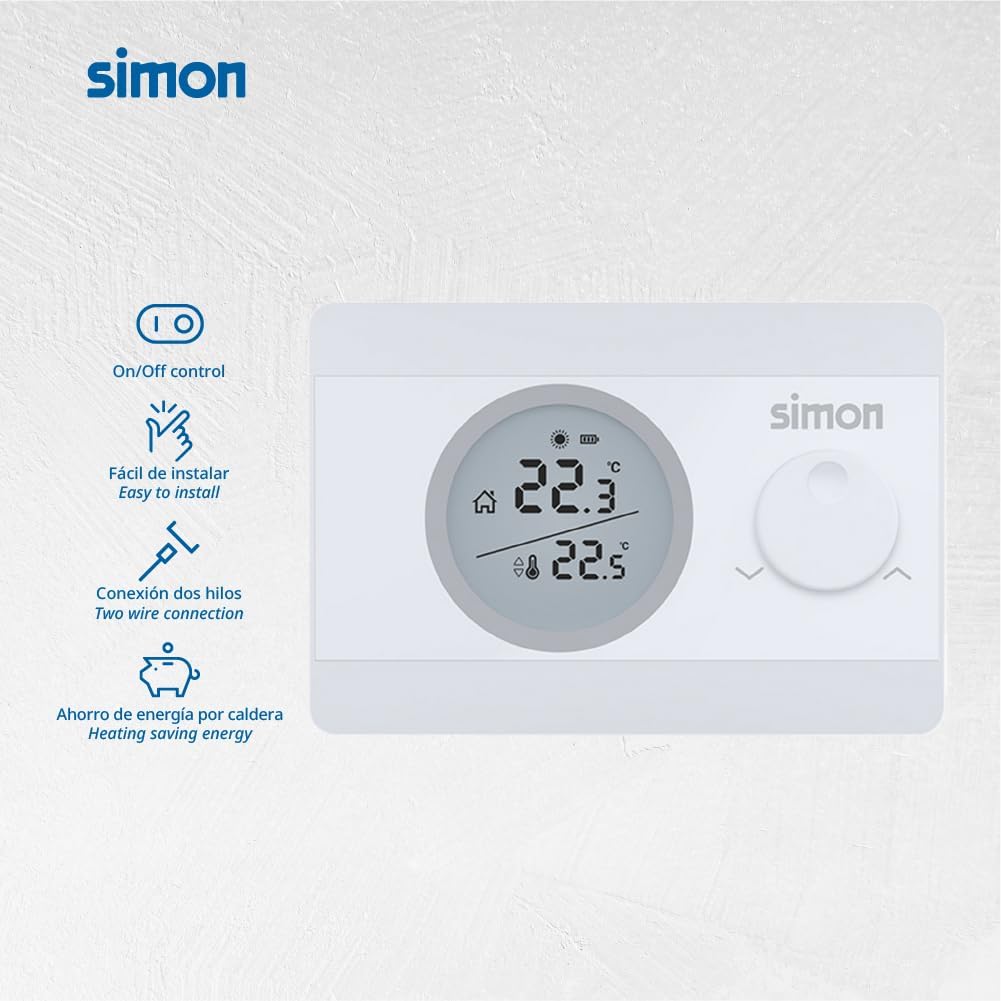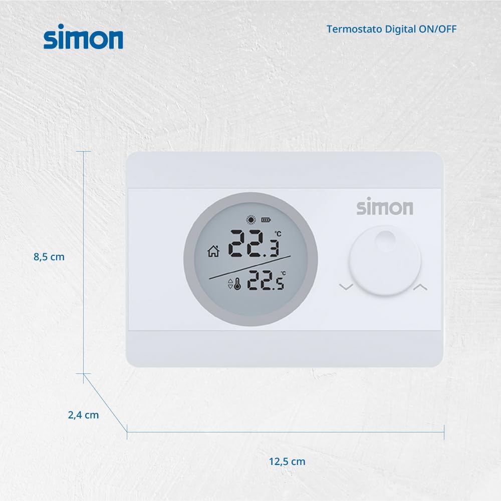 The Simon ON/OFF thermostat is a practical solution for temperature regulation in your home, compatible with both heating and air conditioning systems. This device facilitates the selection of the desired temperature in a range of 5ºC to 30ºC using an adjustment wheel and features a backlit display that improves the display of the selected temperature versus the ambient temperature, the level of charge of the batteries and the operating status of the boiler. In addition, it includes hysteresis adjustment for precise regulation. Powered by 2 AAA batteries, with charge level indicator, the thermostat is easy to install on surface and is available in white.