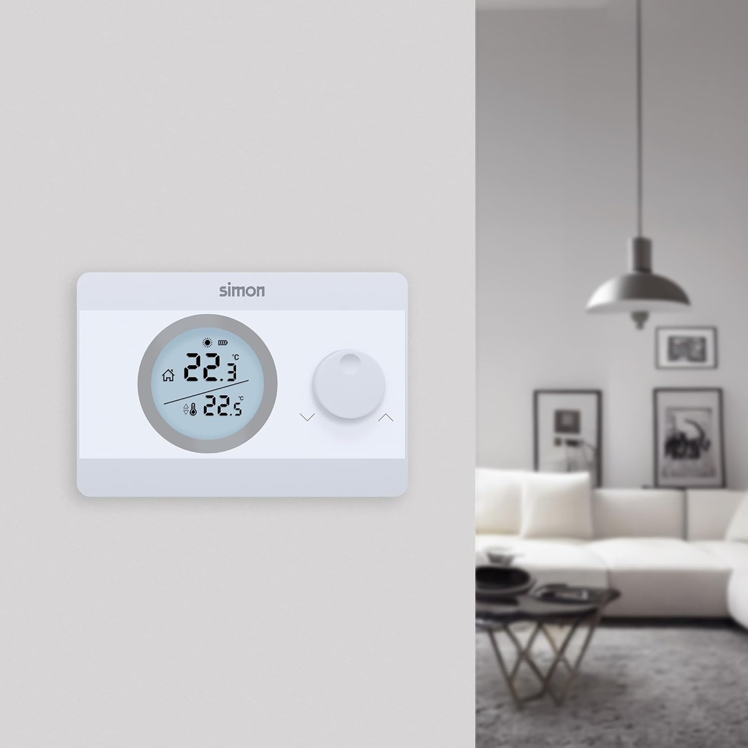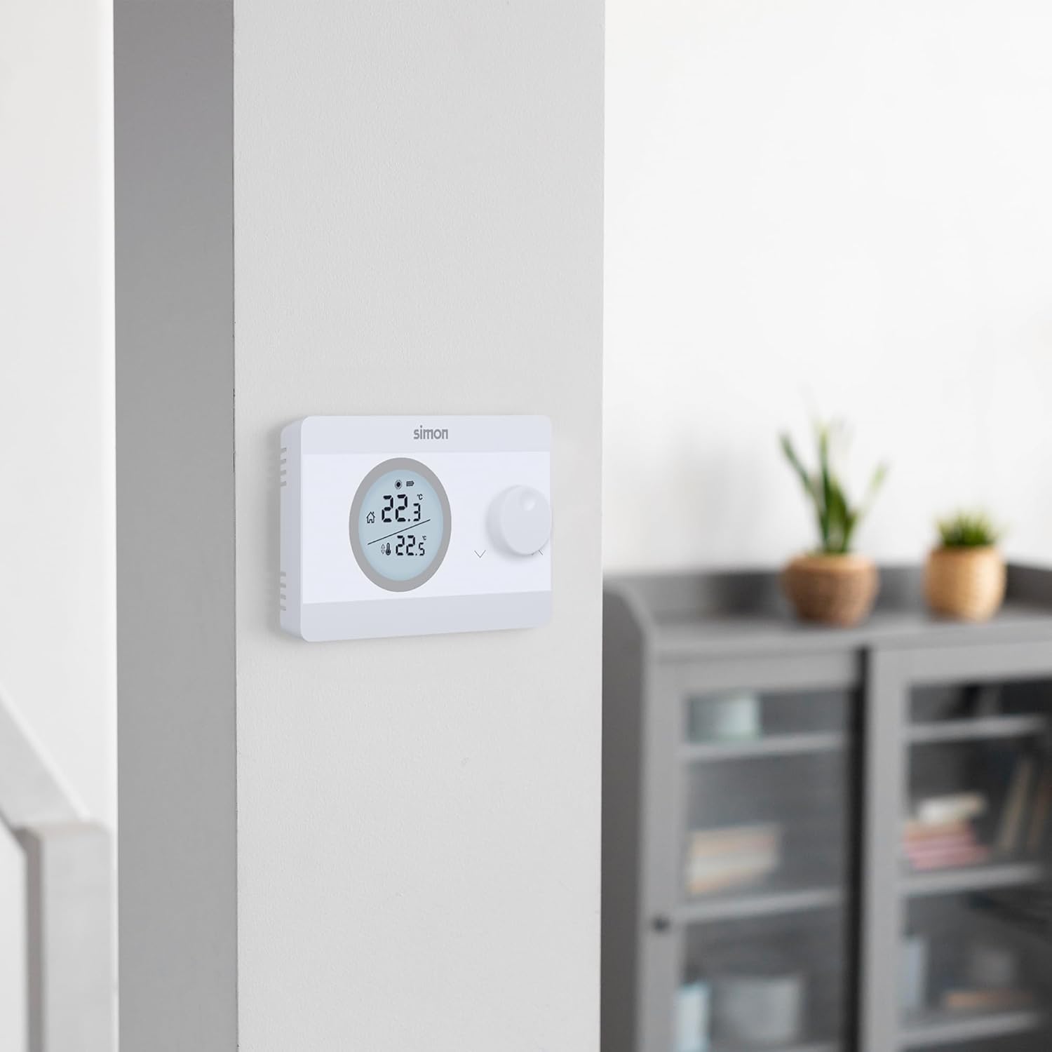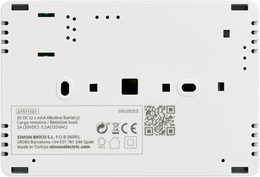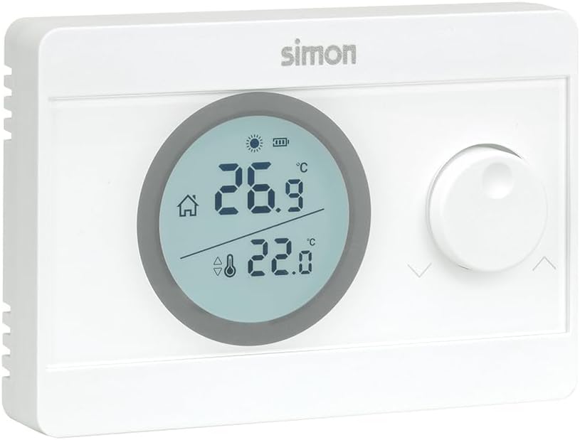 The Simon ON/OFF thermostat is a practical solution for temperature regulation in your home, compatible with both heating and air conditioning systems. This device facilitates the selection of the desired temperature in a range of 5ºC to 30ºC using an adjustment wheel and features a backlit display that improves the display of the selected temperature versus the ambient temperature, the level of charge of the batteries and the operating status of the boiler. In addition, it includes hysteresis adjustment for precise regulation. Powered by 2 AAA batteries, with charge level indicator, the thermostat is easy to install on surface and is available in white.